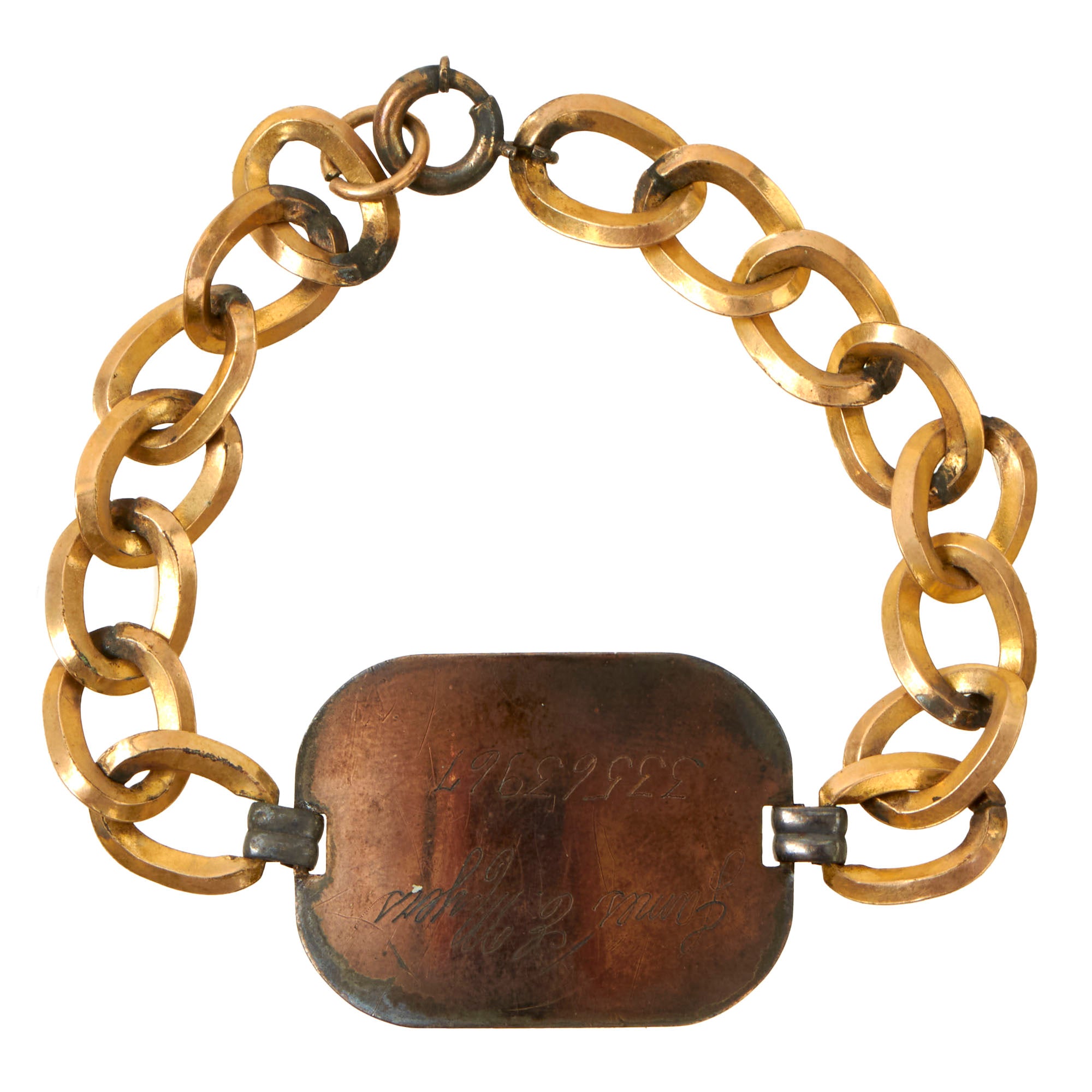 - Meyers’ theater-made identification bracelet reading JAMES E. MEYERS 33563967. Gold-colored chains as the bracelet. Great example.