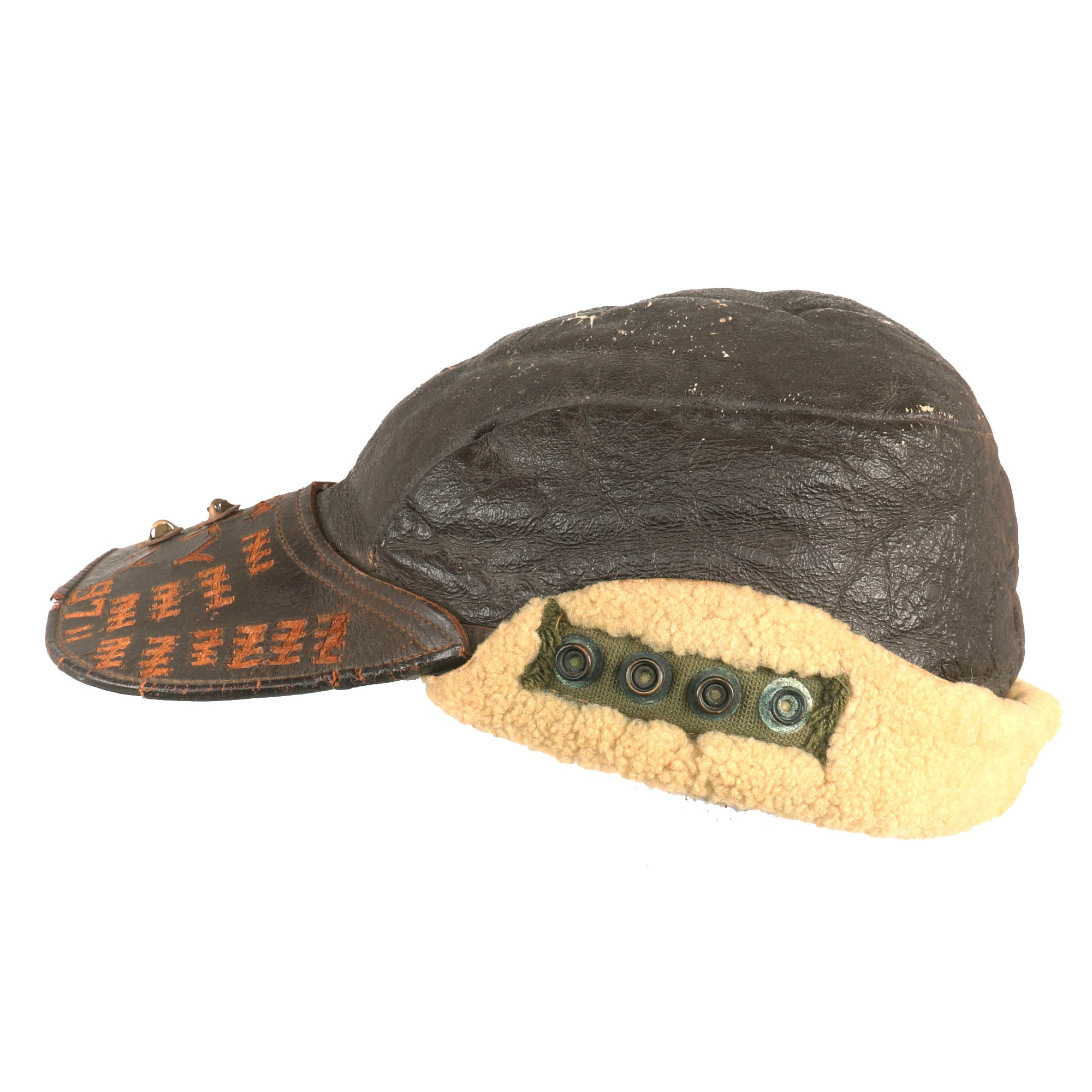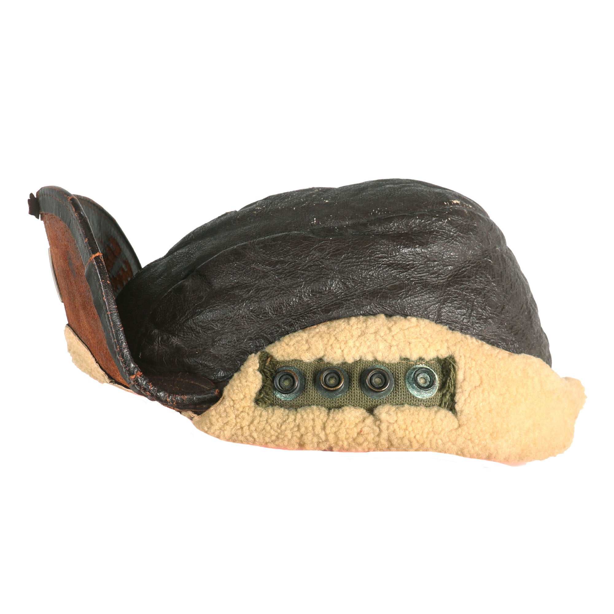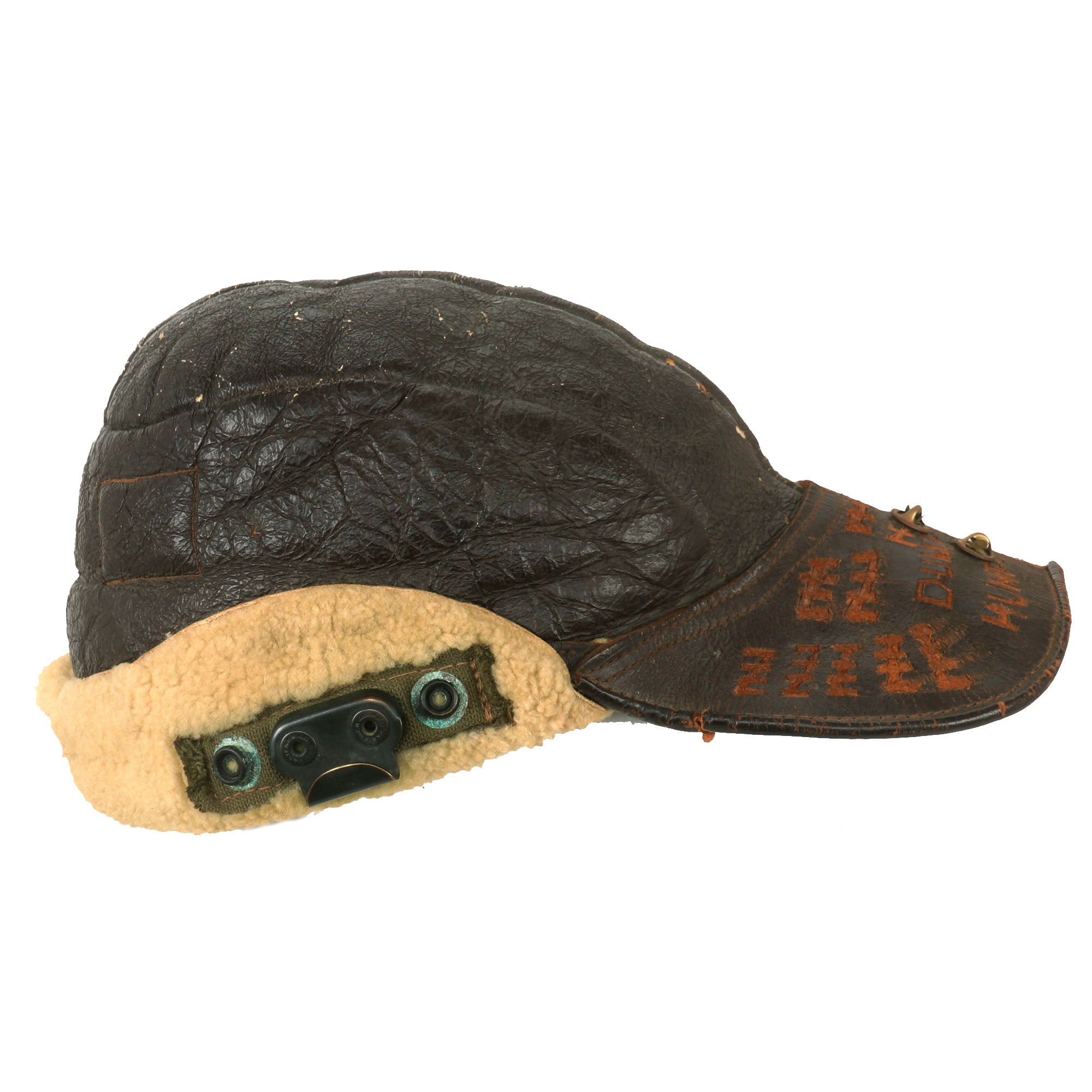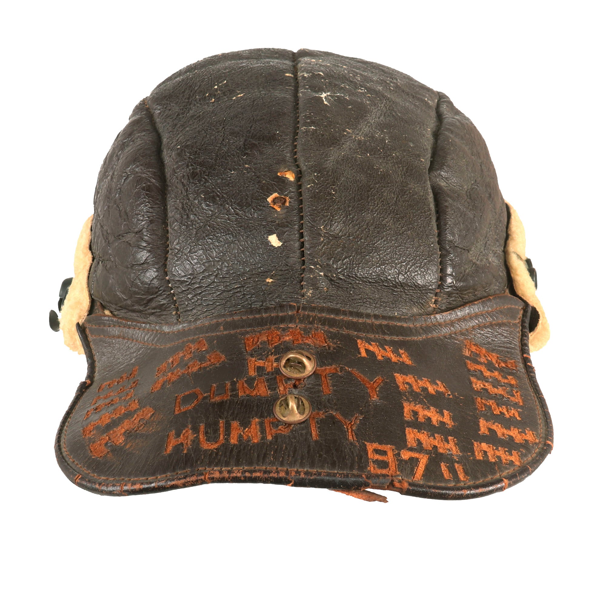 - Personalized B-2 Gunner & Air Crew Shearling Leather Billed Cap: This is a very nice example of the U.S. WWII Army Air Forces B-2 Shearling Leather Billed Cap. The cap is in good condition, with great shearling wool still intact on the inside of the cap, and the correct folded up neck flap, which could be folded down but was not often done. Original Data label still intact. The exterior has some wear to the leather finish, and a few cracks. The pressed paper brim is in good shape. But the most notable features is that the top of the brim has 97 hash marks, signifying his 97 missions flown as well as HUMPTY DUMPTY.