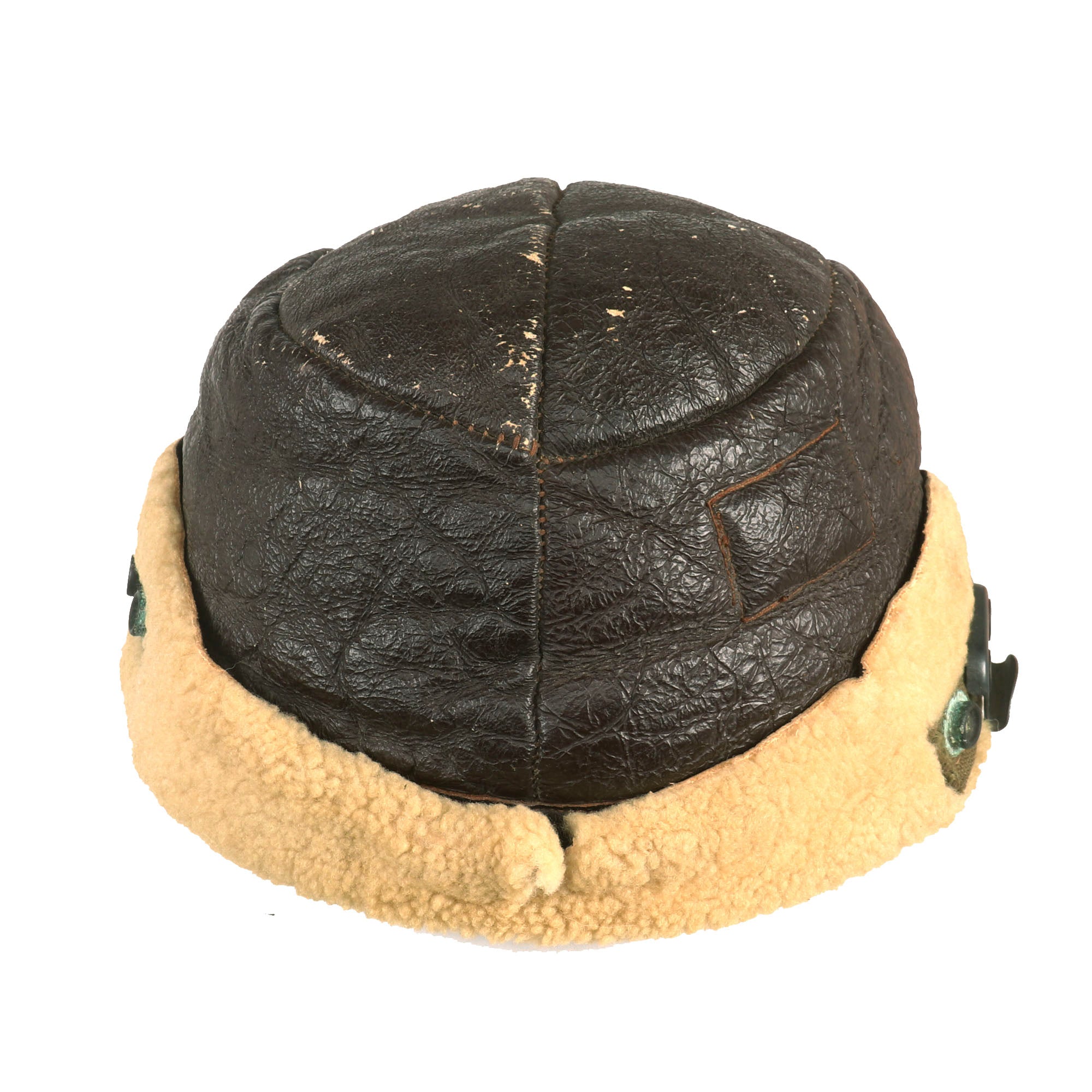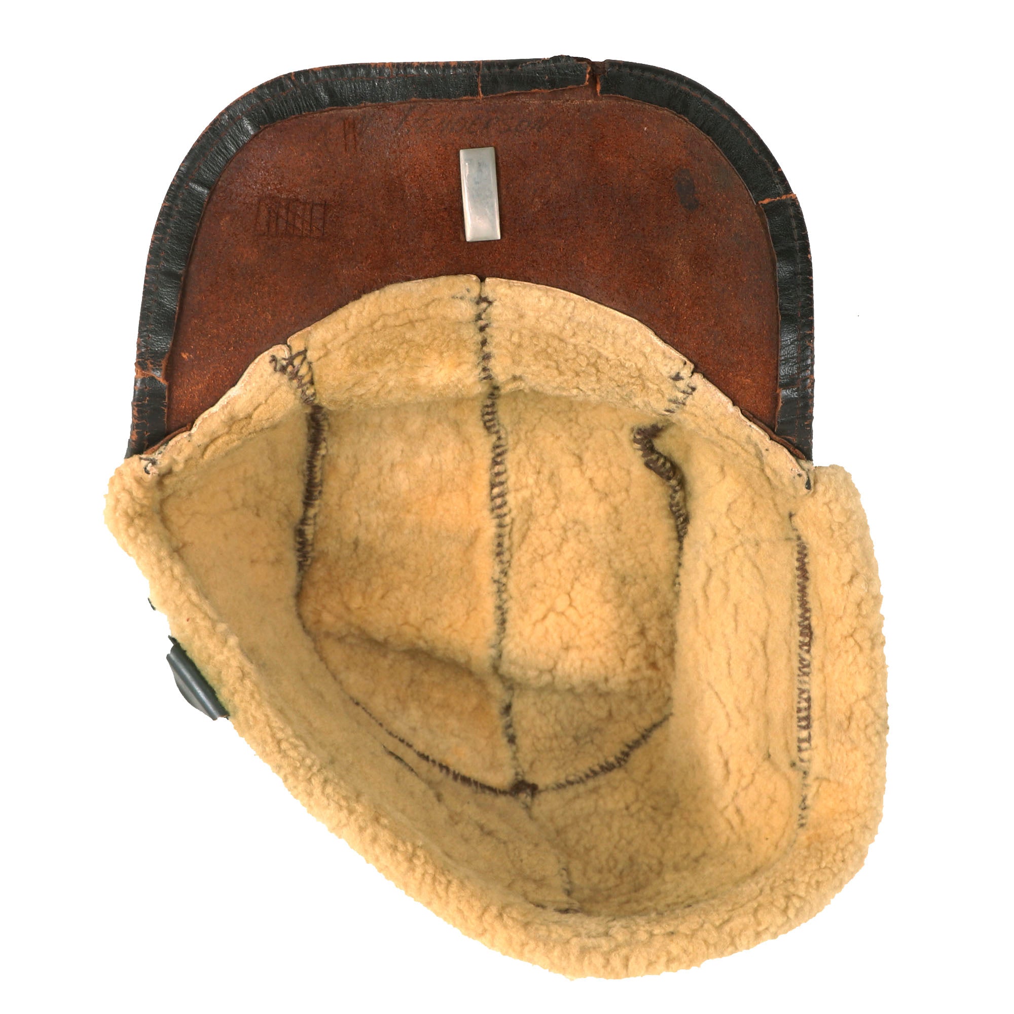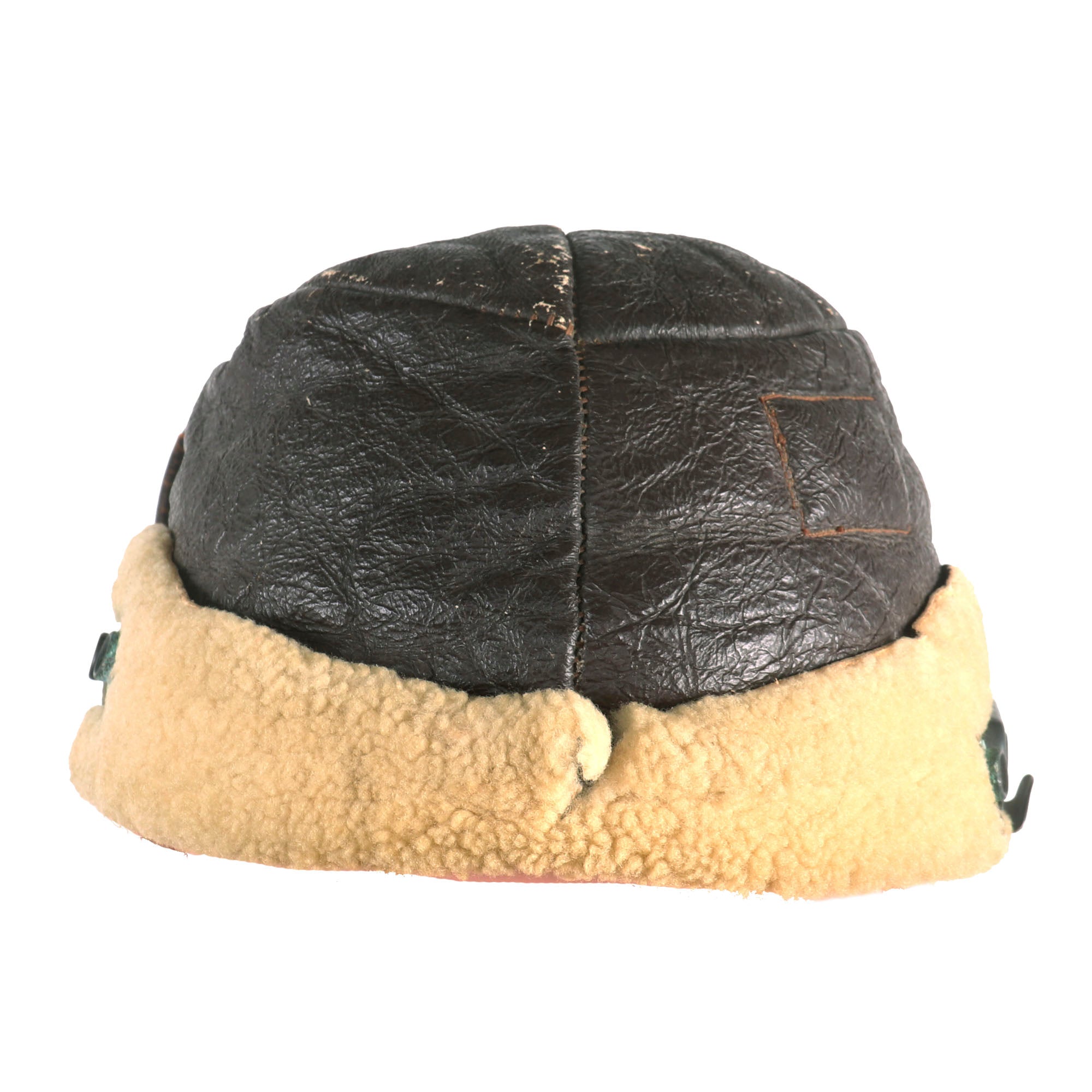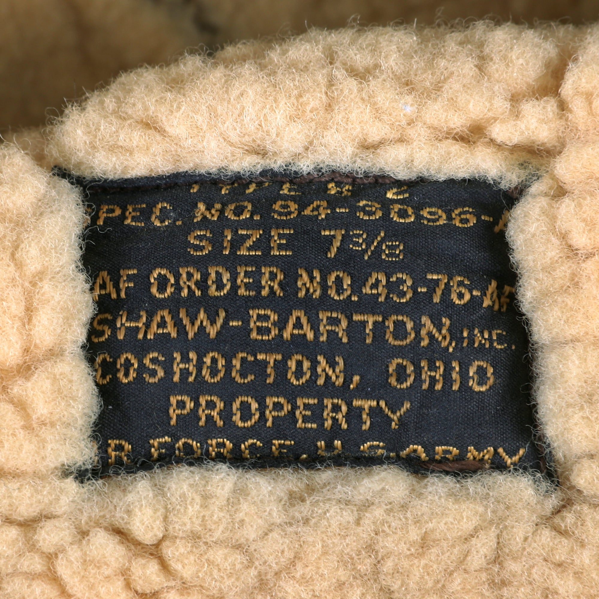 - Personalized B-2 Gunner & Air Crew Shearling Leather Billed Cap: This is a very nice example of the U.S. WWII Army Air Forces B-2 Shearling Leather Billed Cap. The cap is in good condition, with great shearling wool still intact on the inside of the cap, and the correct folded up neck flap, which could be folded down but was not often done. Original Data label still intact. The exterior has some wear to the leather finish, and a few cracks. The pressed paper brim is in good shape. But the most notable features is that the top of the brim has 97 hash marks, signifying his 97 missions flown as well as HUMPTY DUMPTY.
