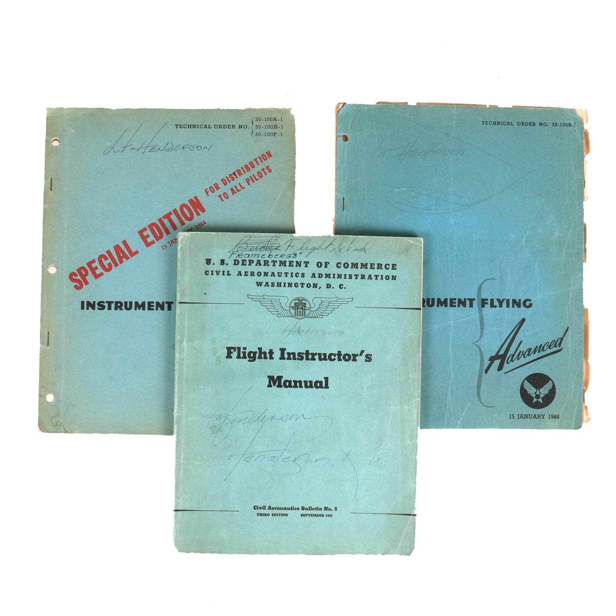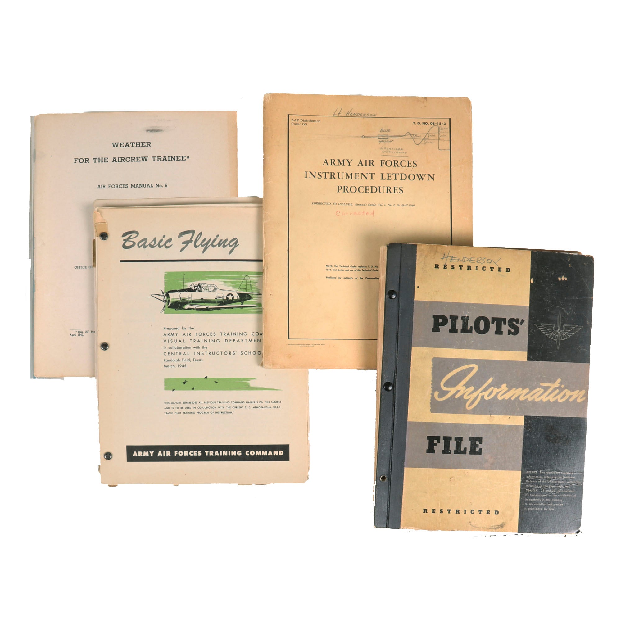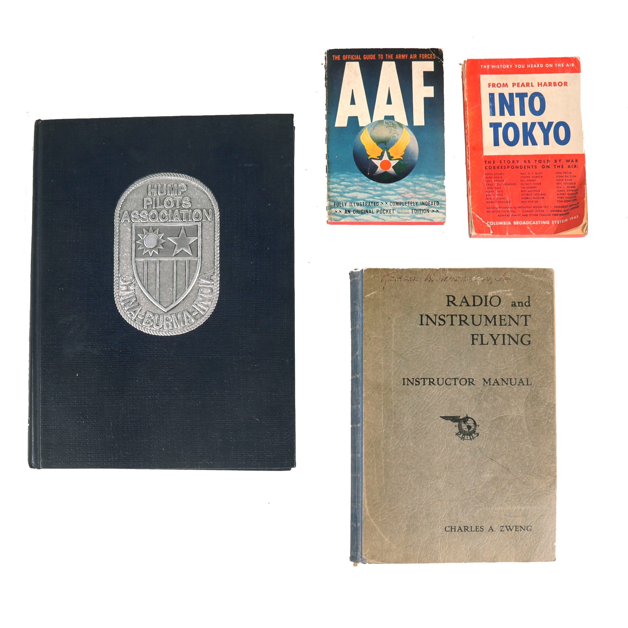 The last few items consist of various flight training manuals and instruments. There is a book in the grouping that was reserved for members of the Hump Pilots Association.