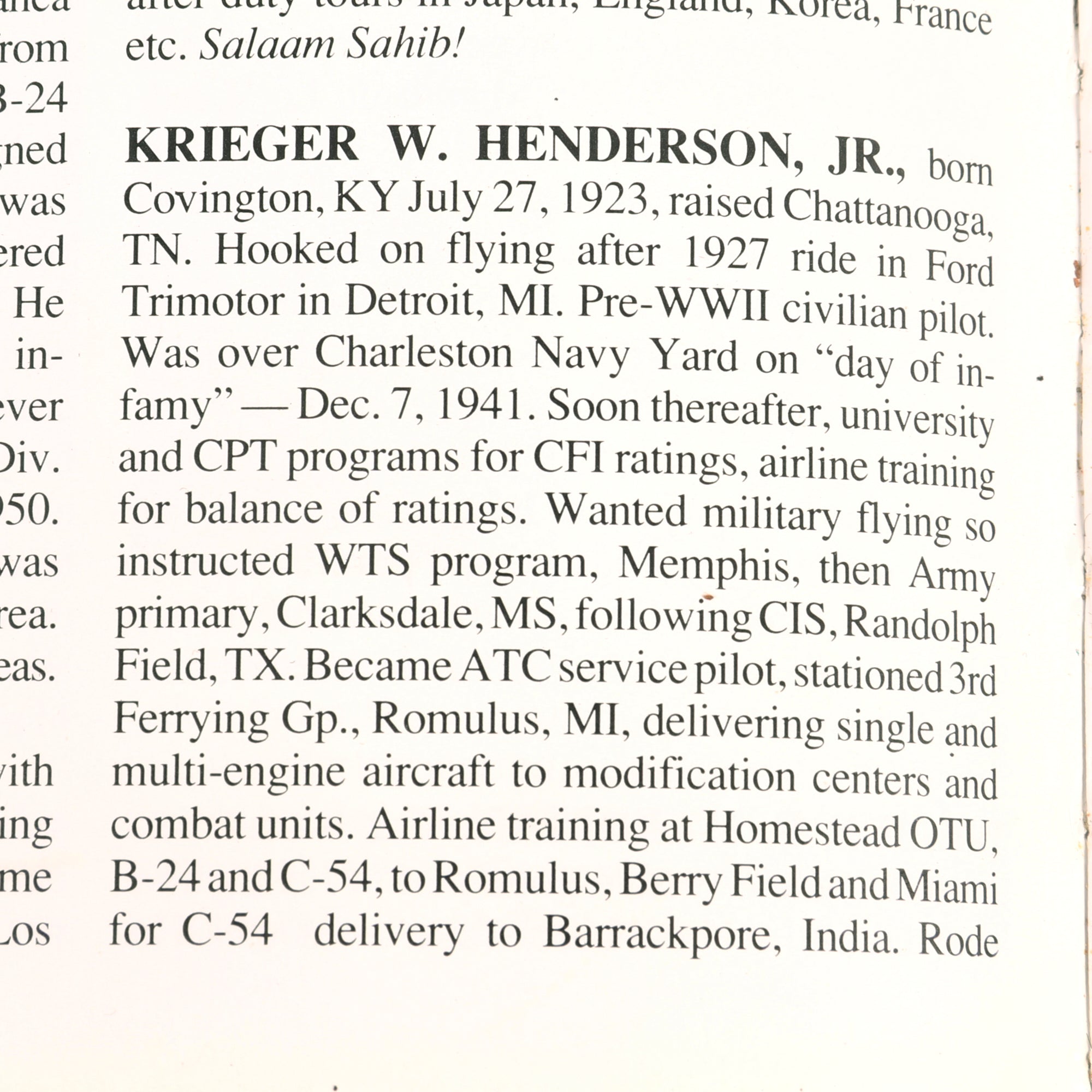 KRIEGER W. HENDERSON, JR., born Covington, KY July 27, 1923, raised Chattanooga, TN. Hooked on flying after 1927 ride in Ford Trimotor in Detroit, MI. Pre-WWII civilian pilot. Was over Charleston Navy Yard on "day of in- famy"-Dec. 7, 1941. Soon thereafter, university and CPT programs for CFI ratings, airline training for balance of ratings. Wanted military flying so instructed WTS program, Memphis, then Army primary, Clarksdale, MS, following CIS, Randolph Field, TX. Became ATC service pilot, stationed 3rd Ferrying Gp., Romulus, MI, delivering single and multi-engine aircraft to modification centers and combat units. Airline training at Homestead OTU, B-24 and C-54, to Romulus, Berry Field and Miami for C-54 delivery to Barrackpore, India. Rode shuttle out of Dum Dum to Tezpur (1327th AAFBU) in wildest ride ever in a C-47, swore we were inverted more than once!