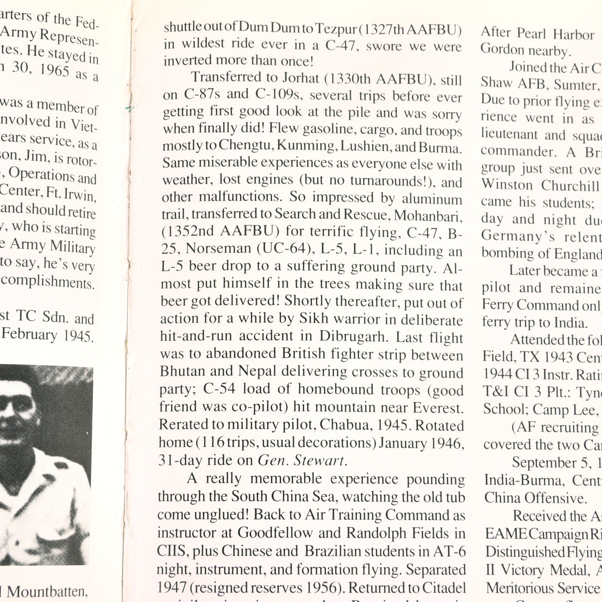 Transferred to Jorhat (1330th AAFBU), still on C-87s and C-109s, several trips before ever getting first good look at the pile and was sorry when finally did! Flew gasoline, cargo, and troops mostly to Chengtu, Kunming, Lushien, and Burma. Same miserable experiences as everyone else with weather, lost engines (but no turnarounds!), and other malfunctions. So impressed by aluminum trail, transferred to Search and Rescue, Mohanbari, (1352nd AAFBU) for terrific flying, C-47, B- 25, Norseman (UC-64), L-5, L-1, including an L-5 beer drop to a suffering ground party. Al- most put himself in the trees making sure that beer got delivered! Shortly thereafter, put out of action for a while by Sikh warrior in deliberate hit-and-run accident in Dibrugarh. Last flight was to abandoned British fighter strip between Bhutan and Nepal delivering crosses to ground party; C-54 load of homebound troops (good friend was co-pilot) hit mountain near Everest. Rerated to military pilot, Chabua, 1945. Rotated home (116 trips, usual decorations) January 1946, 31-day ride on Gen. Stewart.
