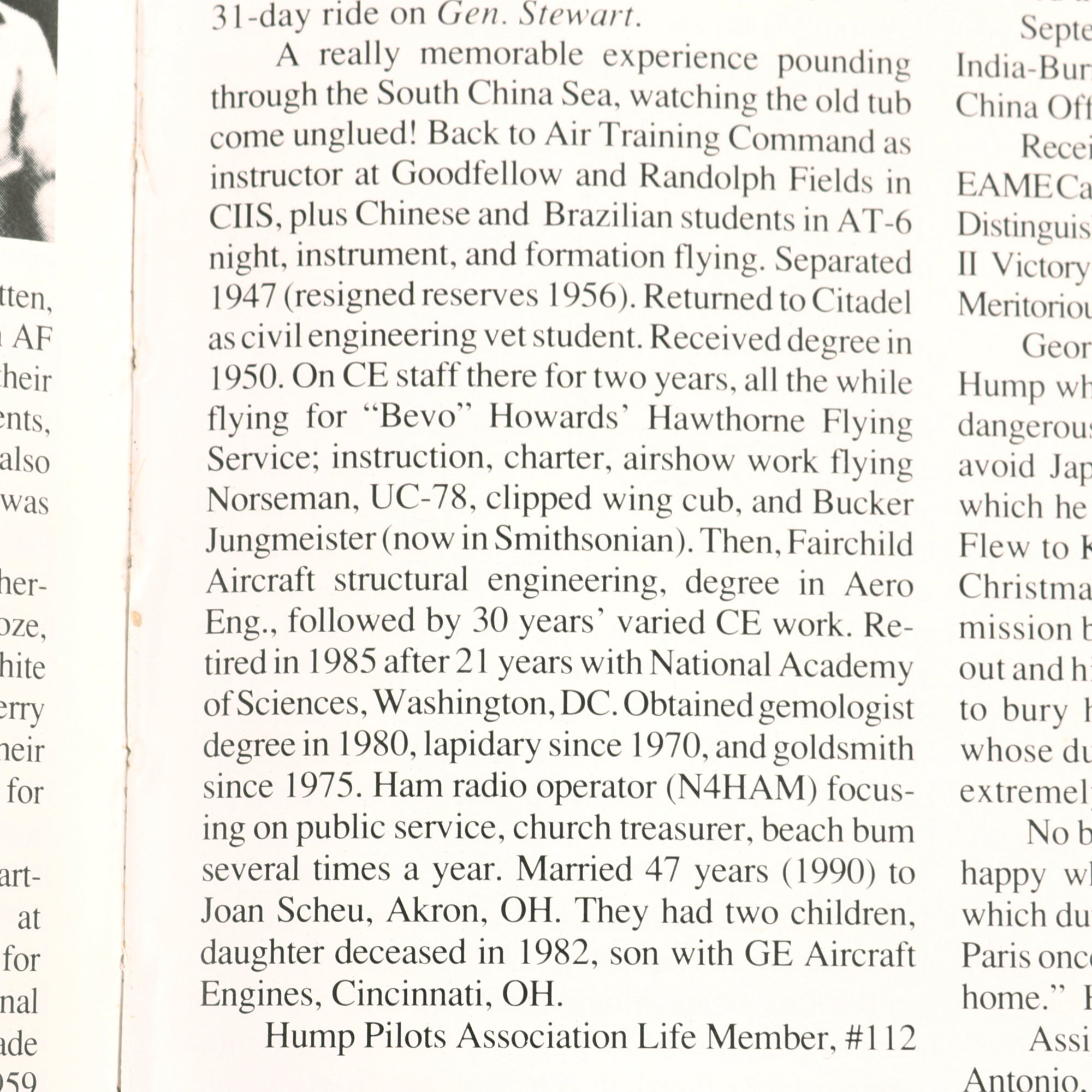 A really memorable experience pounding through the South China Sea, watching the old tub come unglued! Back to Air Training Command as instructor at Goodfellow and Randolph Fields in CIIS, plus Chinese and Brazilian students in AT-6 night, instrument, and formation flying. Separated 1947 (resigned reserves 1956). Returned to Citadel as civil engineering vet student. Received degree in 1950. On CE staff there for two years, all the while flying for "Bevo" Howards' Hawthorne Flying Service; instruction, charter, airshow work flying Norseman, UC-78, clipped wing cub, and Bucker Jungmeister (now in Smithsonian). Then, Fairchild Aircraft structural engineering, degree in Aero Eng., followed by 30 years' varied CE work. Retired in 1985 after 21 years with the National Academy of Sciences, Washington, DC. Obtained gemologist degree in 1980, lapidary since 1970, and goldsmith since 1975. Ham radio operator (N4HAM) focusing on public service, church treasurer, beach bum several times a year. Married 47 years (1990) to Joan Scheu, Akron, OH. They had two children, daughter deceased in 1982, son with GE Aircraft Engines, Cincinnati, OH.