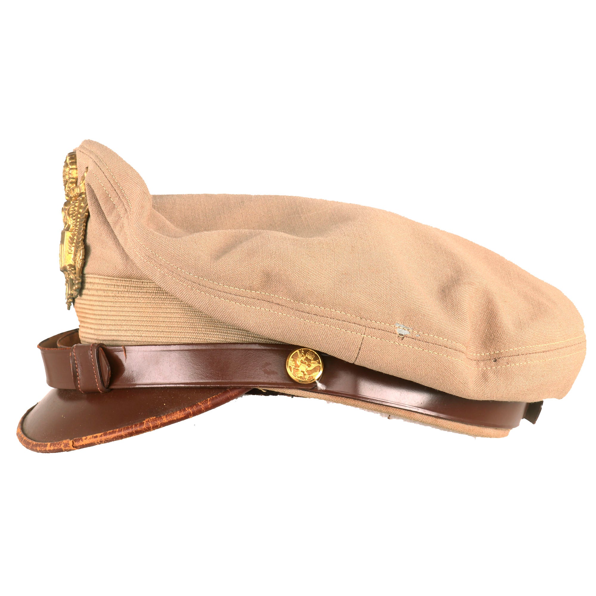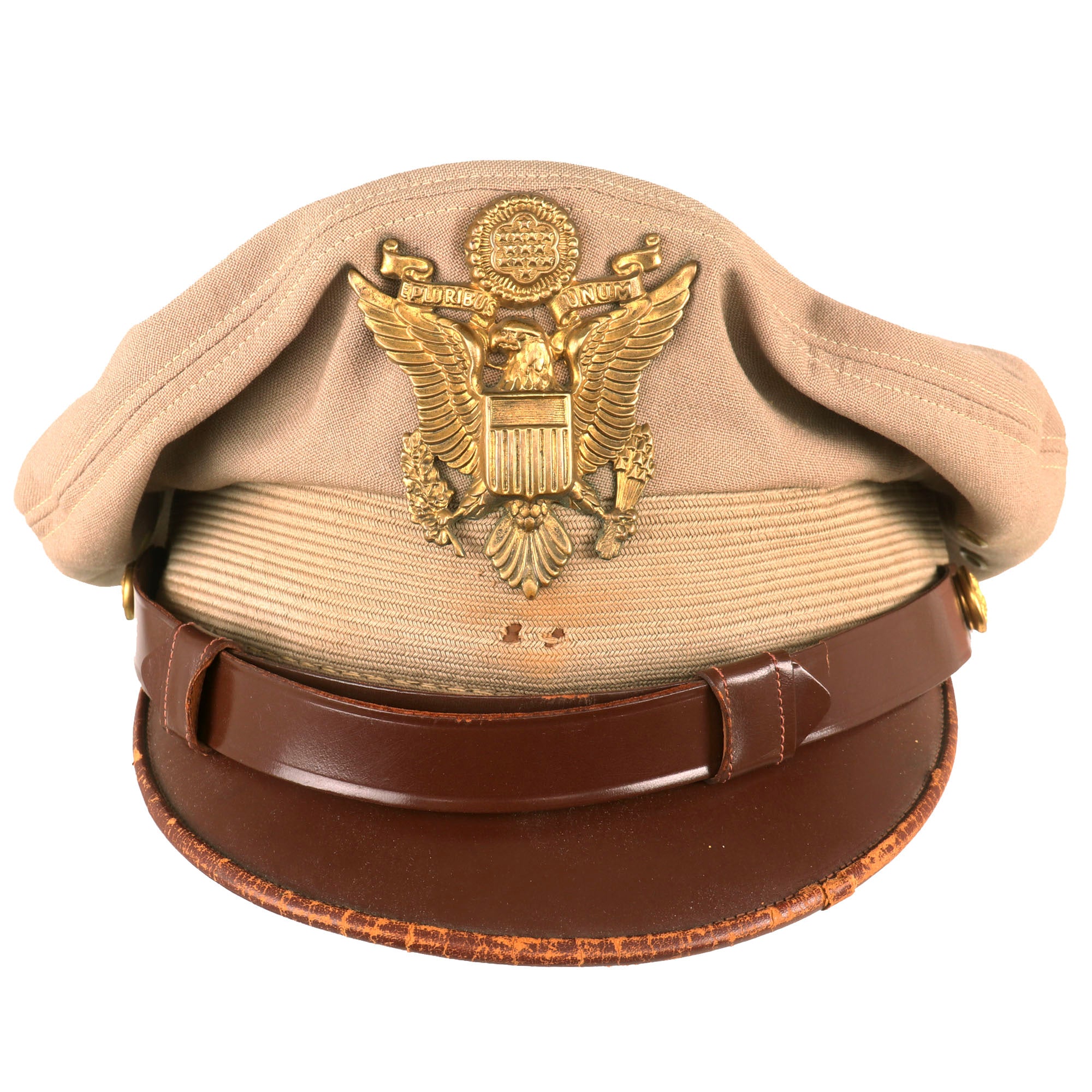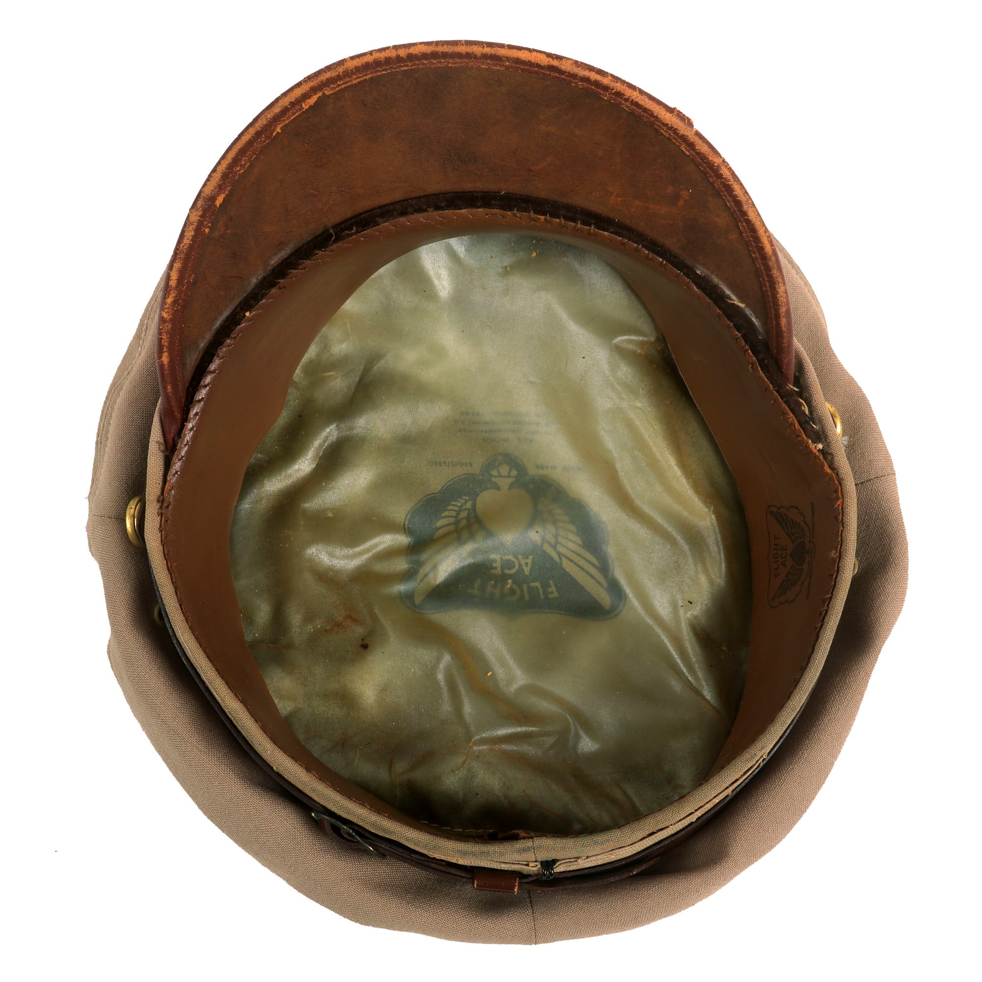 - Crusher Cap: One of the most iconic pieces of headgear to come out of WWII was the U.S. Crusher Cap, or “Fifty Mission Cap”. This visor cap, in “Summer Khaki” issue color. The outward appearance is extremely worn from honest use, and decades of storage wear. It retains the original iconic "crush" shape. The cap was certainly used and is a bit misshapen from long storage, However, with some effort and form fitting it will come back to form. The visor portion is very worn, partially detached and stained. The leather adjustment strap on the back and the leather chinstrap on the front are in solid condition. The cap bears the “FLIGHT ACE” markings on both the top of the cap and the sweatband.