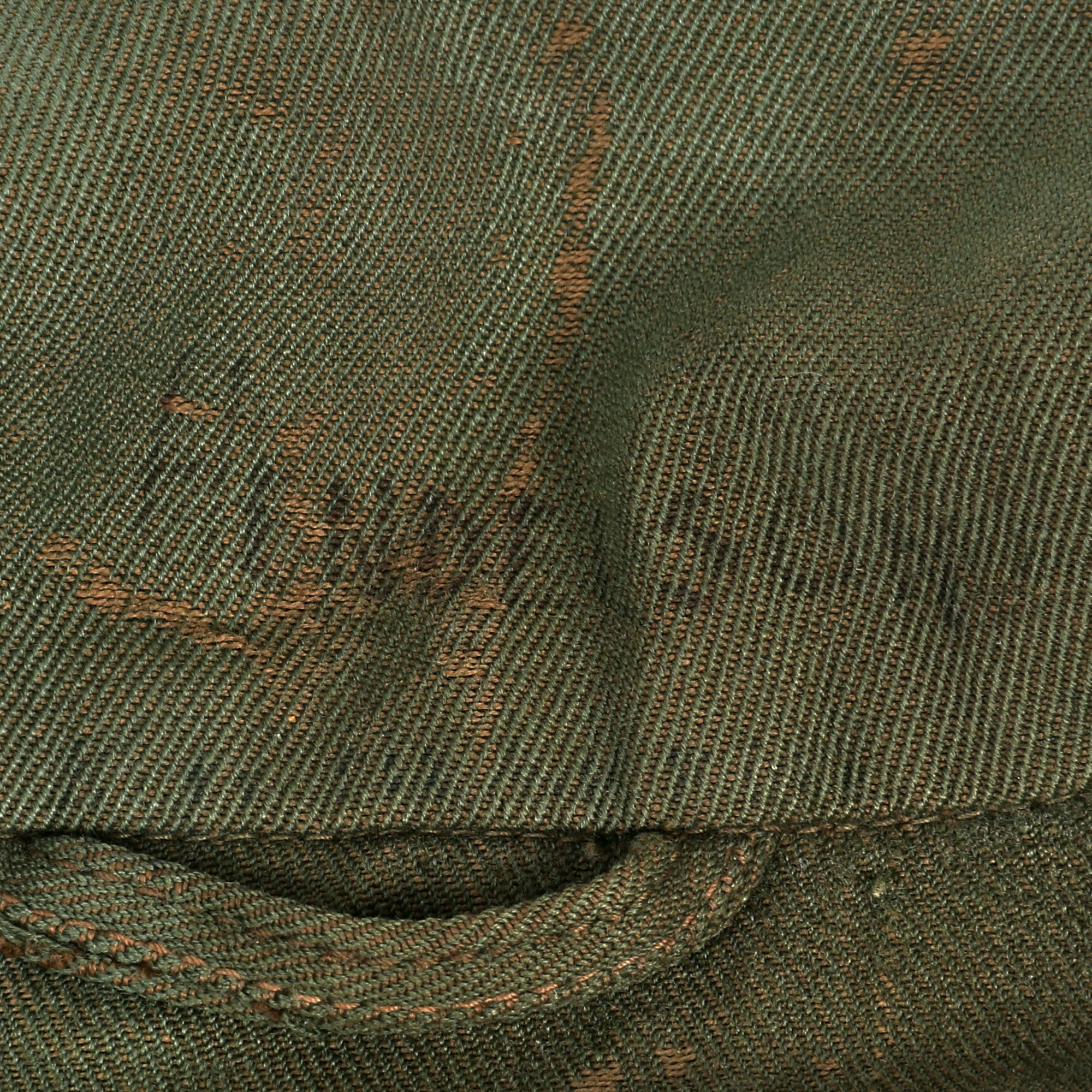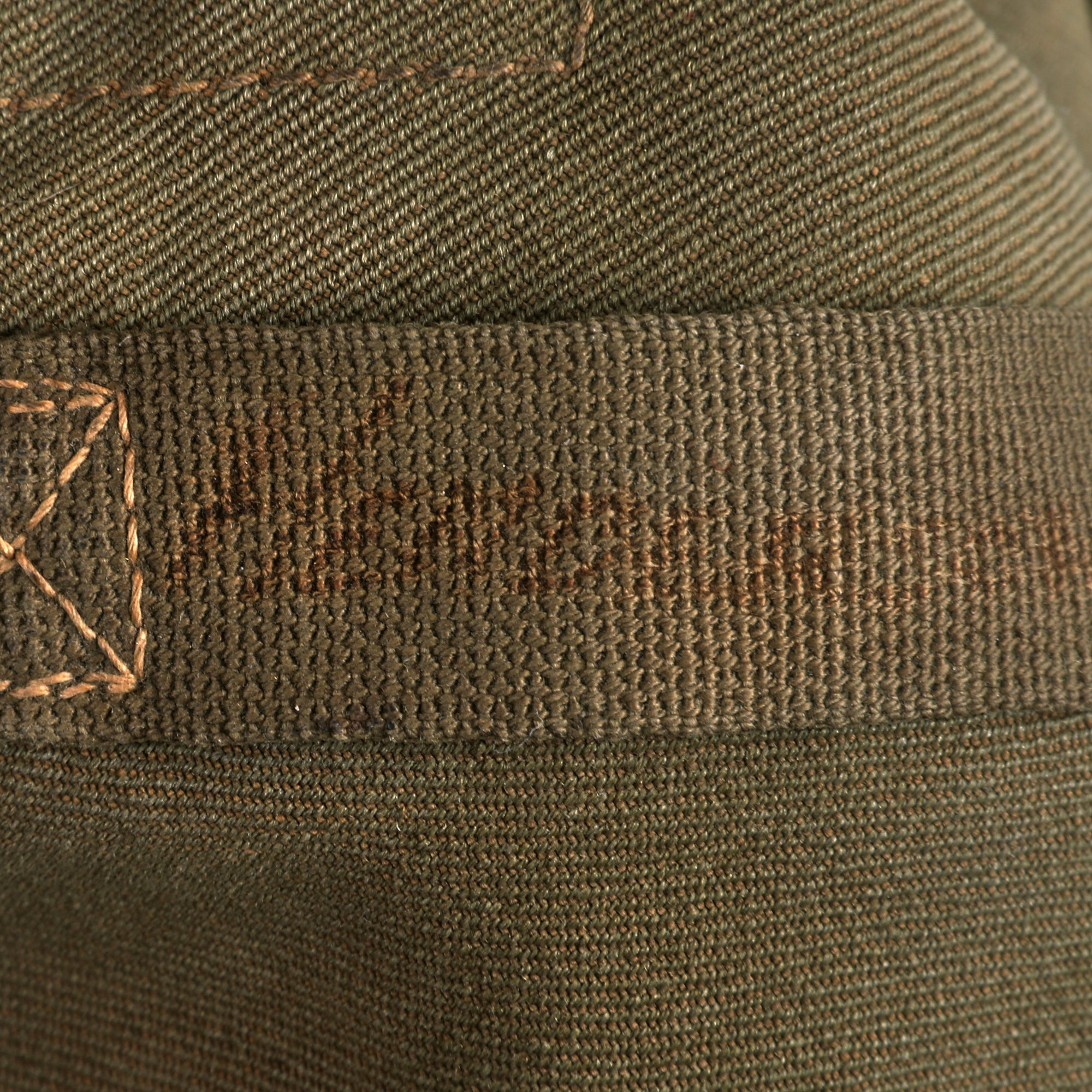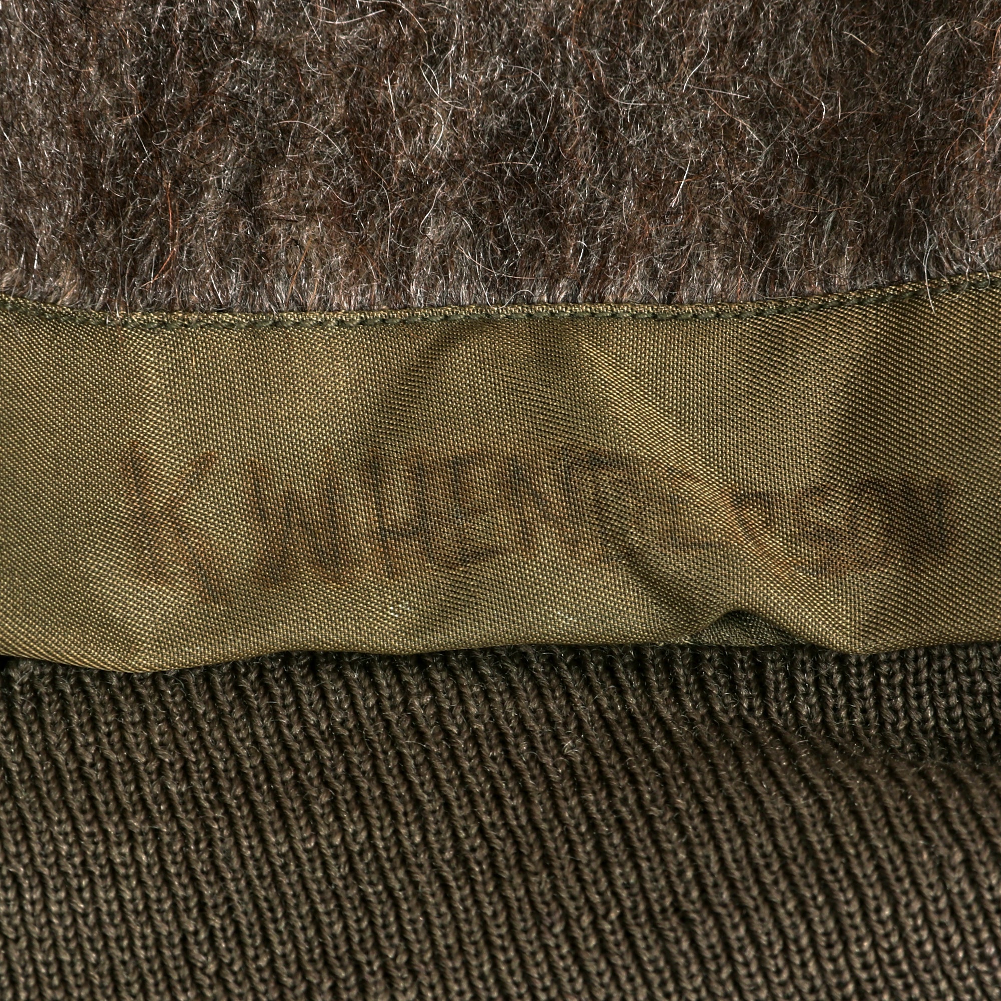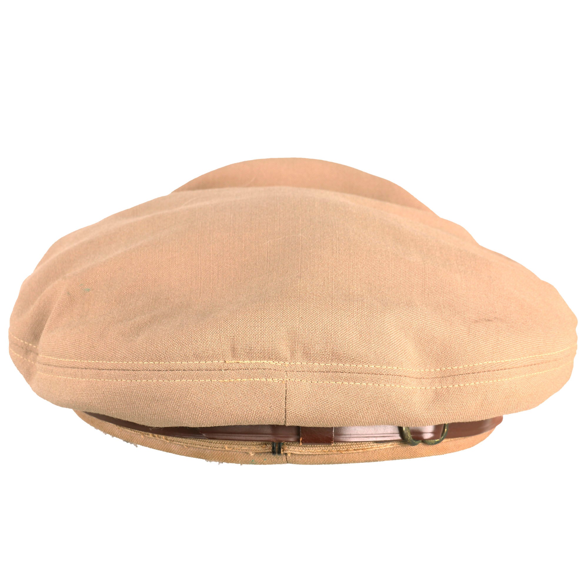 - Crusher Cap: One of the most iconic pieces of headgear to come out of WWII was the U.S. Crusher Cap, or “Fifty Mission Cap”. This visor cap, in “Summer Khaki” issue color. The outward appearance is extremely worn from honest use, and decades of storage wear. It retains the original iconic "crush" shape. The cap was certainly used and is a bit misshapen from long storage, However, with some effort and form fitting it will come back to form. The visor portion is very worn, partially detached and stained. The leather adjustment strap on the back and the leather chinstrap on the front are in solid condition. The cap bears the “FLIGHT ACE” markings on both the top of the cap and the sweatband.