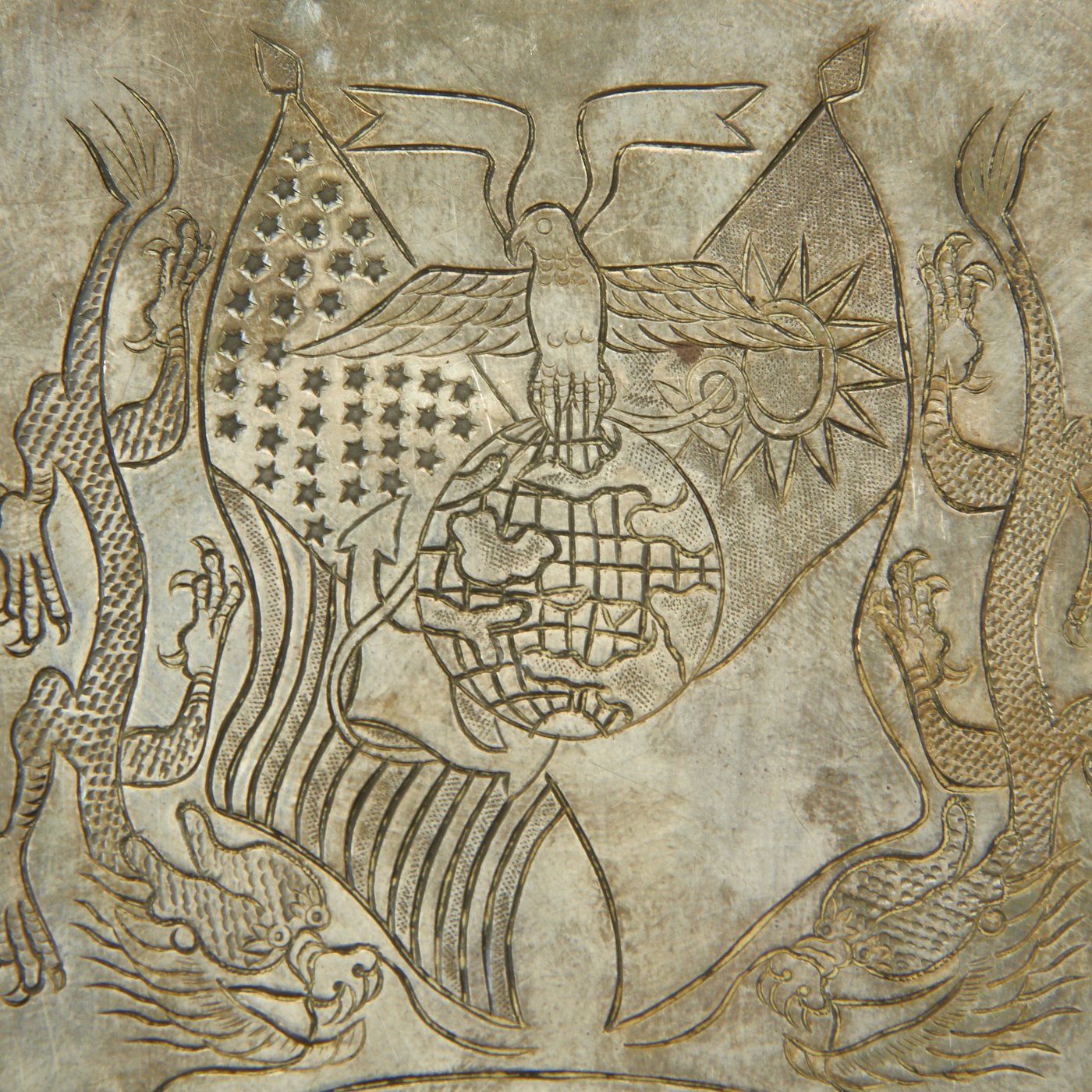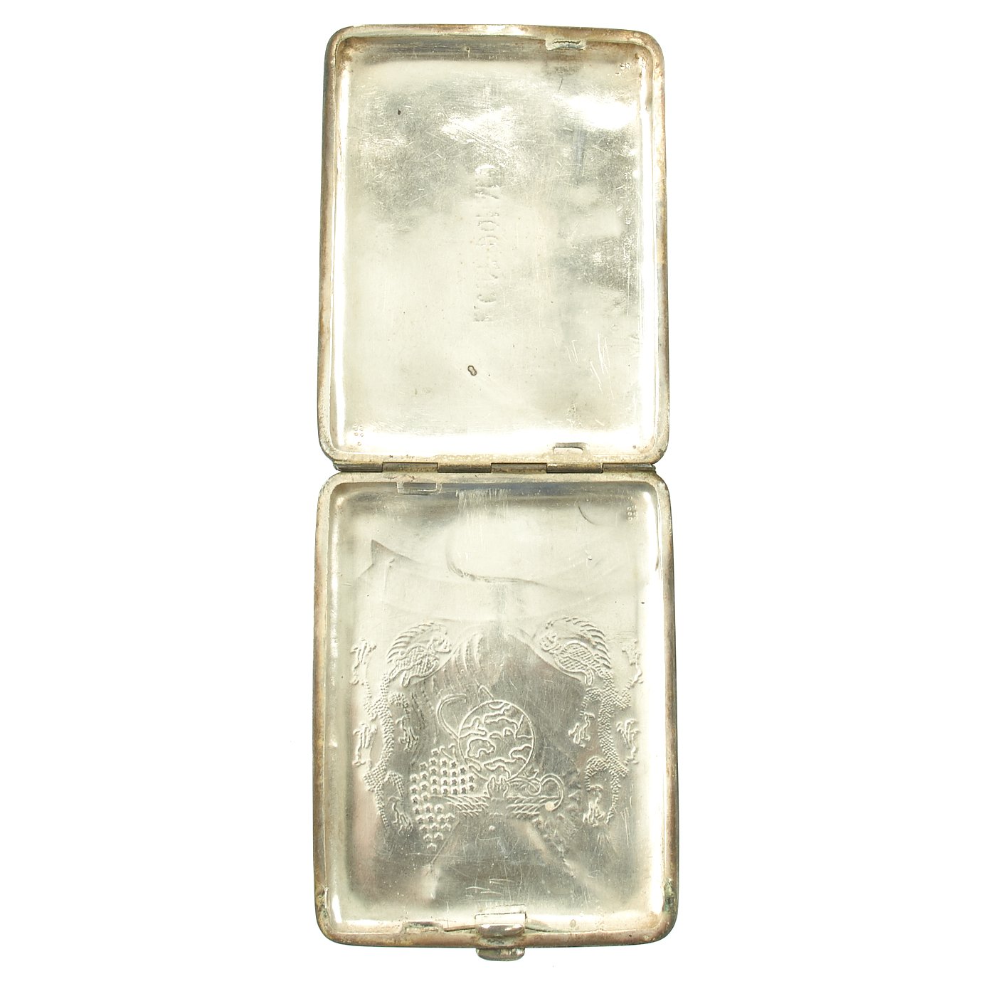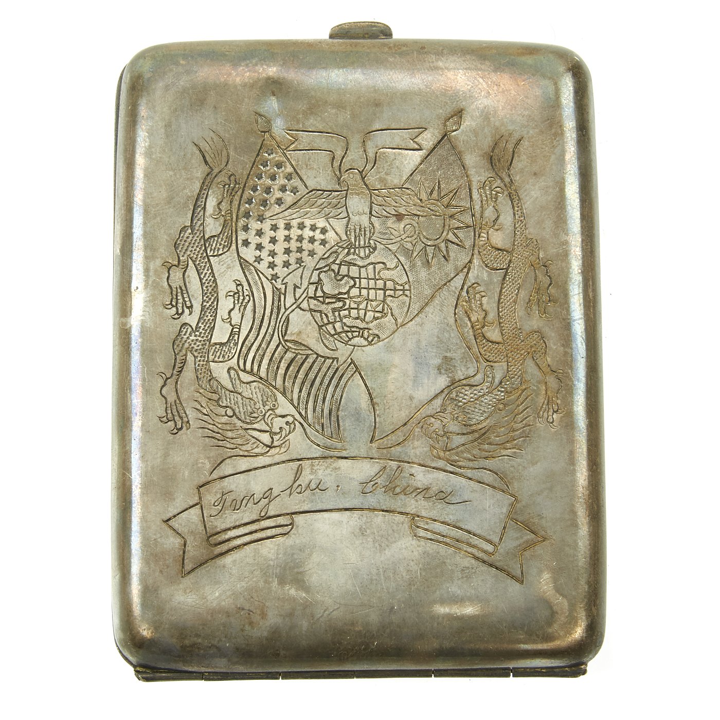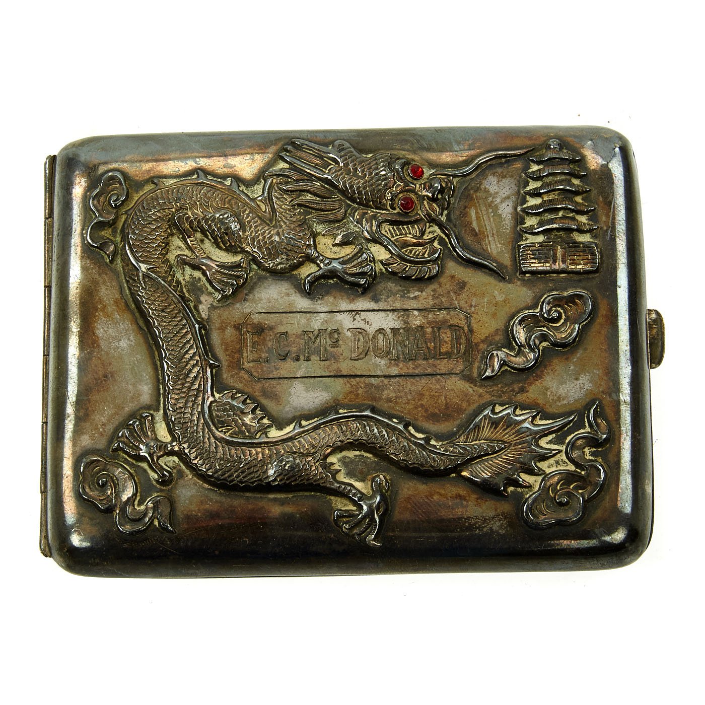Original Item: One-of-a-kind. This silver cigar case dates from WWII or just after and is named on the front to E.M. McDonald. The front has an intricate dragon design with red "ruby" eyes and temple. The reverse features the USMC insignia as well as Teng Hu, China. Its possible this case was made for a China Marine before 1941 but more likely after the occupation in 1946. The case is offered in excellent condition with functional claps and release button and measures approximately 4.25" x 3.5".