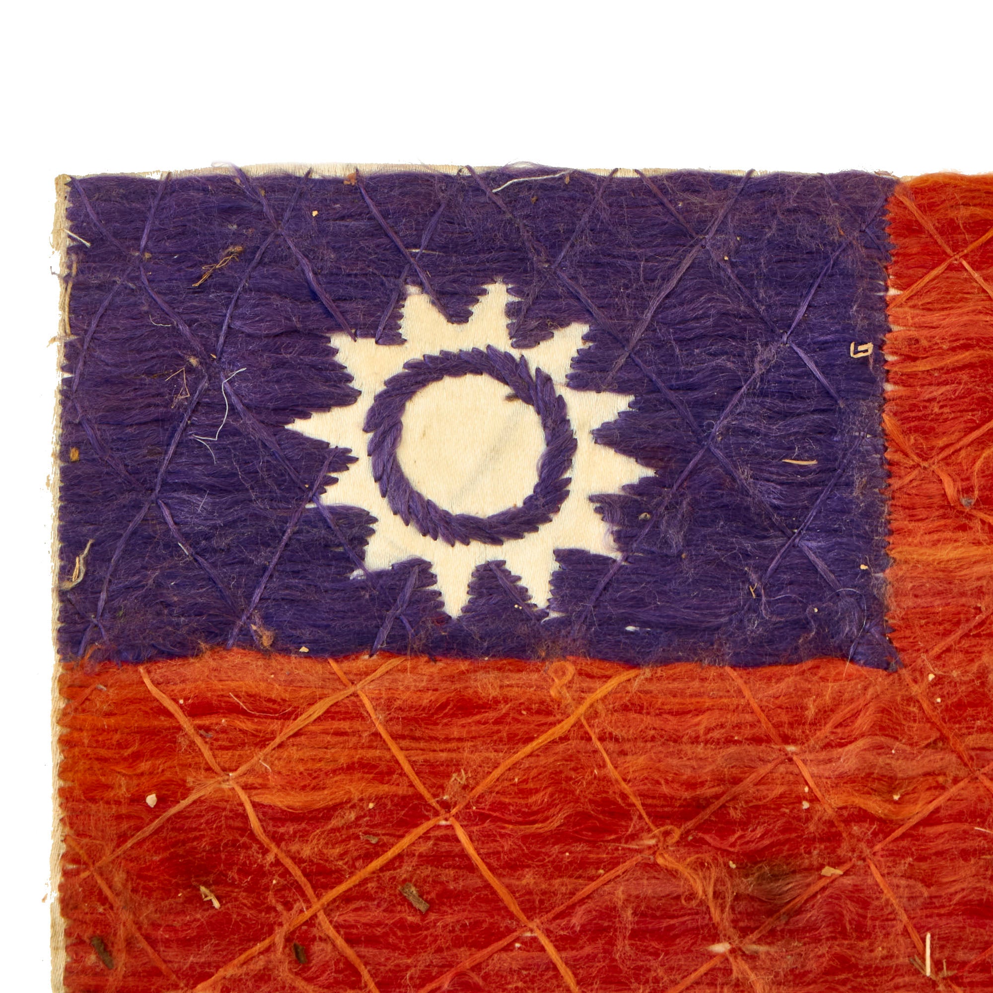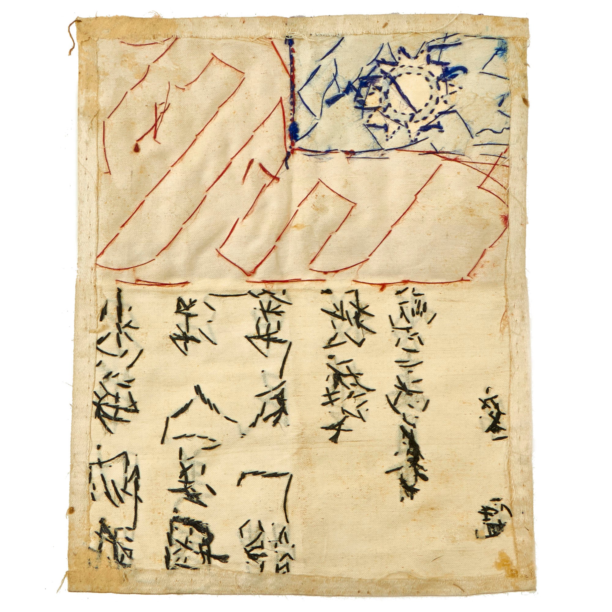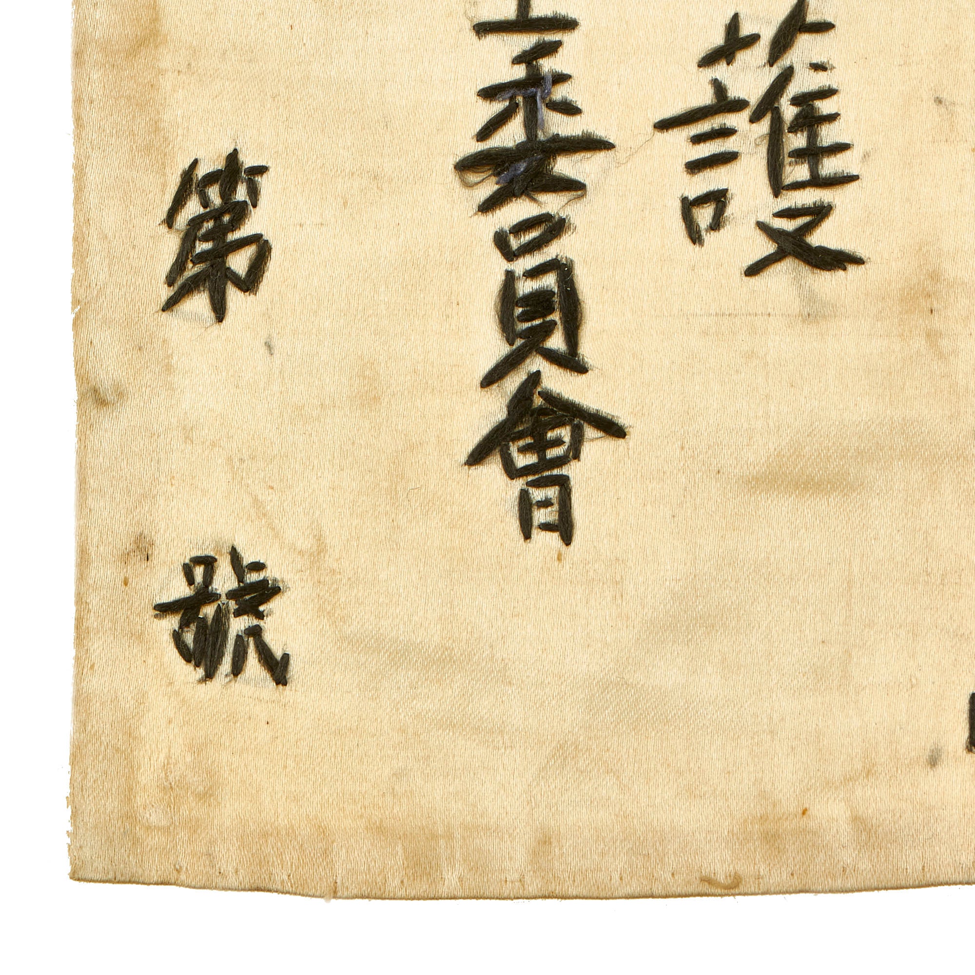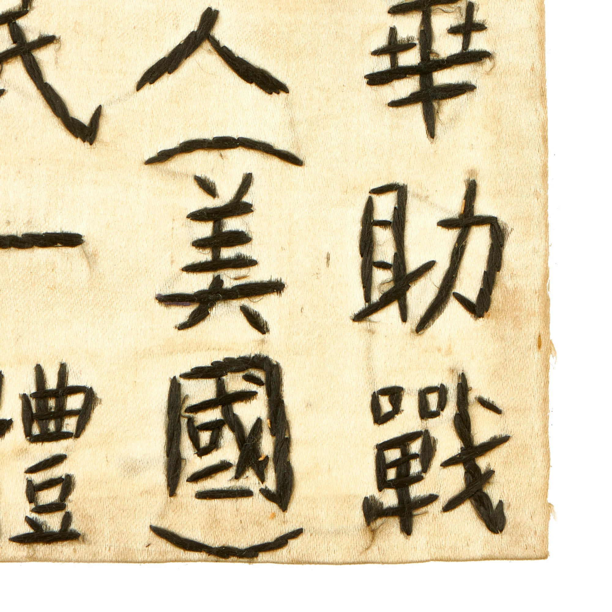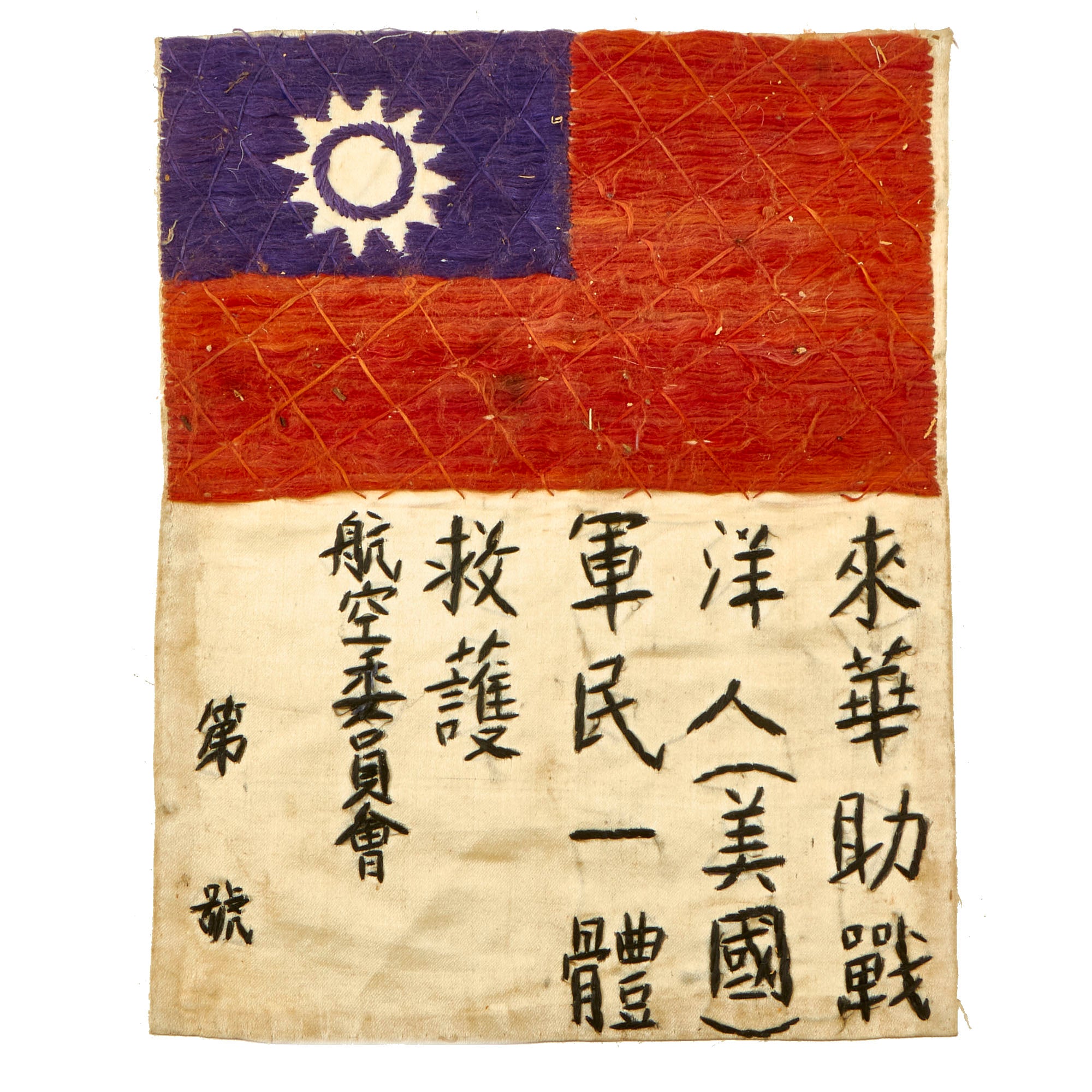 Original Items: Only One Set Available. This is an excellent condition, original silk blood chit. It bears a World War Two Chinese National Flag with Chinese Characters. This is an embroidered type done by the hands of a Chinese national for a US Serviceman during the war and the first one we have been able to offer. It measures approximately 7 inches by 9 ½ inches. This would have been stitched to the back or inside lining of a U.S. Aviator flight jacket. Condition is very good, with just a bit of staining and a small hole, as well as creases from decades of being folded.