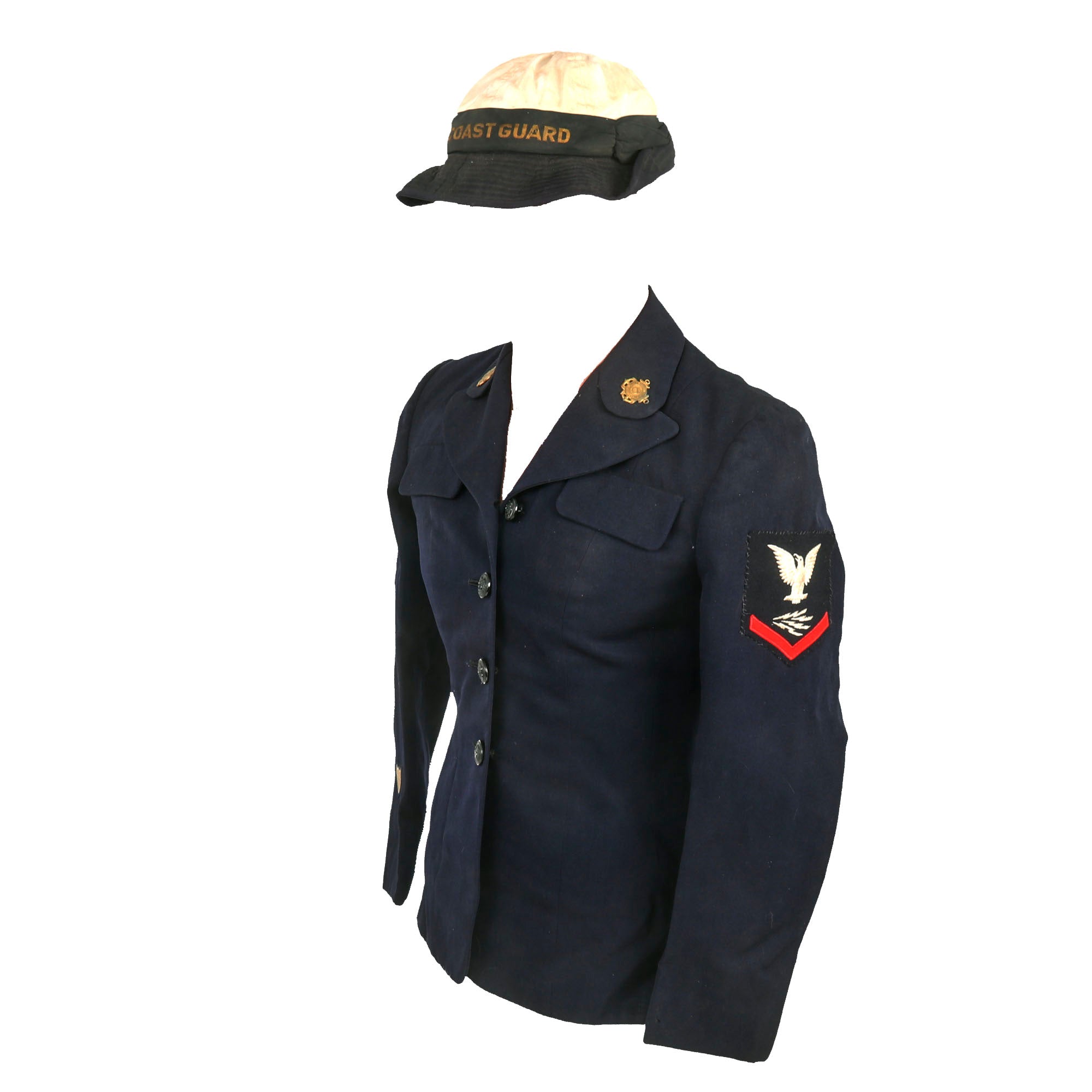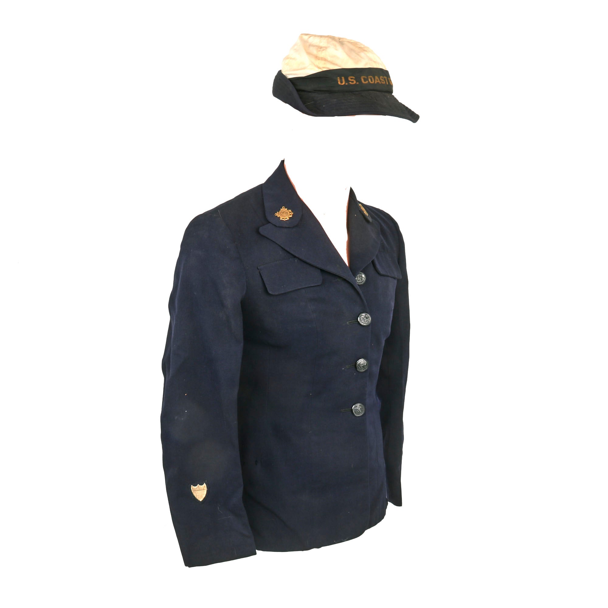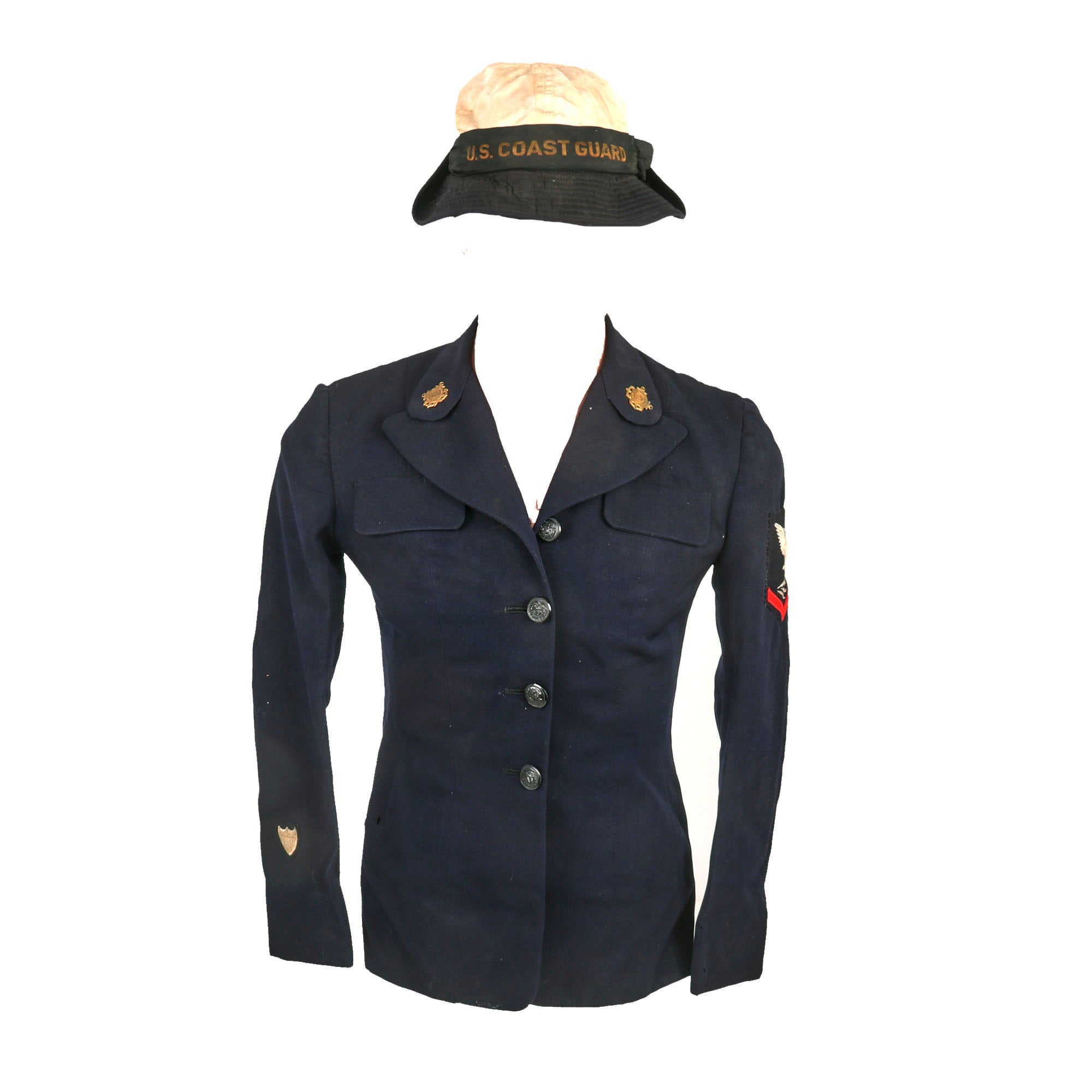 Original Grouping. One-of-a-Kind. This is a phenomenal & extensive Coast Guard Female S.P.A.R.S. uniform grouping identified to Lottie Mae Caldwell-Reynolds, one of the first 30 “Spars” to be training as a radio technician. The grouping includes several extremely scarce SPARS uniform pieces including a very rare bathrobe, bathing suit, and a rare SPARS purse which appears “untouched”, with many of the small bits and pieces still inside. This is a really tremendous collection with tons of research and display potential. Some of the uniform pieces have great period tags which may be early museum tags, with some information on the uniforms and Caldwell.