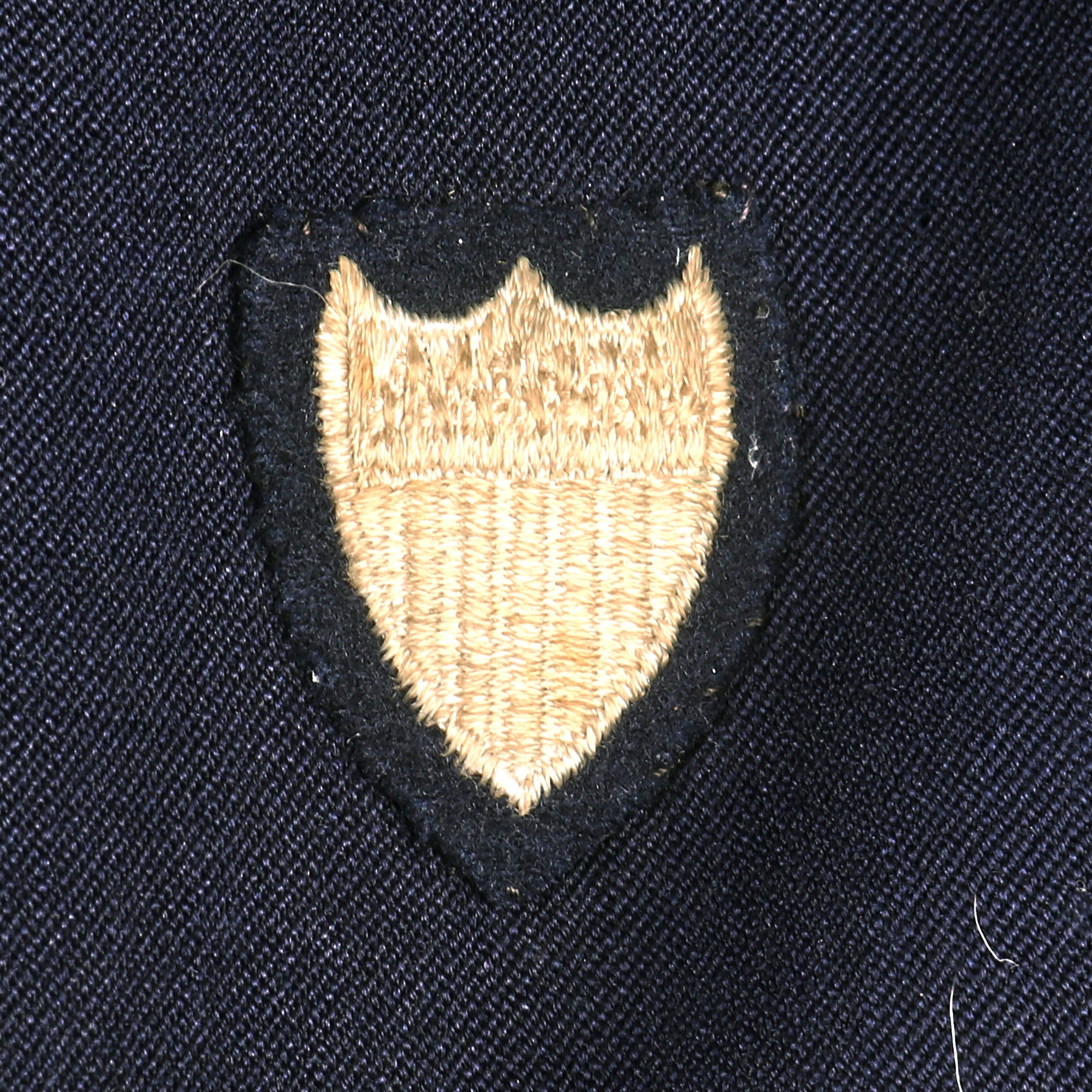 - Caldwell’s dark blue SPARS uniform jacket with US Coast Guard buttons, a Radioman Third Class rate on the left sleeve, a small SPARS Shield patch on the right cuff, and US Coast Guard collar insignia. There is a nametag stitched under the collar reading LOTTIE MAE CALDWELL.