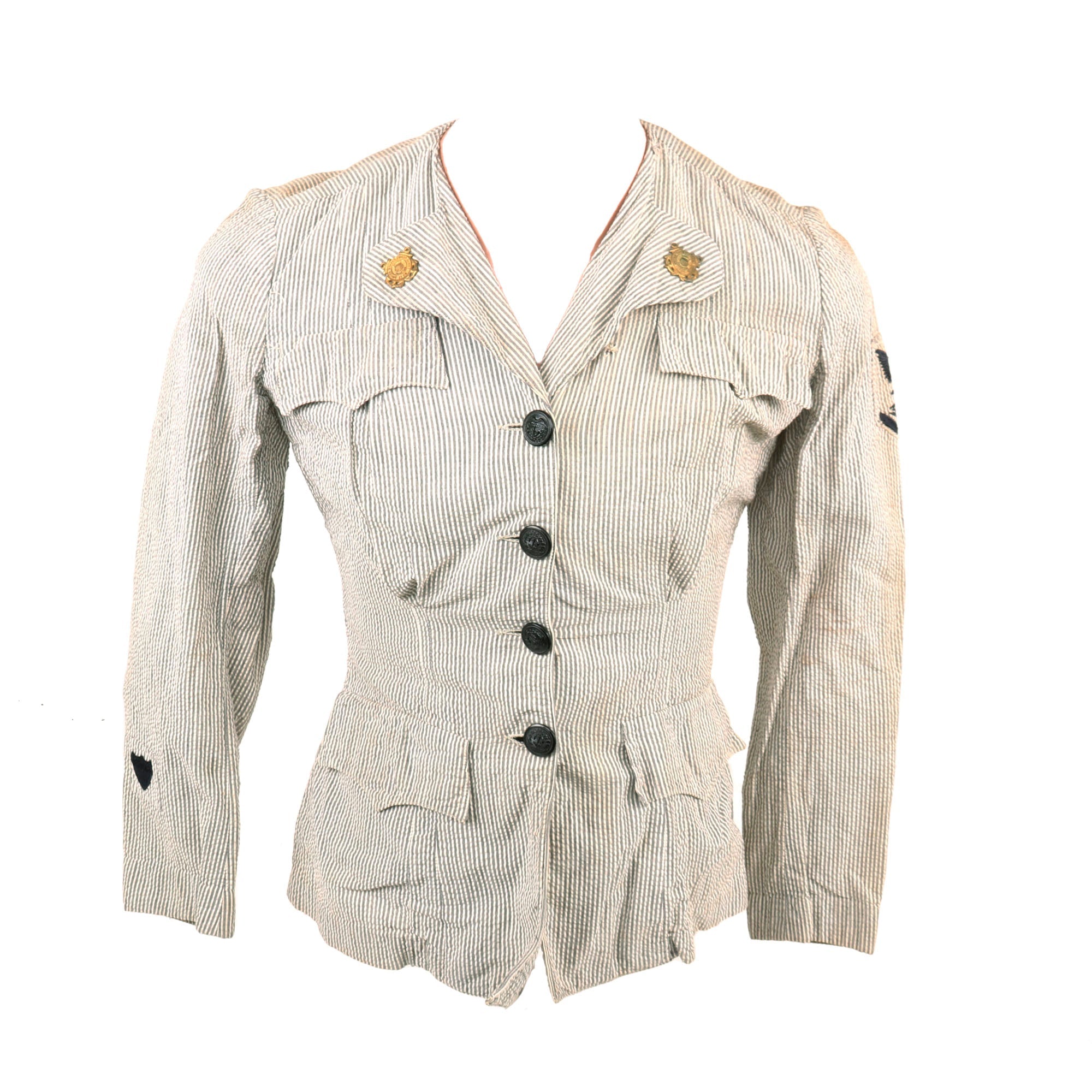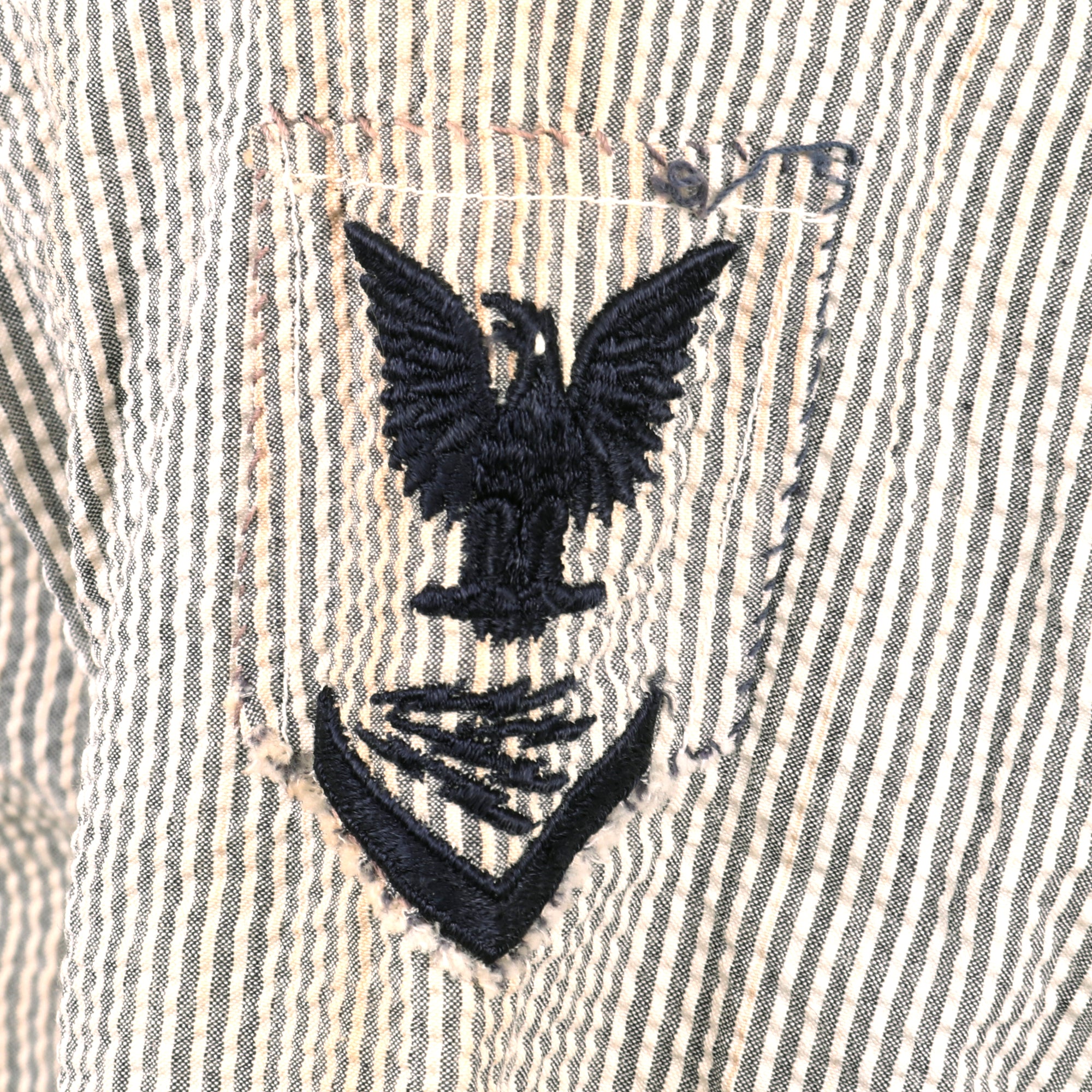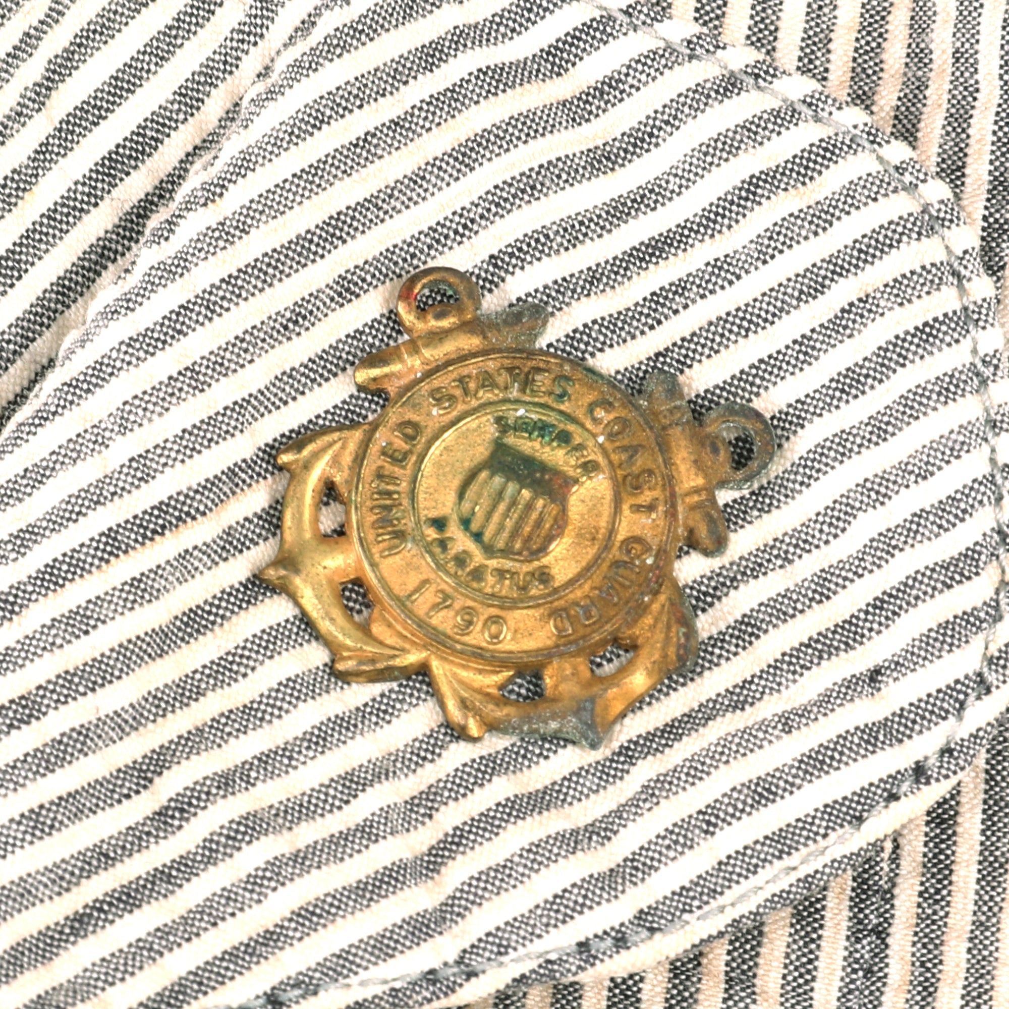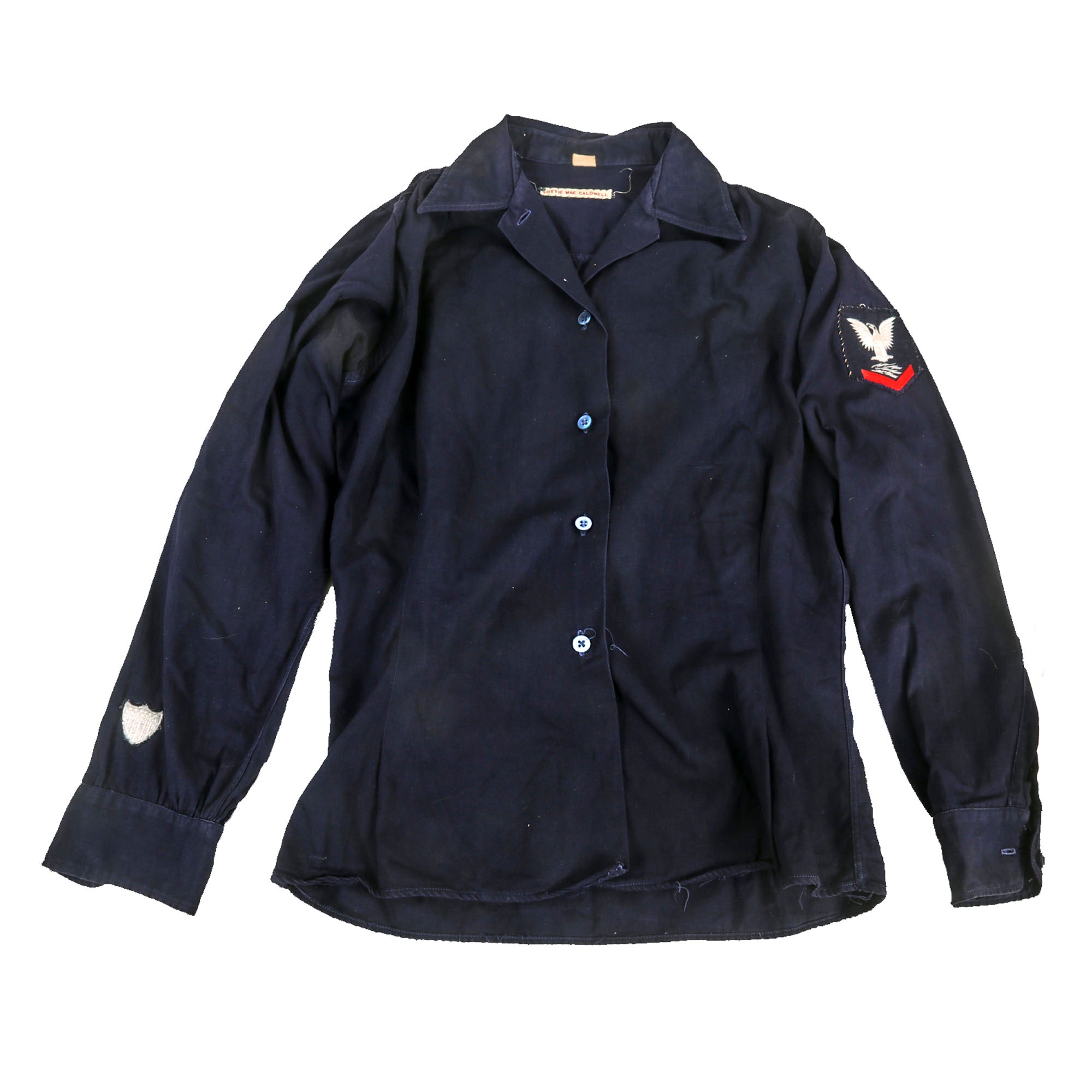- Caldwell’s striped “Seersucker” uniform shirt with US Coast Guard buttons, a Radioman Third Class rate on the left sleeve, a small SPARS Shield patch on the right cuff, and US Coast Guard collar insignia. There is a nametag stitched under the collar reading LOTTIE MAE CALDWELL.