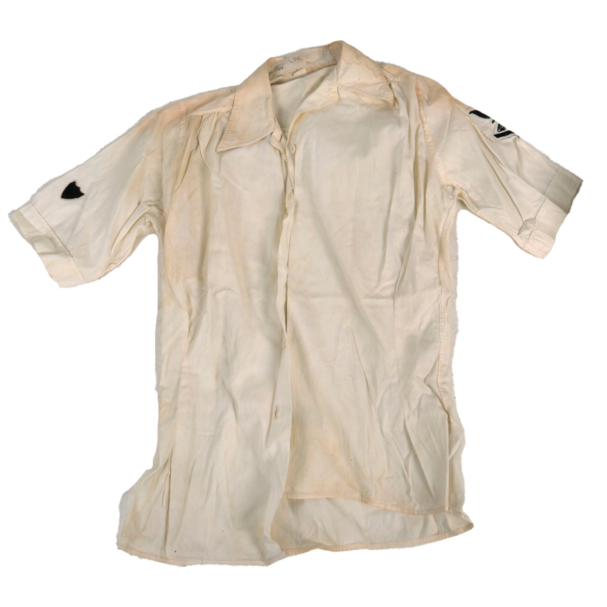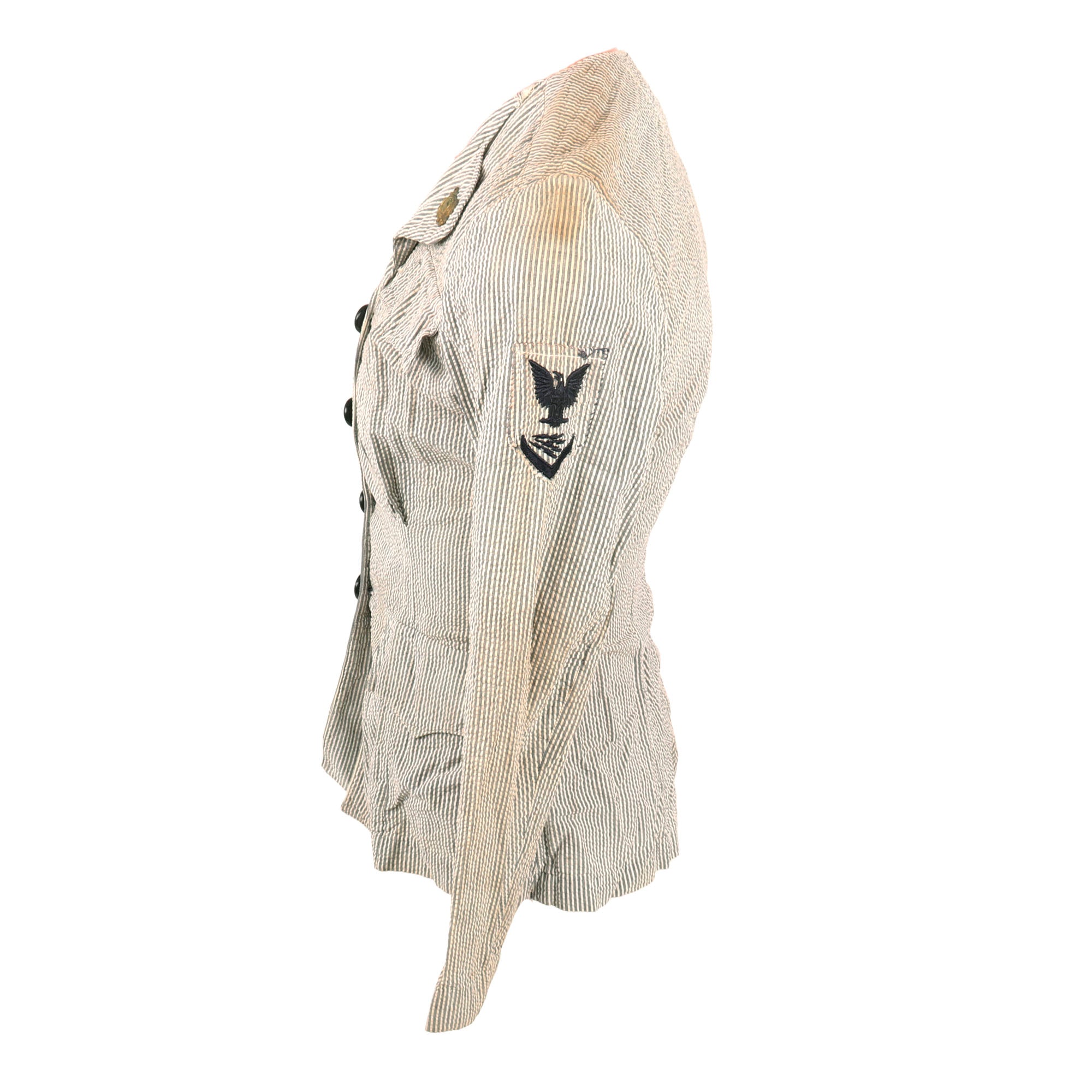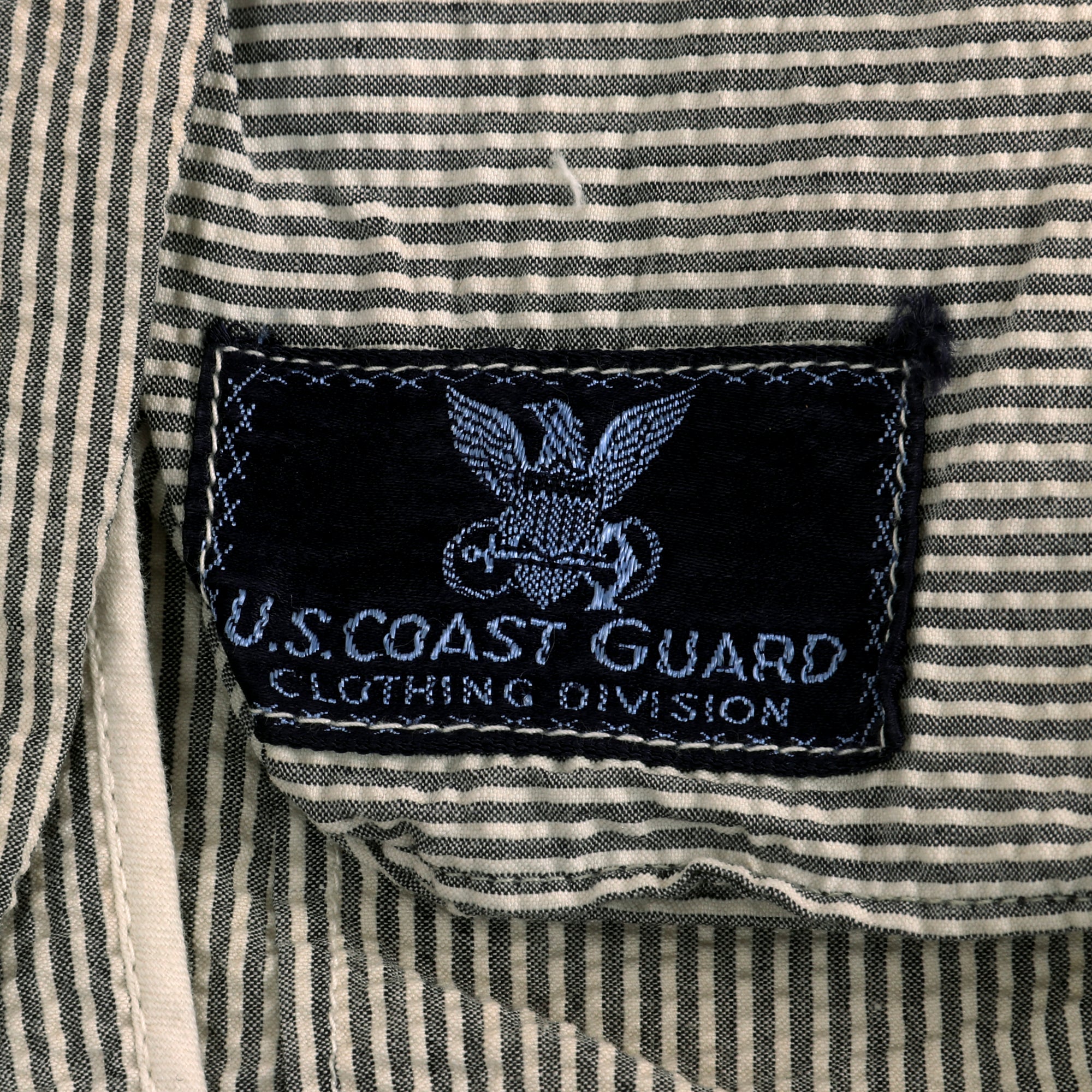 - Caldwell’s striped “Seersucker” uniform shirt with US Coast Guard buttons, a Radioman Third Class rate on the left sleeve, a small SPARS Shield patch on the right cuff, and US Coast Guard collar insignia. There is a nametag stitched under the collar reading LOTTIE MAE CALDWELL.