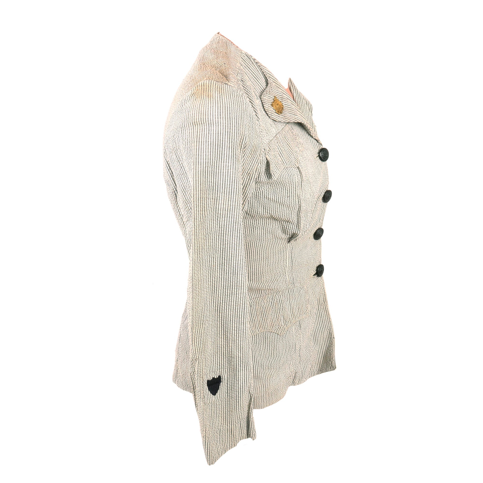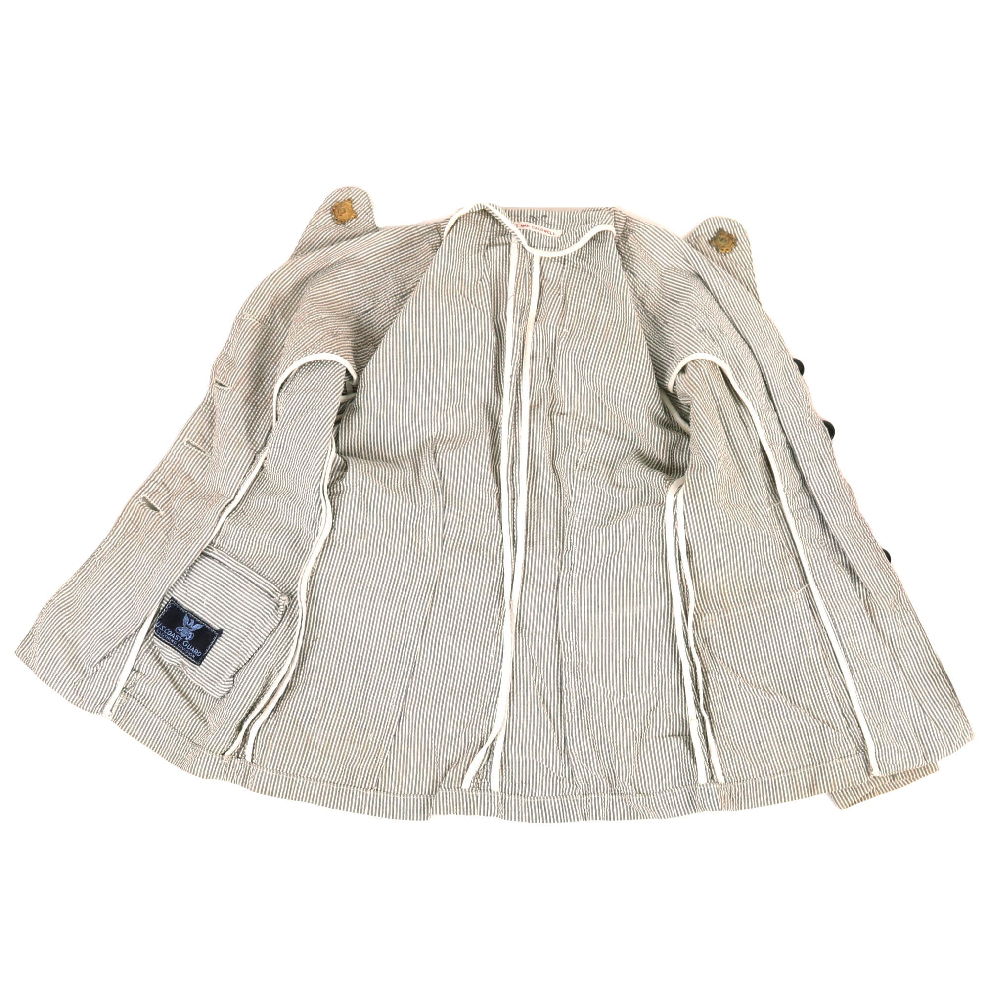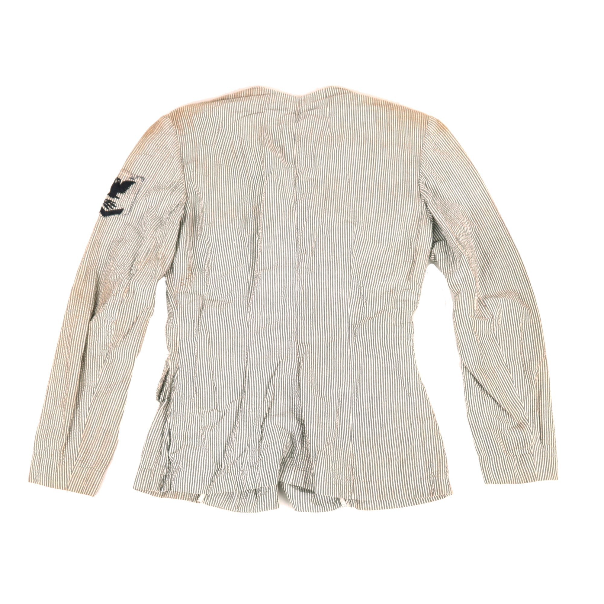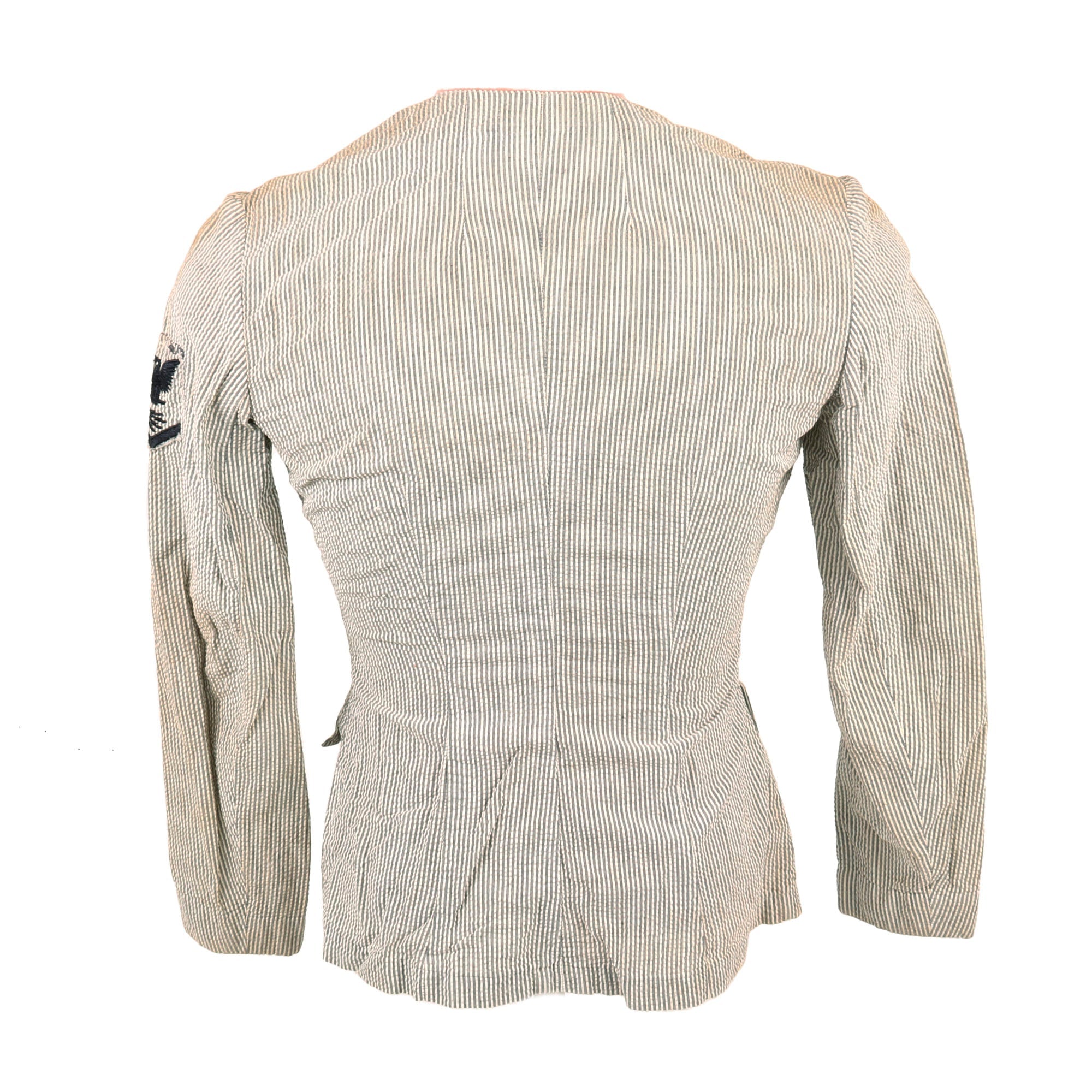 - Caldwell’s striped “Seersucker” uniform shirt with US Coast Guard buttons, a Radioman Third Class rate on the left sleeve, a small SPARS Shield patch on the right cuff, and US Coast Guard collar insignia. There is a nametag stitched under the collar reading LOTTIE MAE CALDWELL.