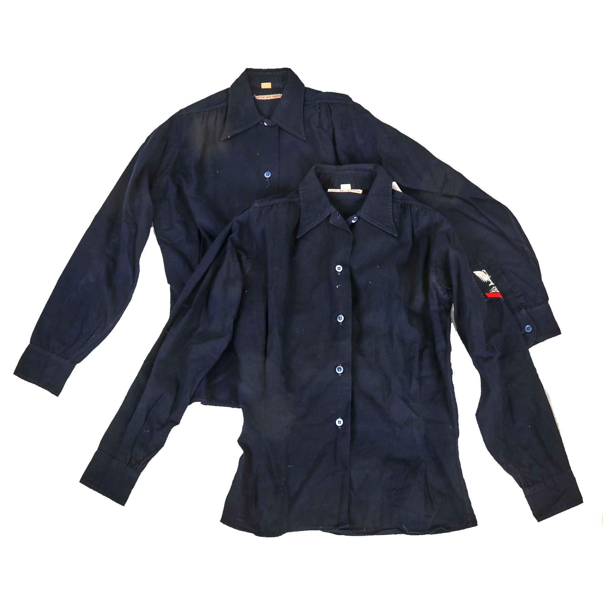 - Three Identical dark blue SPARS uniform shirts, all with the same LOTTIE MAE CALDWELL tag stitched under the collars. One has a Radioman Third Class rate on the left sleeve and a small SPARS Shield patch on the right cuff, another has just the Radioman Third Class rate on the left sleeve, and the third has no insignia.
