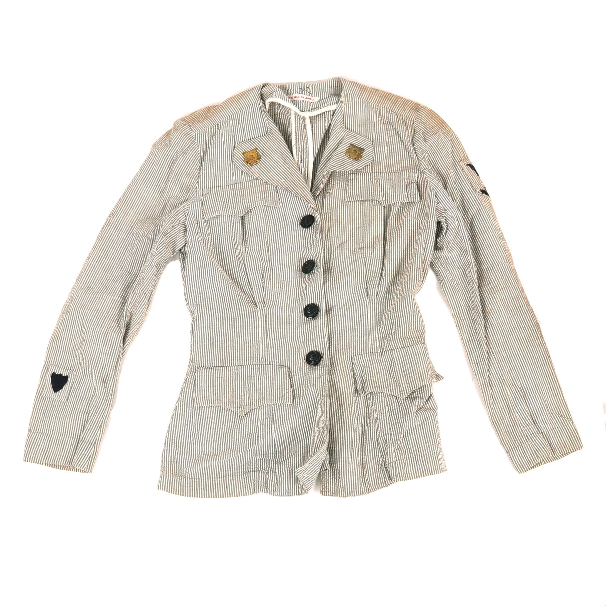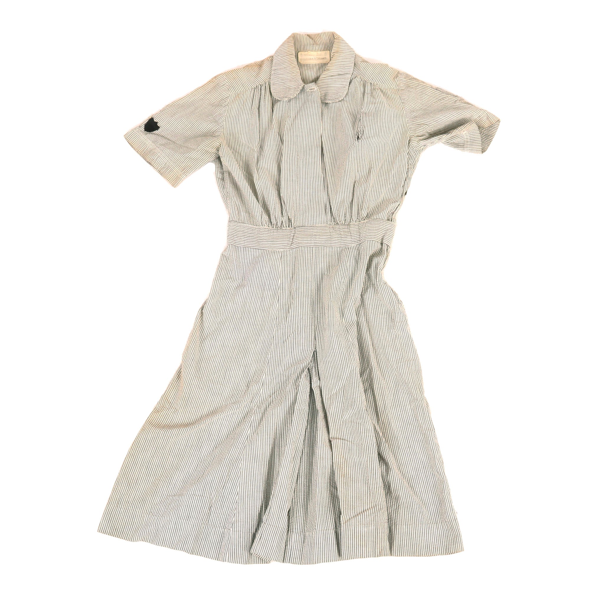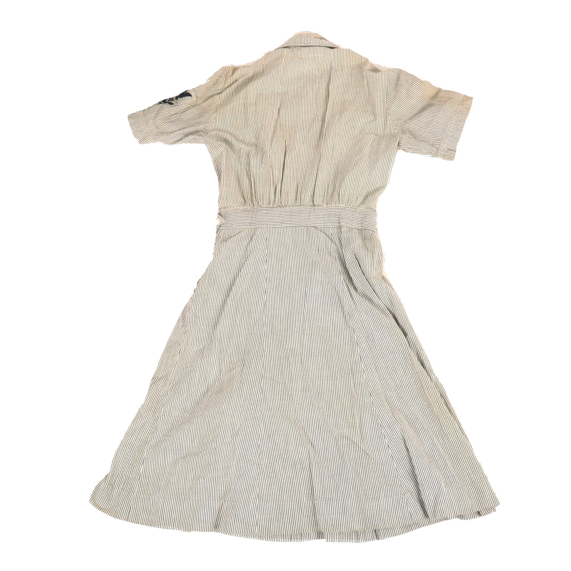 - Caldwell’s striped “Seersucker” uniform dress with a Radioman Third Class rate on the left sleeve and a small SPARS Shield patch on the right cuff. There is a US Coast Guard nametag under the collar with Lottie M. Caldwell written on.
