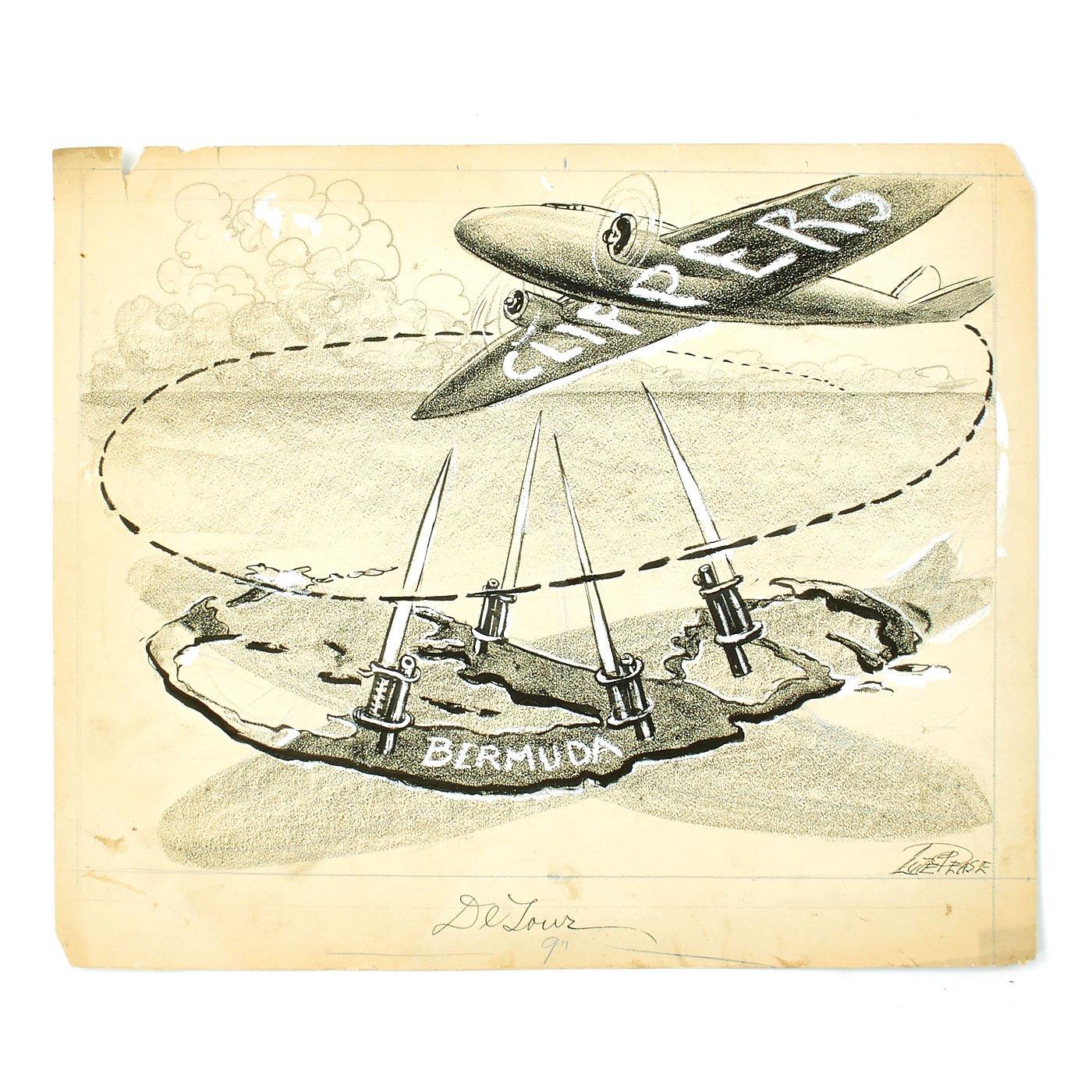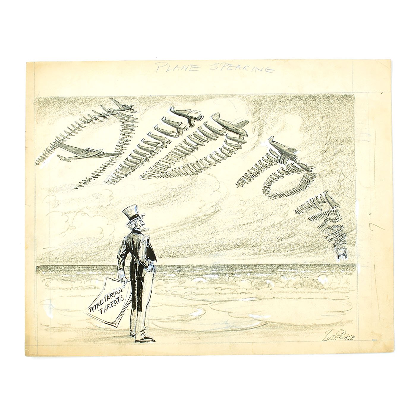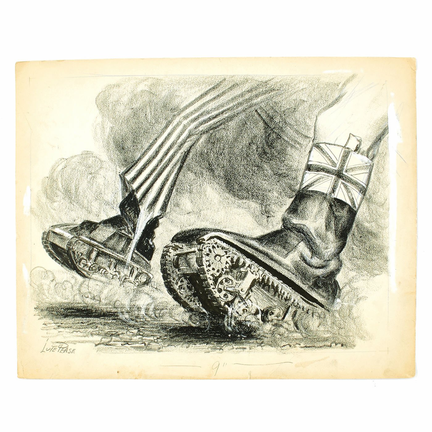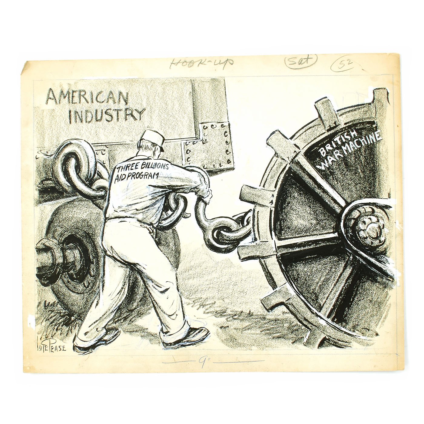 Original Item: One of a Kind Set. LUCIUS CURTIS PEASE JR., known as "LUTE", lived from 1869 until 1963. He was Nationally known as the Political Cartoonist for THE NEWARK EVENING NEWS from 1914 until 1954. The archive is made up of EIGHT original pieces of pencil Art Work published during WWII and into the Cold war era. These are totally original, covered in whiteout corrections, and each is titled. Most are officially stamped with a 3 1/2" X 2" Newark Evening News stamp to rear, indicating the Day of the Week and Edition time they were to be featured in.