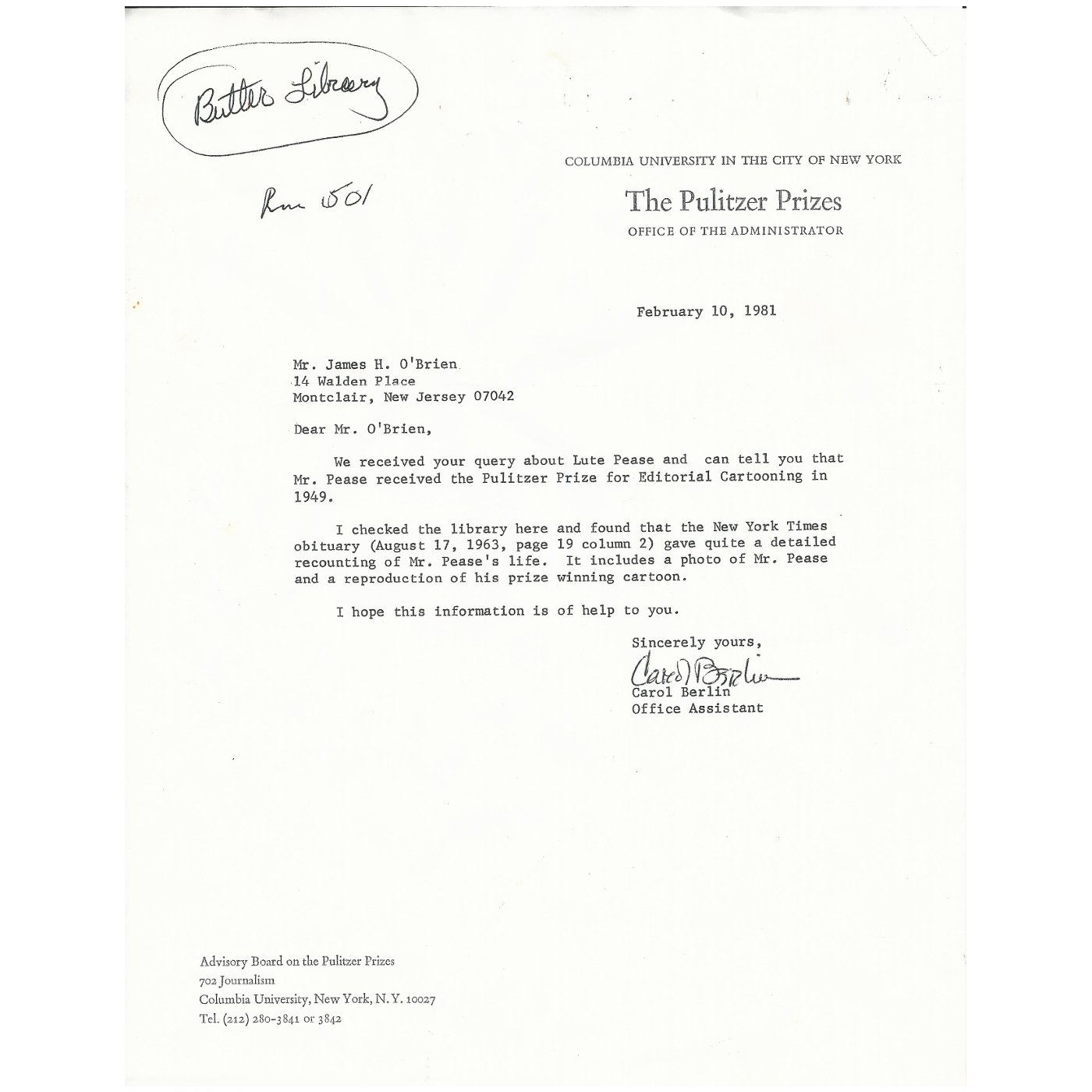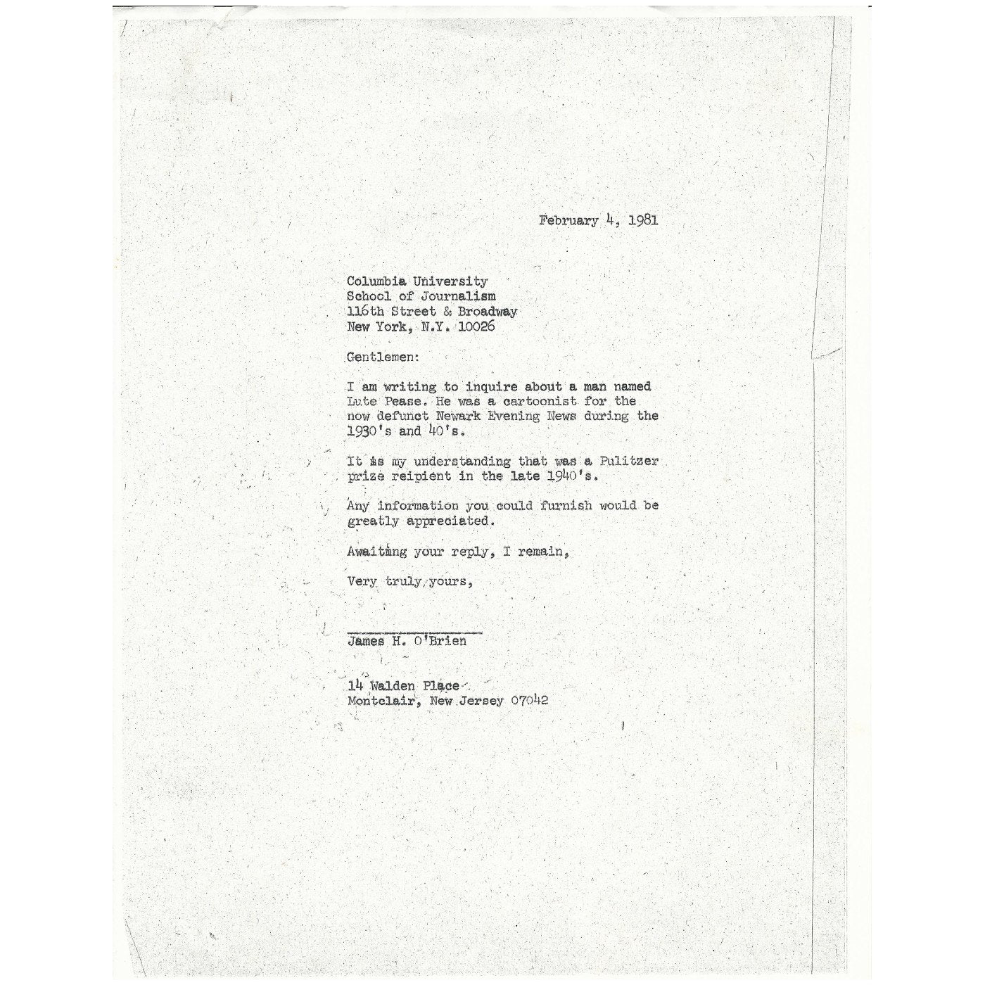 With this set comes a copy of a letter dated February 4th 1981, addressed to the School of Journalism of COLUMBIA UNIVERSITY in New York City, requesting information re LUTE PEASE. There is also the ORIGINAL reply letter from PULITZER PRIZES ADMINISTRATION DEPARTMENT at COLUMBIA UNIVERSITY dated February 15th 1981, confirming that LUTE PEASE was awarded the PULITZER PRIZE for EDITORIAL CARTOONING" for his Cartoon published on February 15th 1948.
