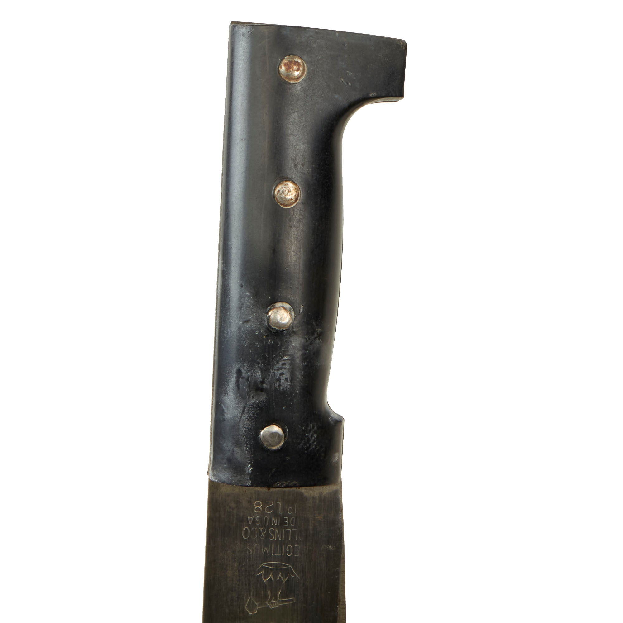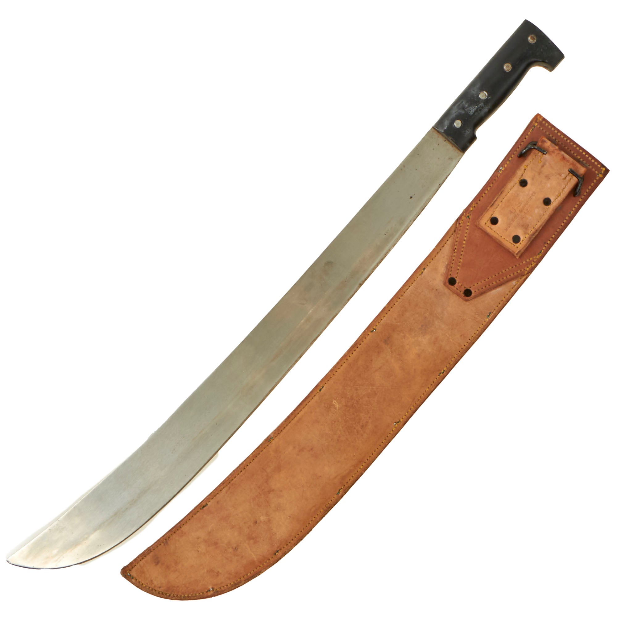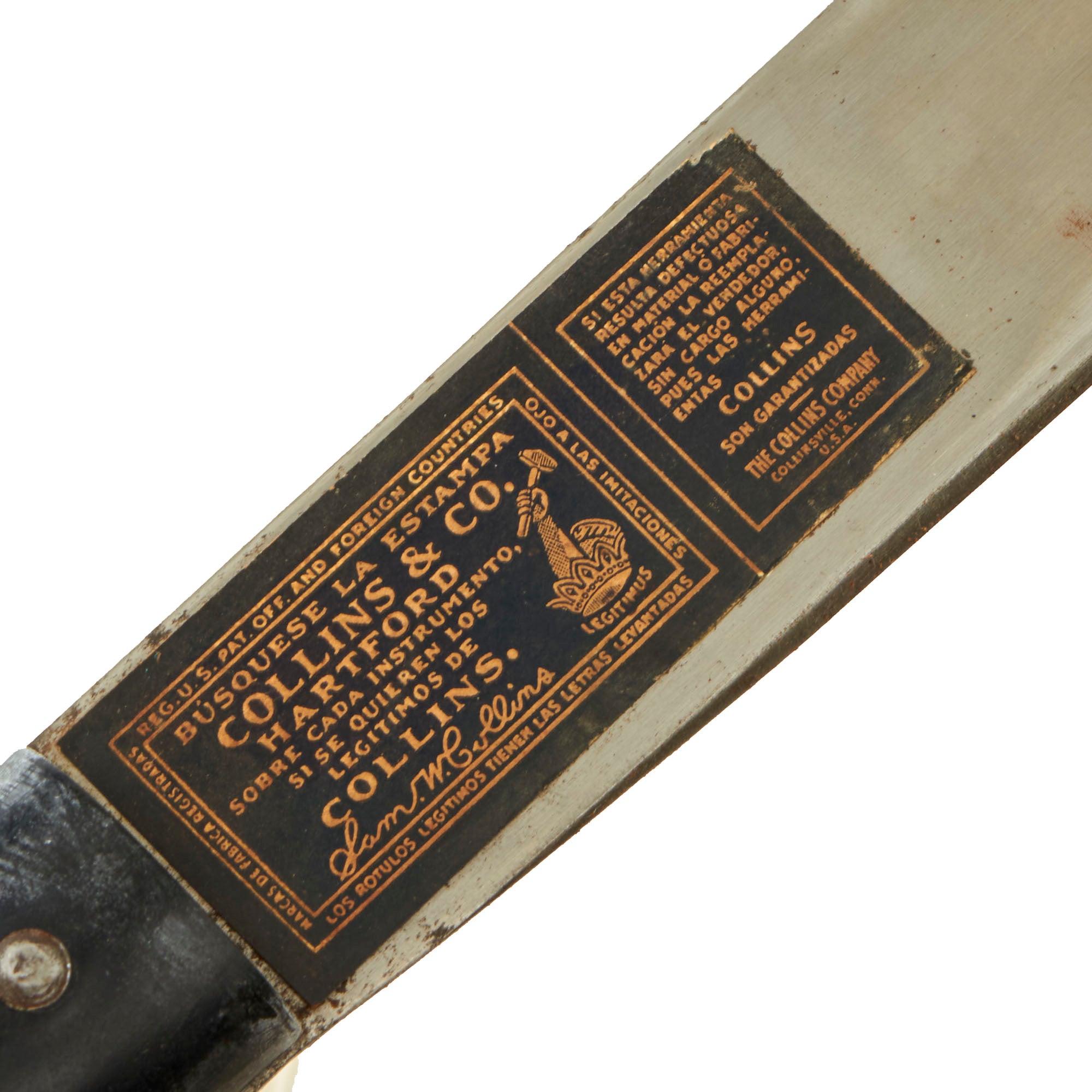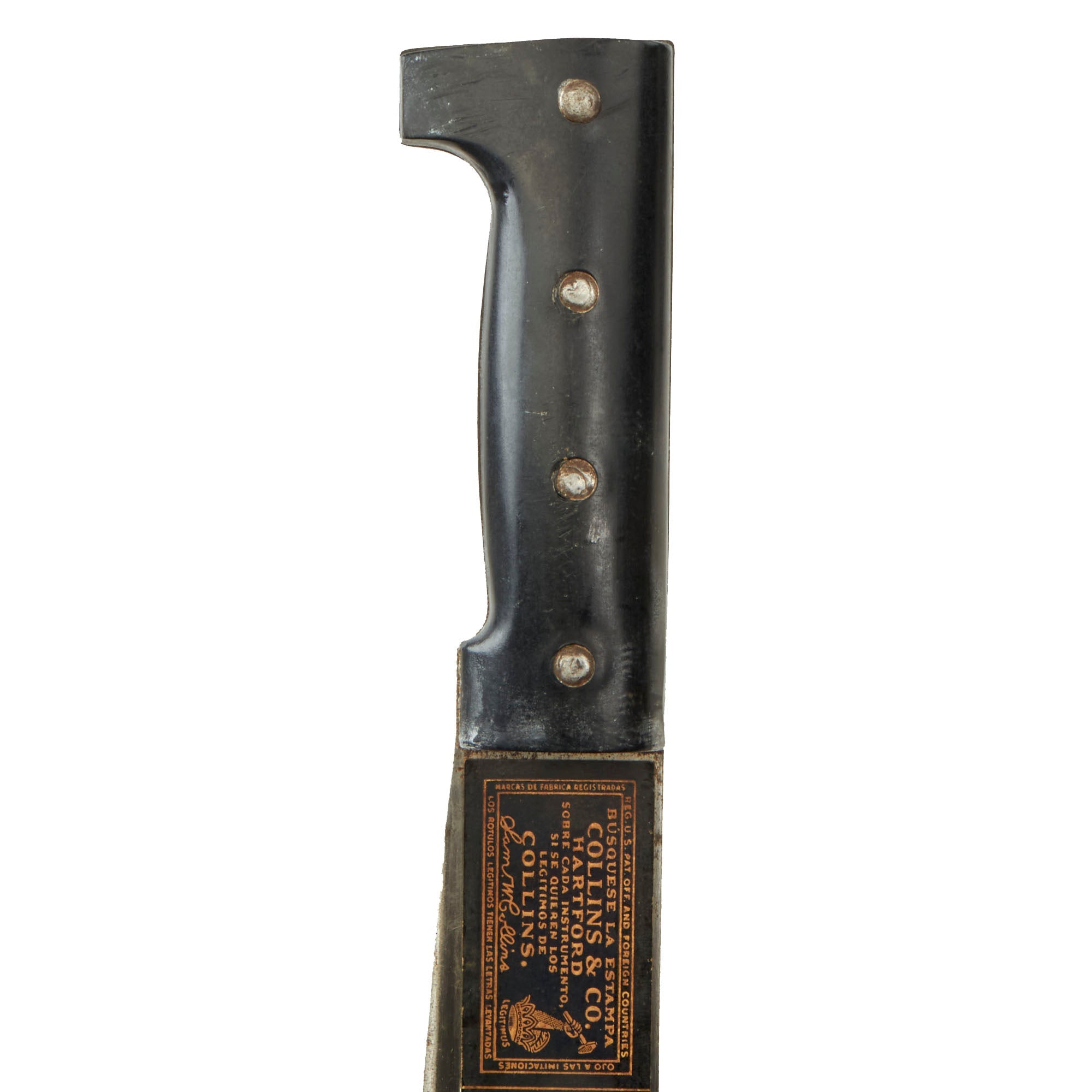 These long machetes are hard to come by on today's market. Made by Collins & Co. of Hartford, Conn, this is a LEGITIMUS model long jungle machete. The Machete has an impressive overall length of 27 inches, with a straight 22 inch Bush/Collins machete shape blade. The ricasso is nicely marked on one side: