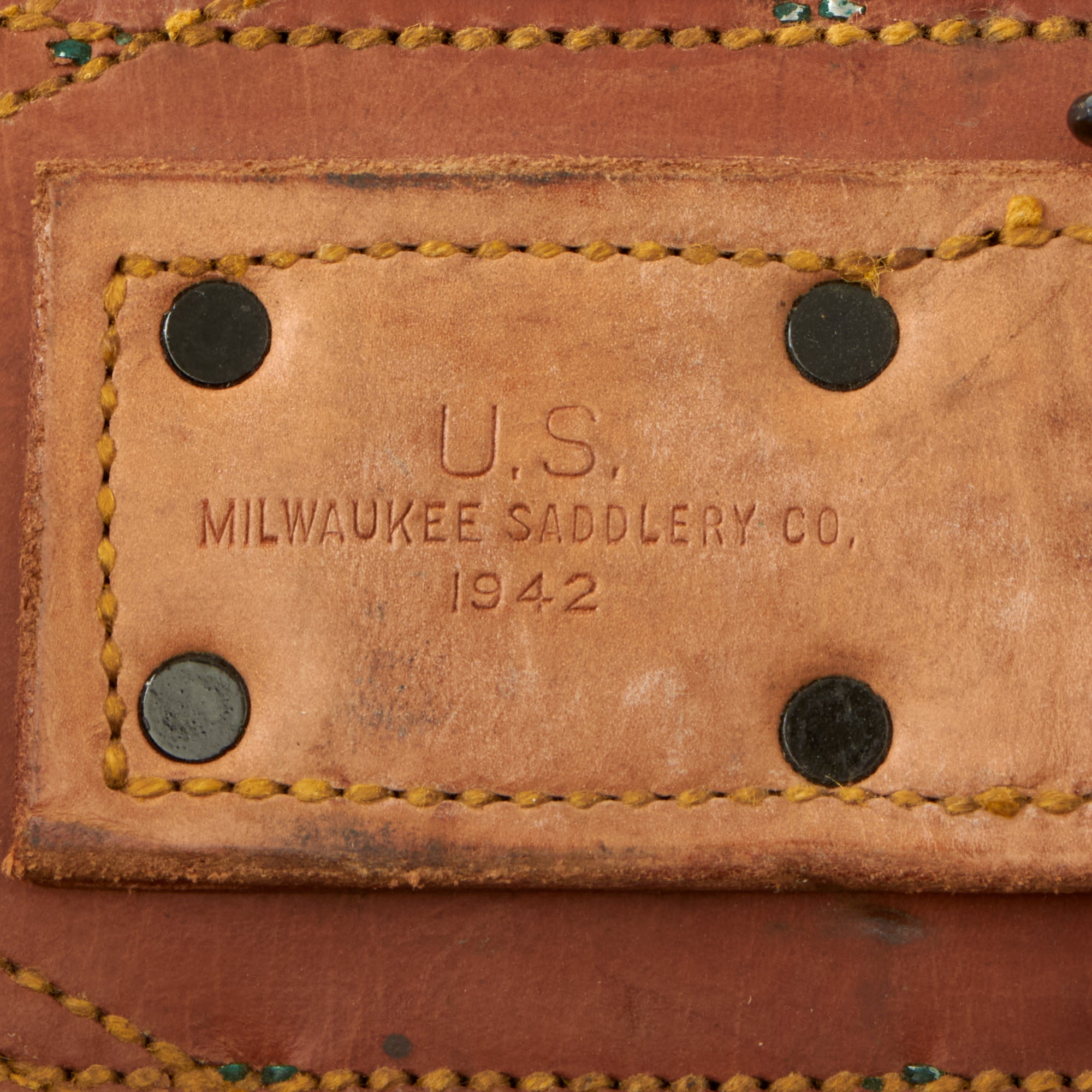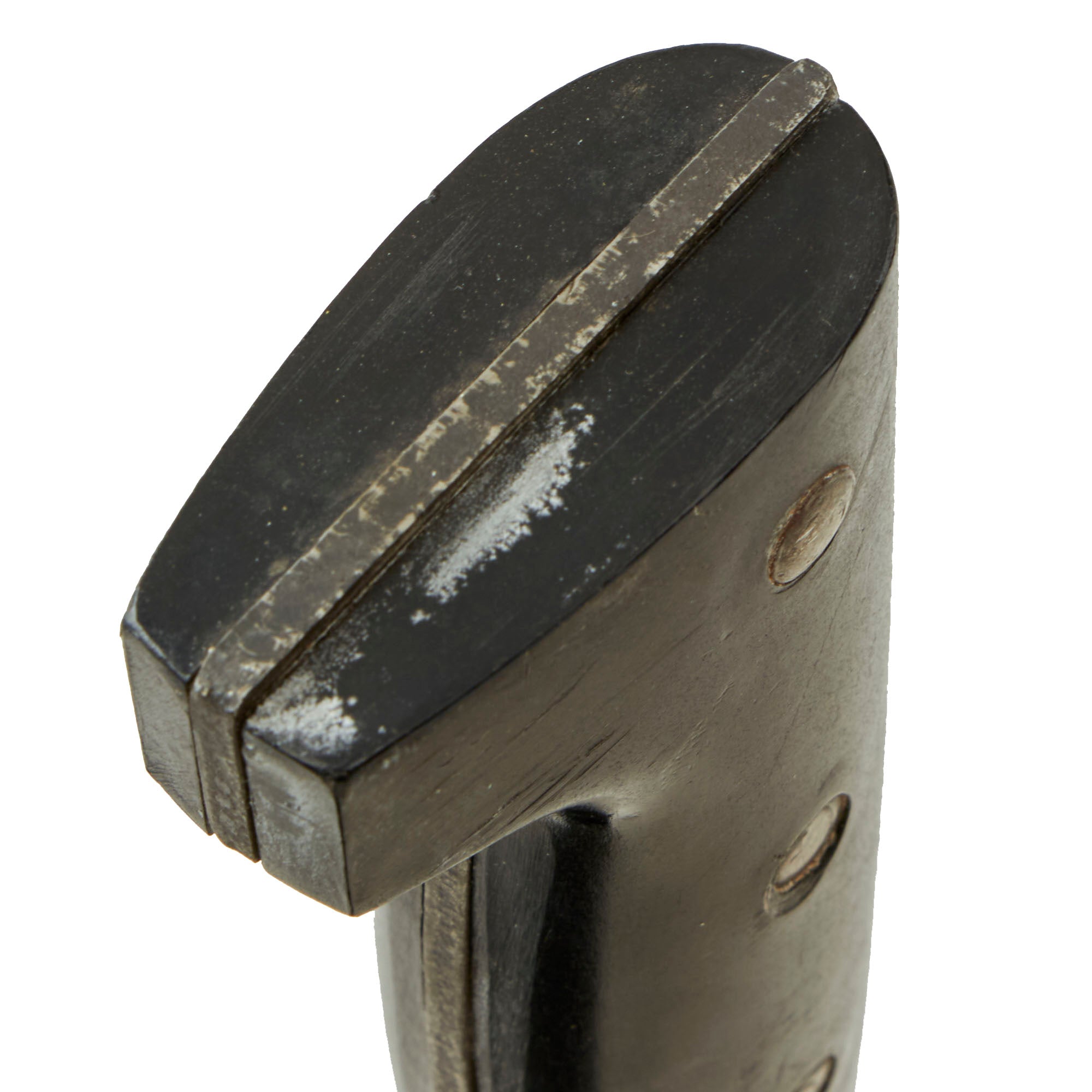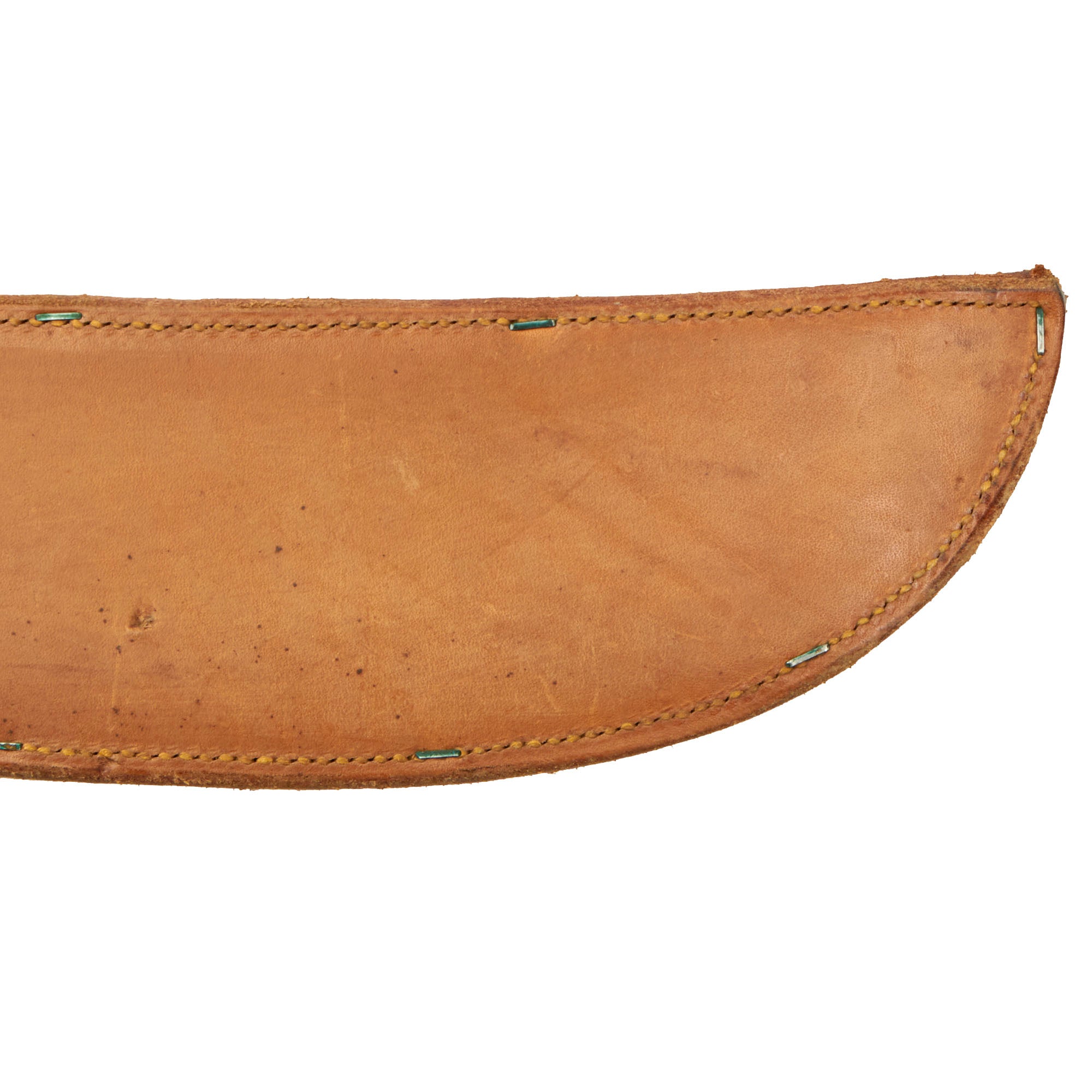 The black hard plastic grips are in good condition, with the expected wear of age, and all the rivets are solidly attached. The scabbard is a fantastic example of a hard to find leather one. The construction is still solid with deep markings for Milwaukee Saddlery Co. 1942.