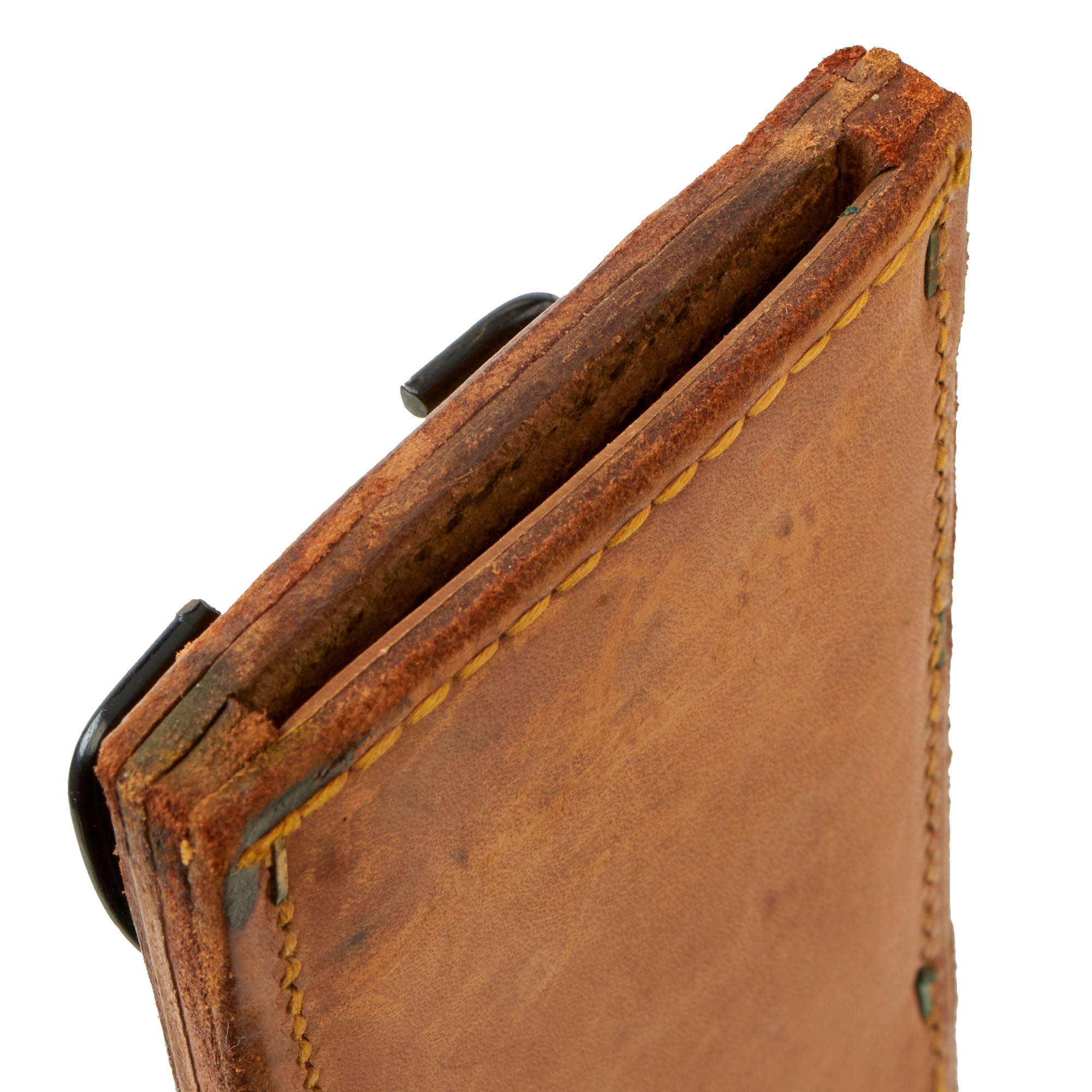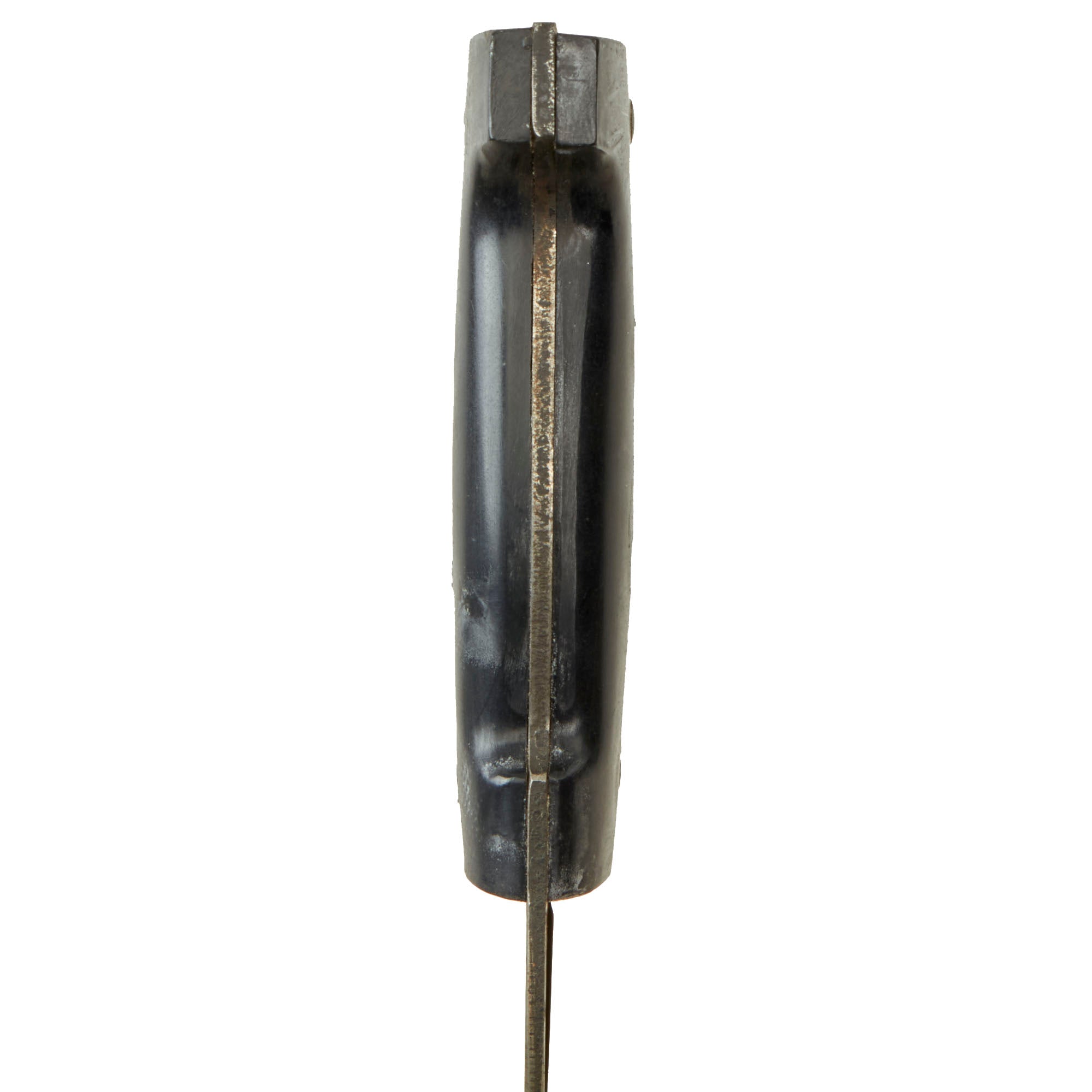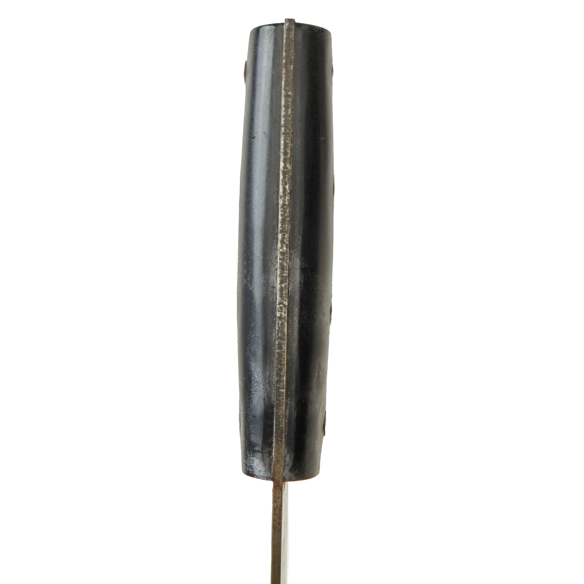 The black hard plastic grips are in good condition, with the expected wear of age, and all the rivets are solidly attached. The scabbard is a fantastic example of a hard to find leather one. The construction is still solid with deep markings for Milwaukee Saddlery Co. 1942.