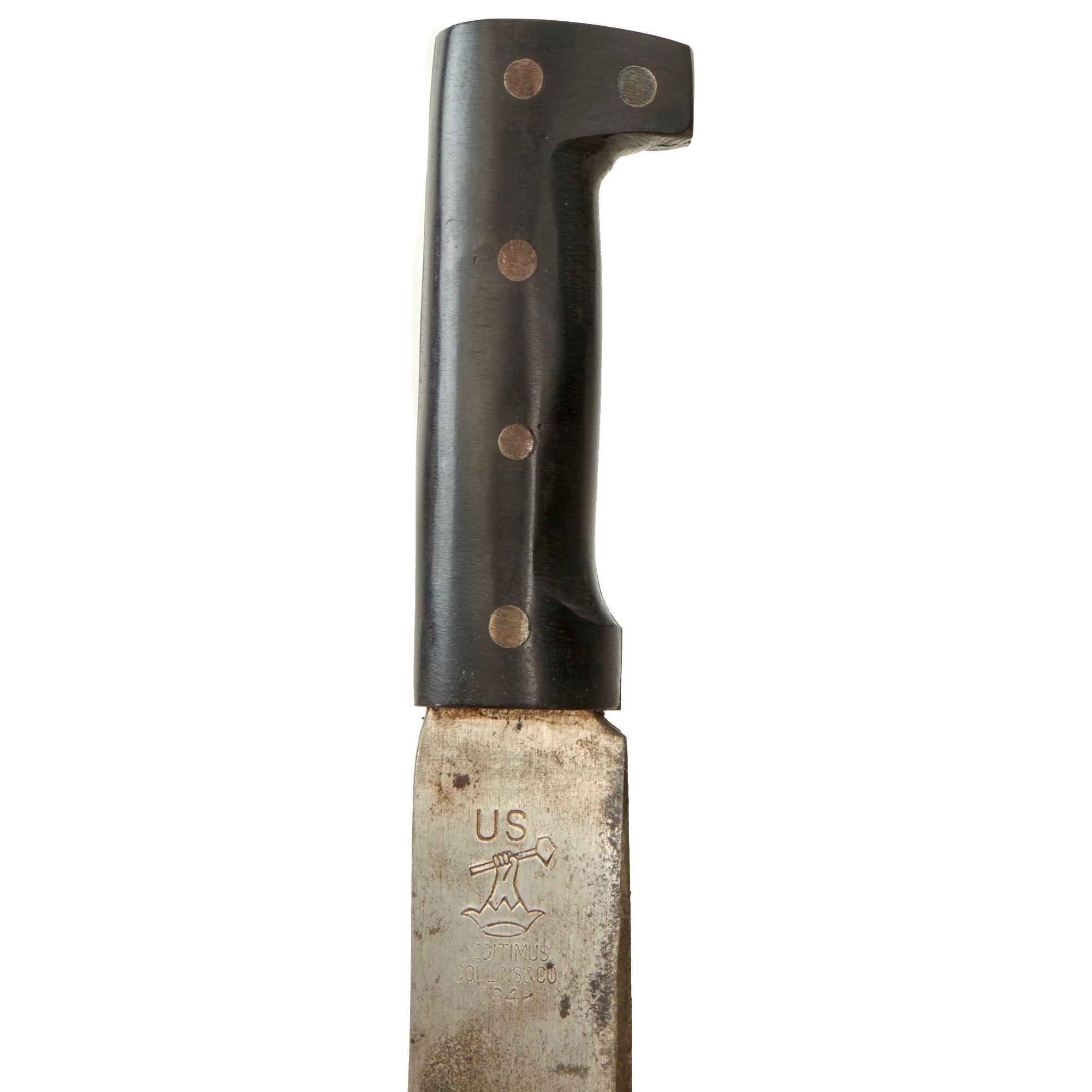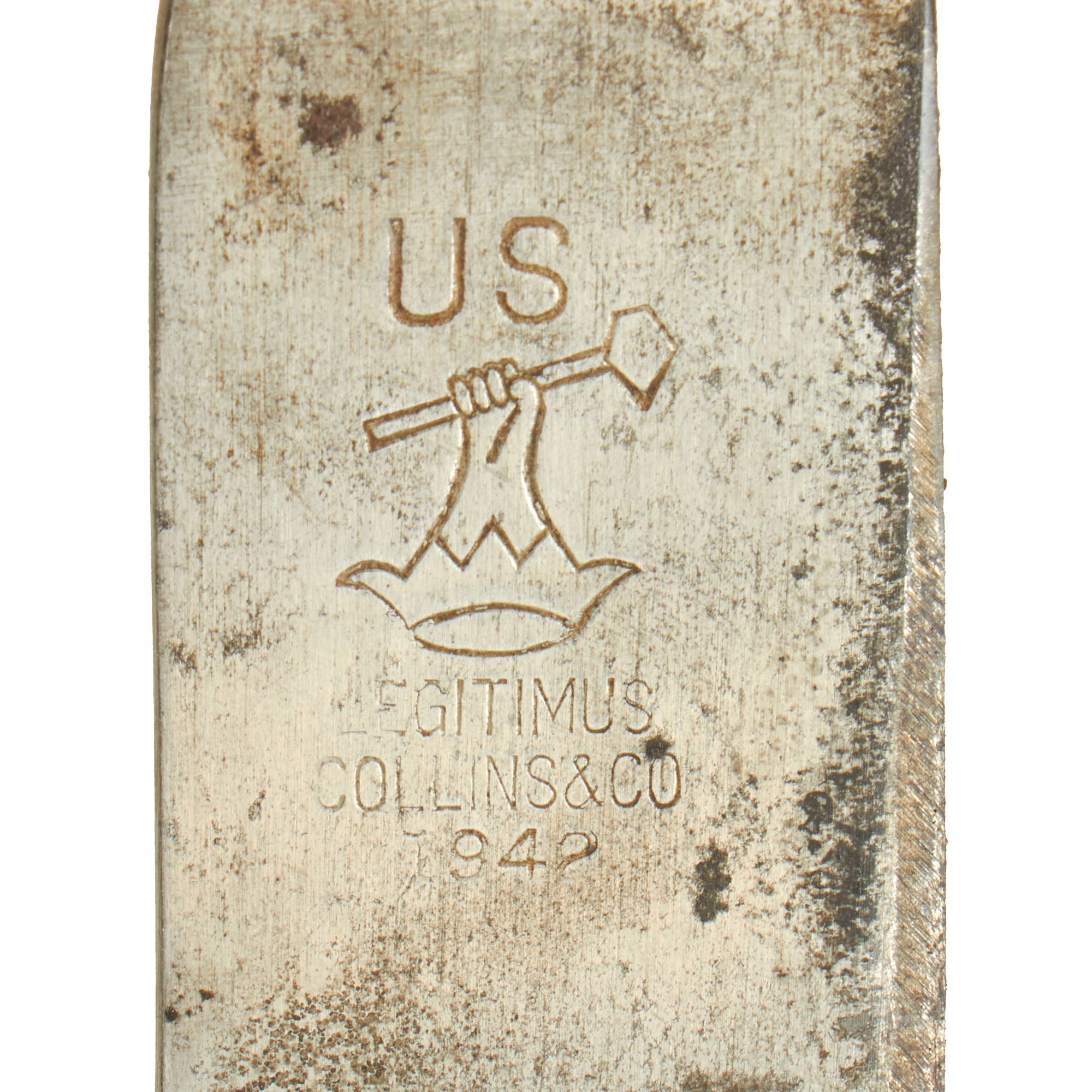 These long machetes are hard to come by on today's market. Made by Collins & Co. of Hartford, Conn, this is a LEGITIMUS model long jungle machete. The Machete has an impressive overall length of 27 inches, with a straight 22 inch Bush/Collins machete shape blade. The ricasso is nicely marked on one side: