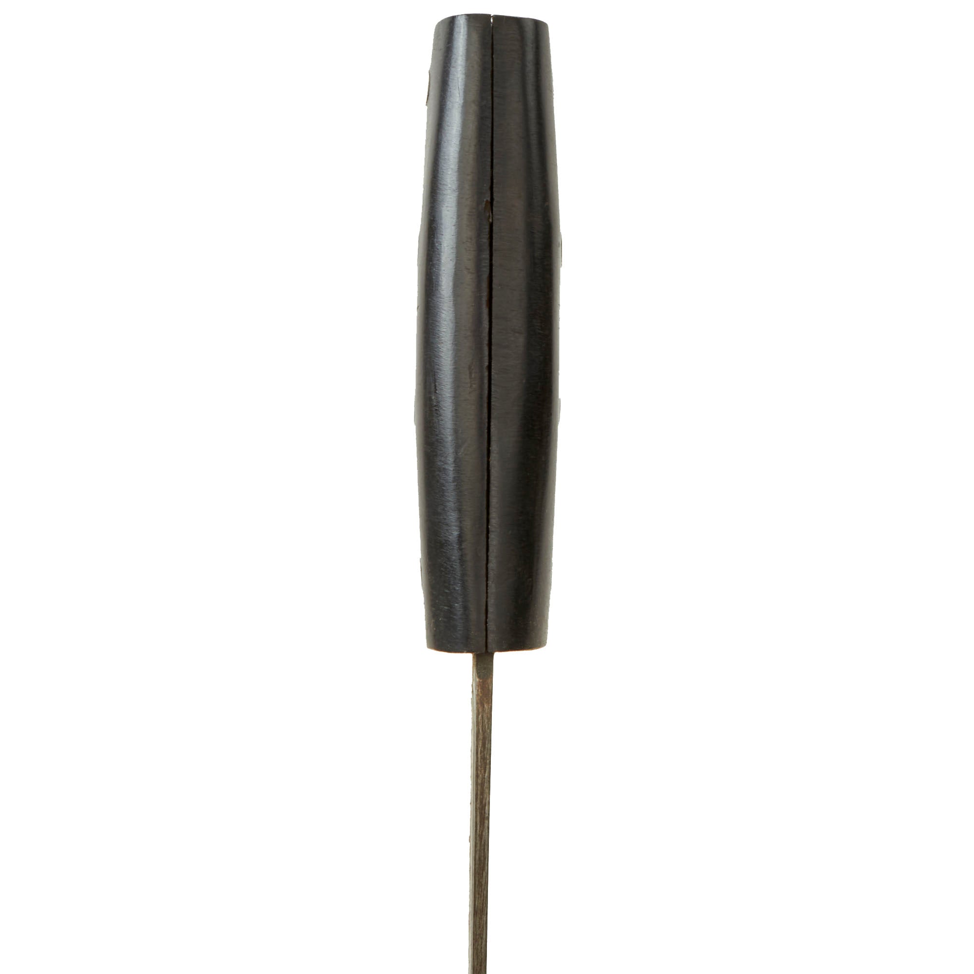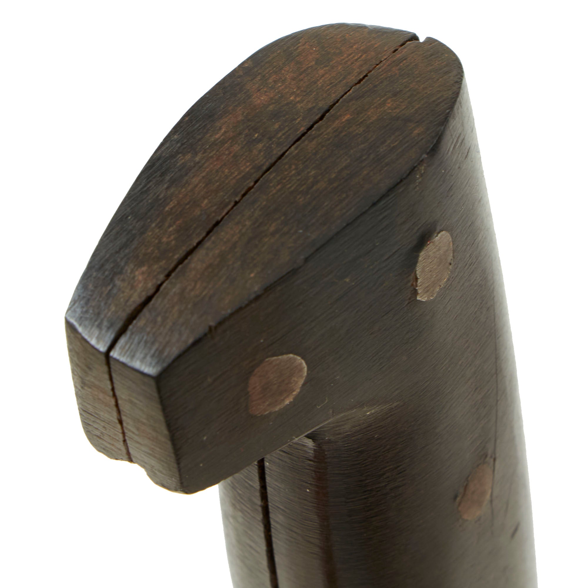 The black hard plastic grips are in good condition, with the expected wear of age, and all the rivets are solidly attached. The scabbard is a fantastic example of a hard to find leather one. The construction is still solid with deep markings for BOYT 1942.