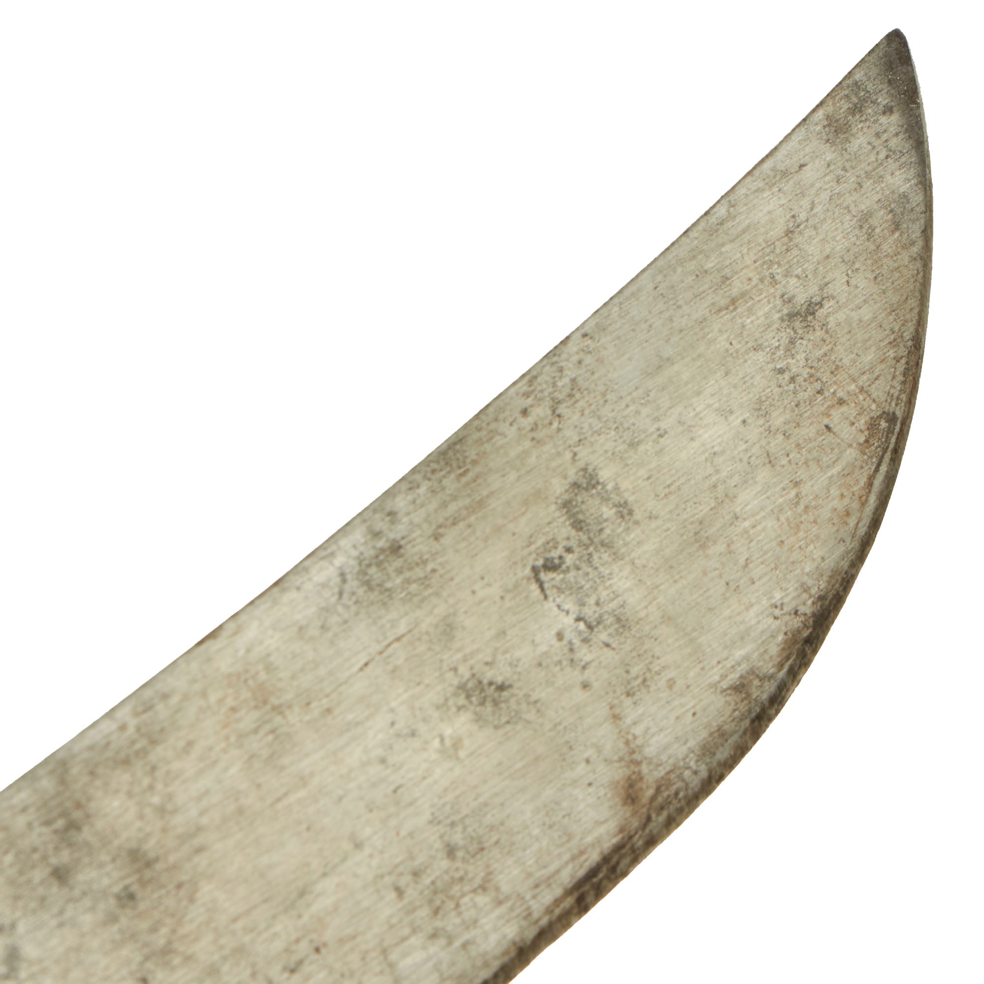 The blade is in good condition, though it does show some use, staining, pitting and surface oxidation. It has been sharpened several times, it is obvious that this was a machete that did not spend its life in the scabbard.