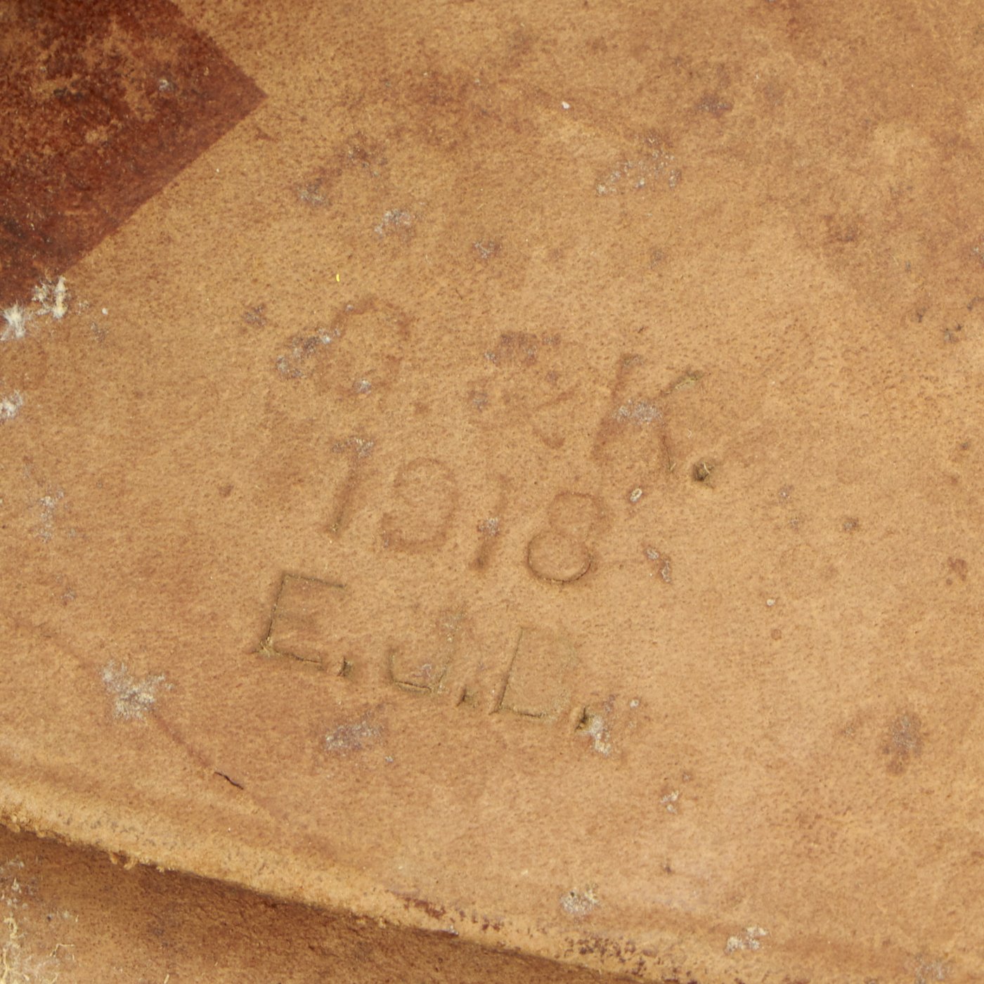 G.&K. is the marking of Graton & Knight Manufacturing Co., Worcester, Massachusetts, who also made many holsters during WWI. The leather carrier is in very good condition, and the leather looks almost unissued. It was most likely in storage until the start of WWII, when it was reissued with the Jeep Axe. It does have a gear in the bottom, and the leather around the studs has deteriorated a bit. There is also some cracking in the leather securing strap.