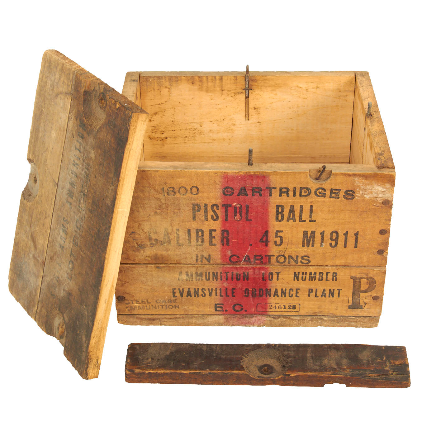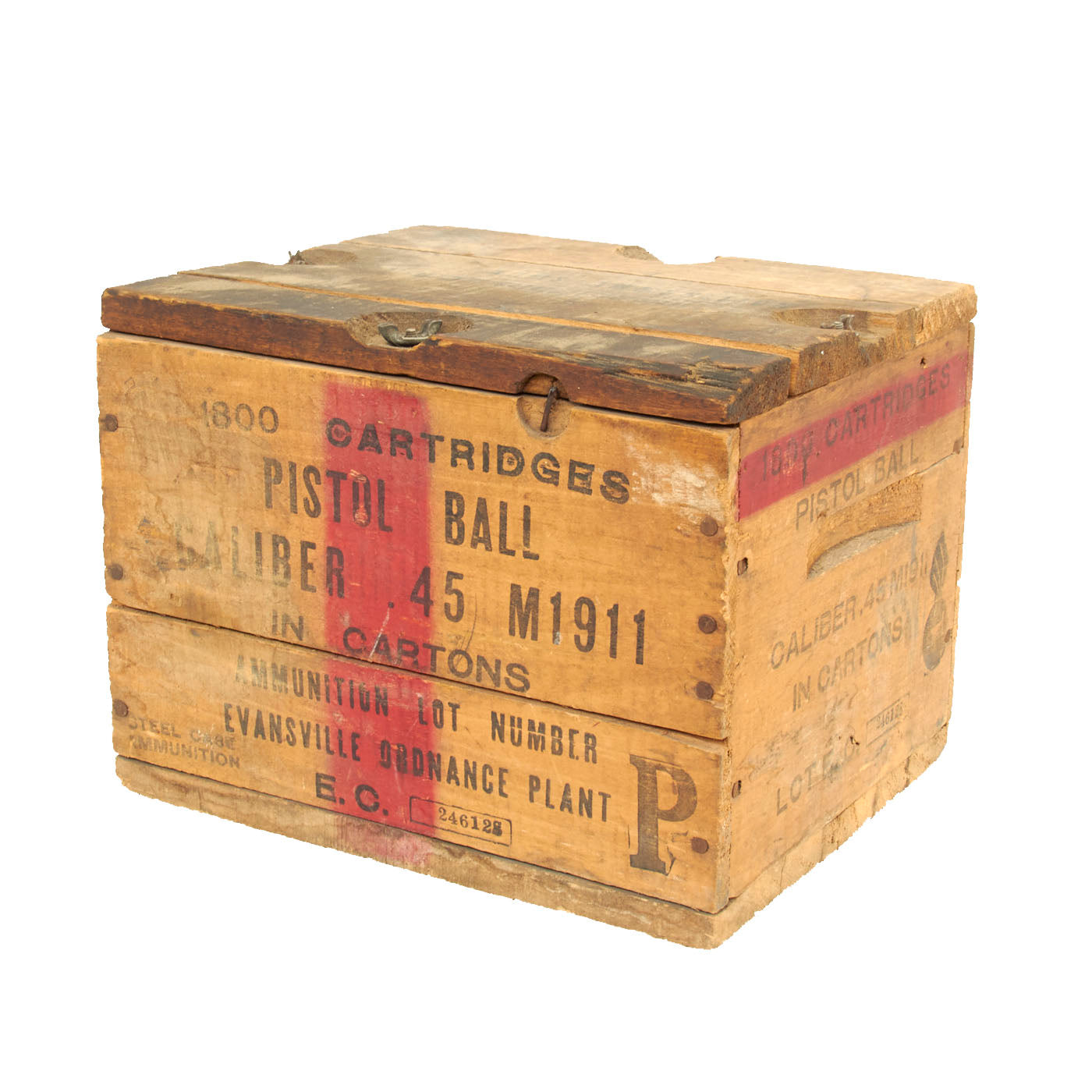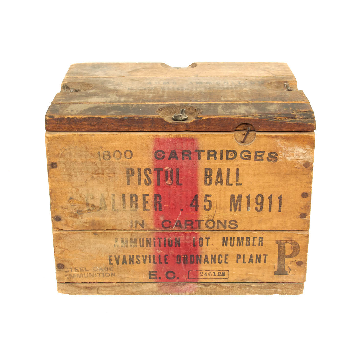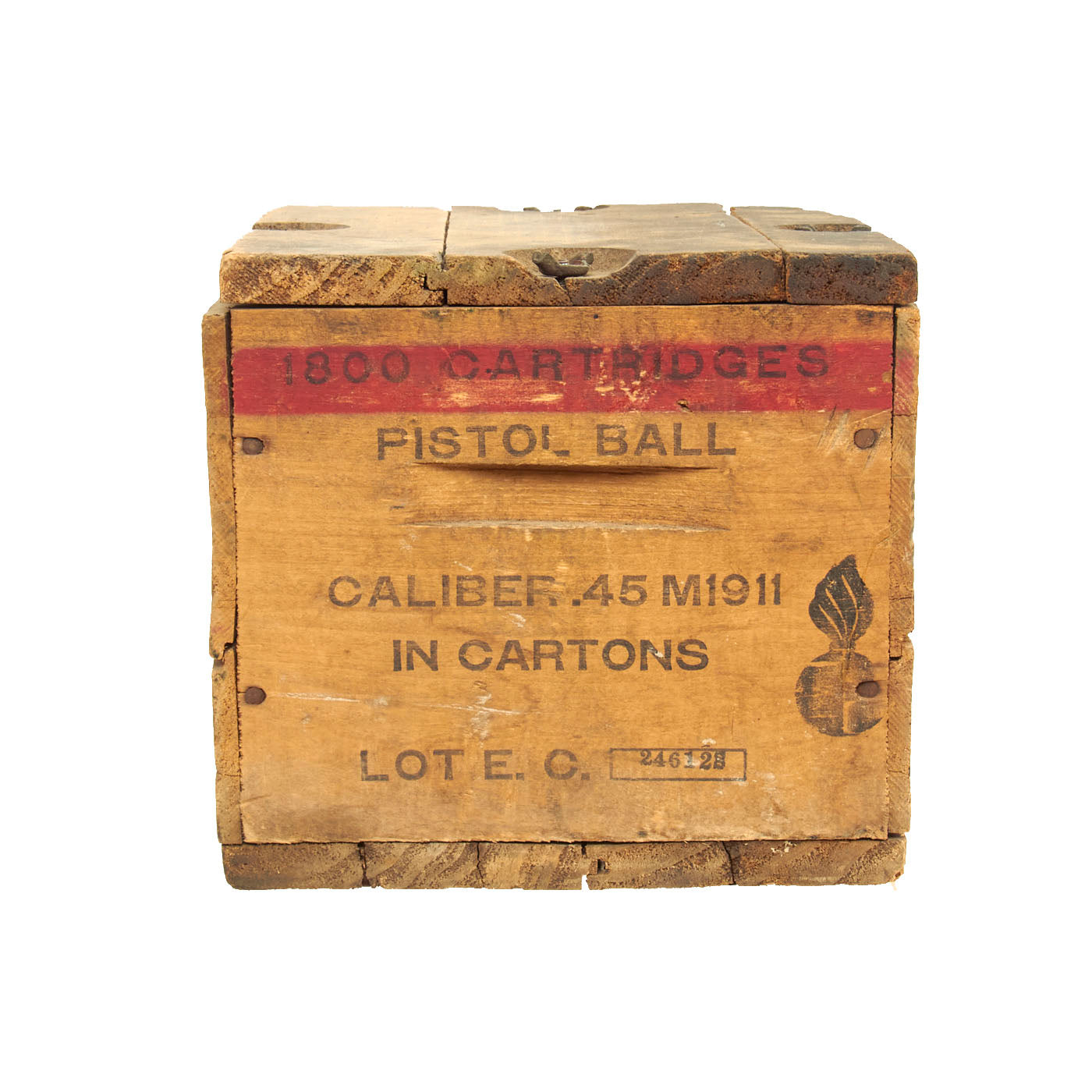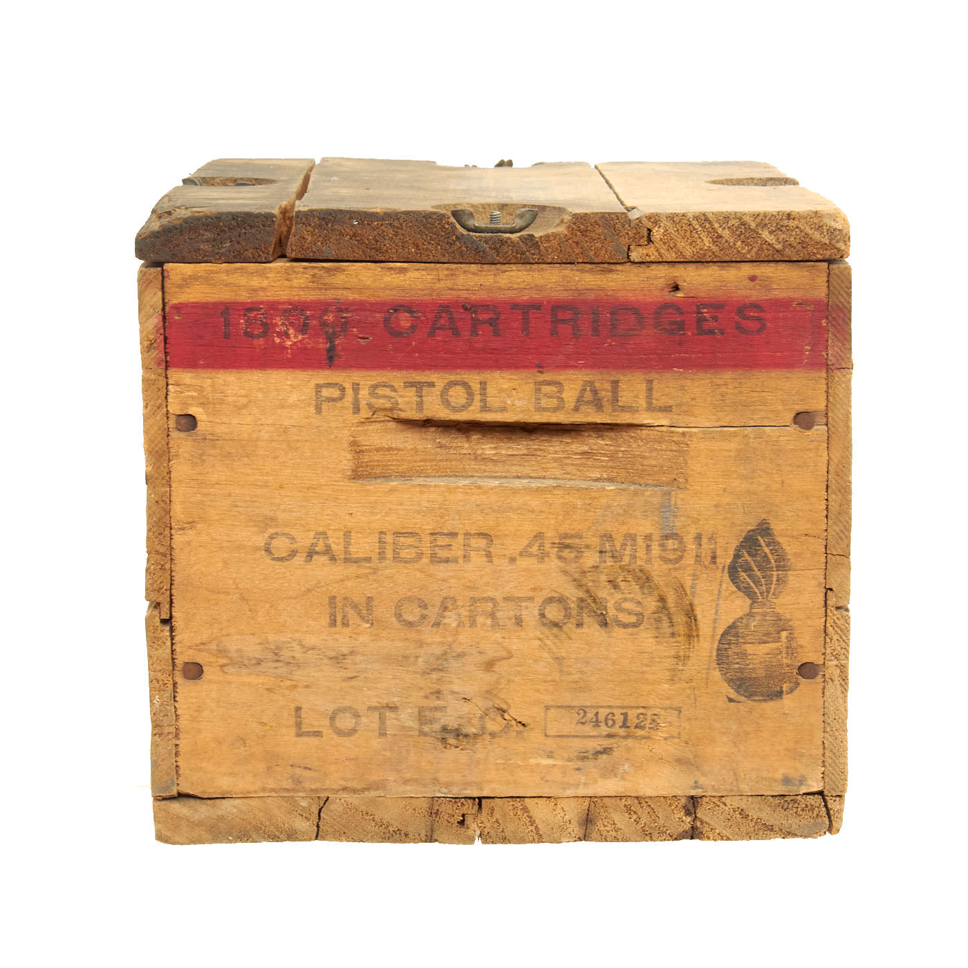 Original Item: Only One Available. This is a very nice WWII Issue ammunition crate for .45ACP ammunition for the Colt M1911 semi-automatic pistol. The front side has the complete information regarding the contents, which is also on the other sides, but with some information left out: