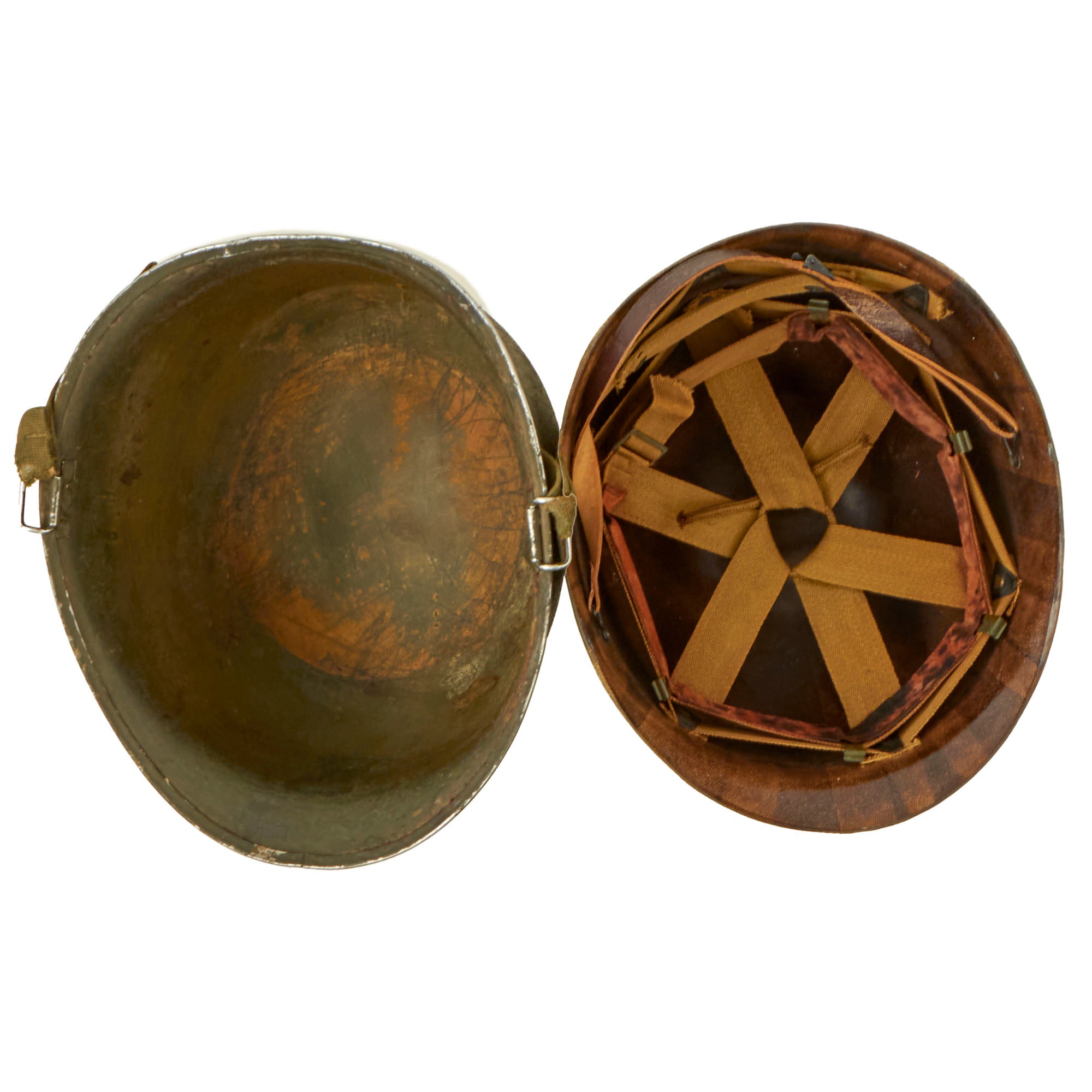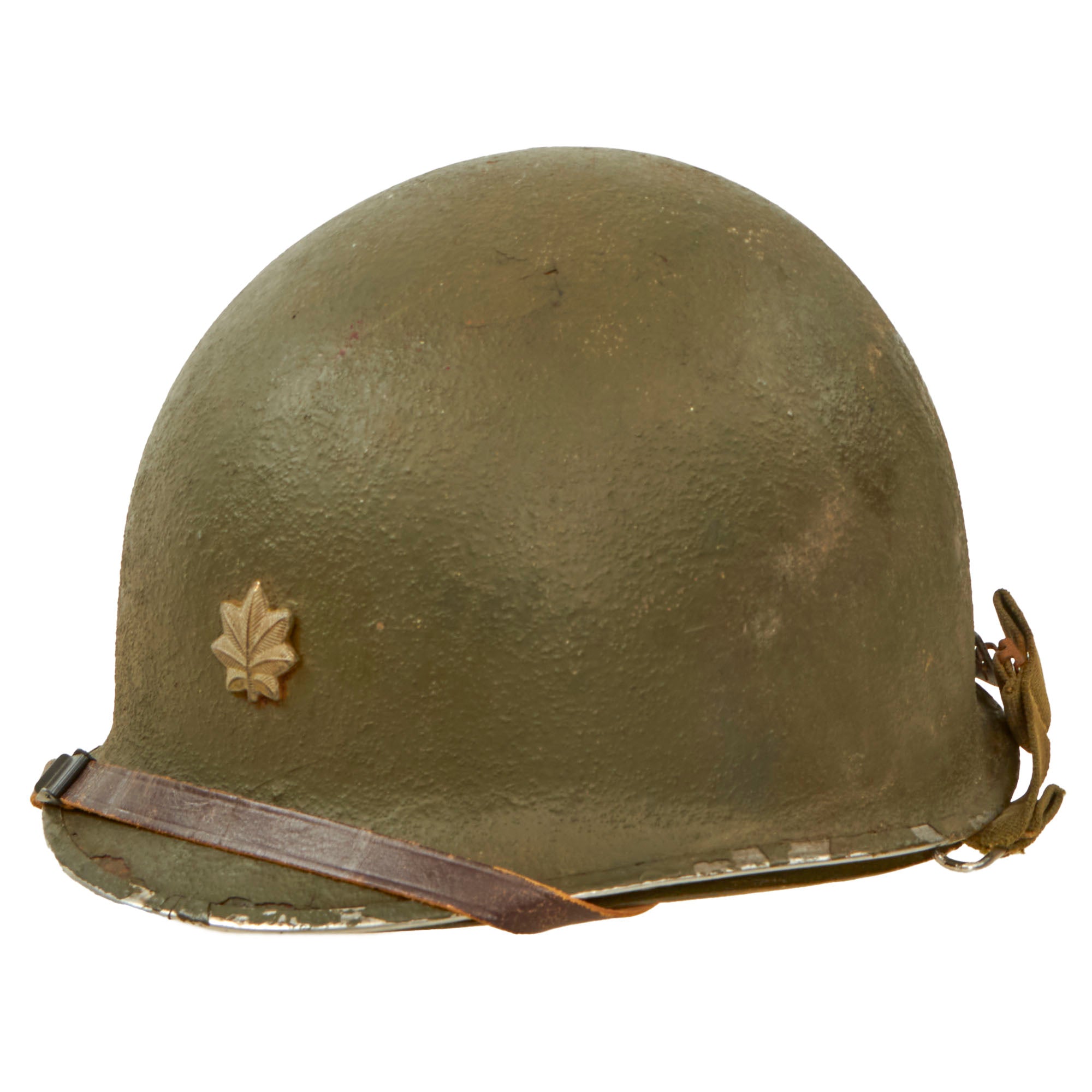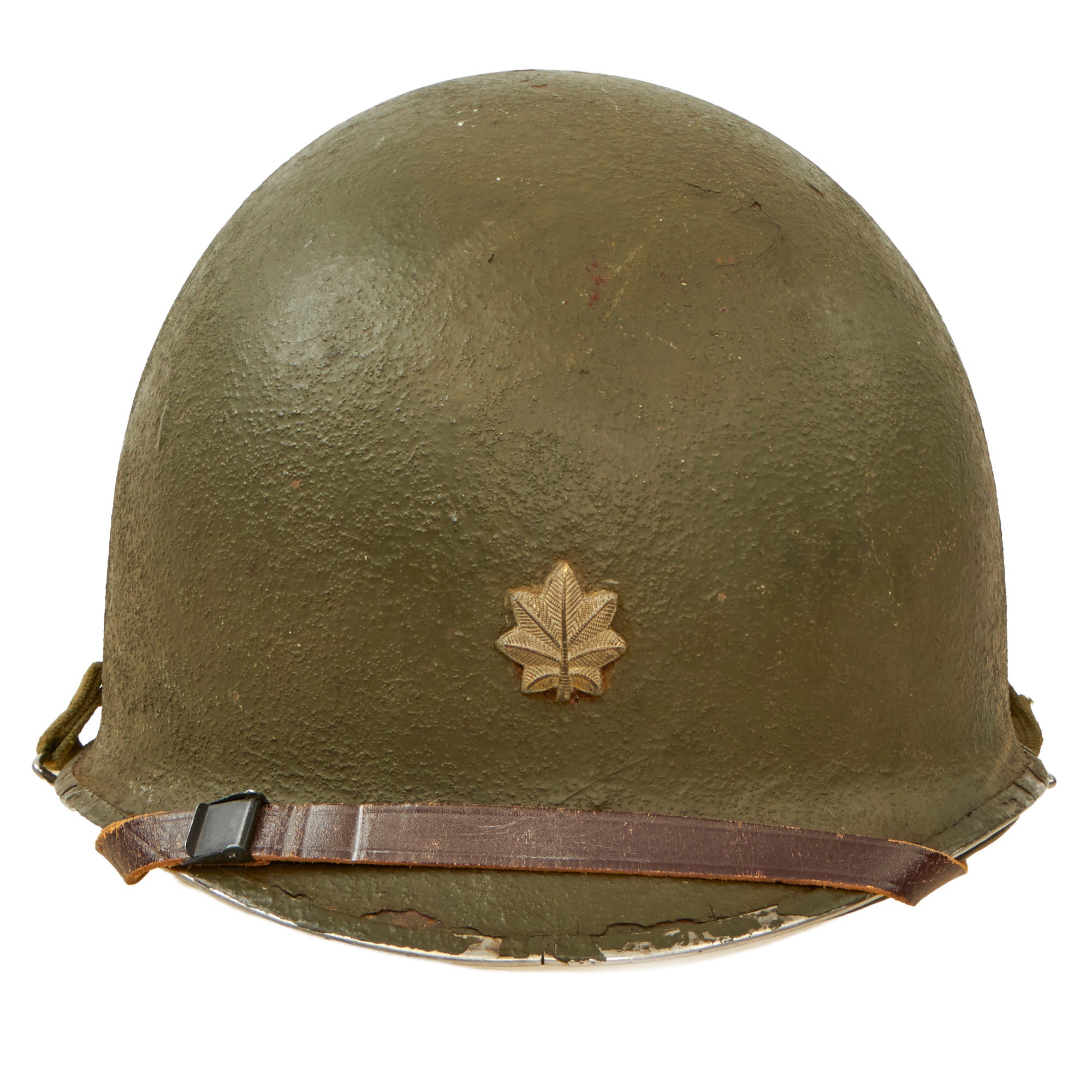 This helmet is a fine example and still retains all of its original WW2 parts and the shell has all original "corked" grain paint with front seam and swivel bails. The front of the helmet has a lovely bronze colored Major’s oak leaf rank insignia that was brazed to the front. The liner has the same insignia attached to the front, making this a fantastic matching set.