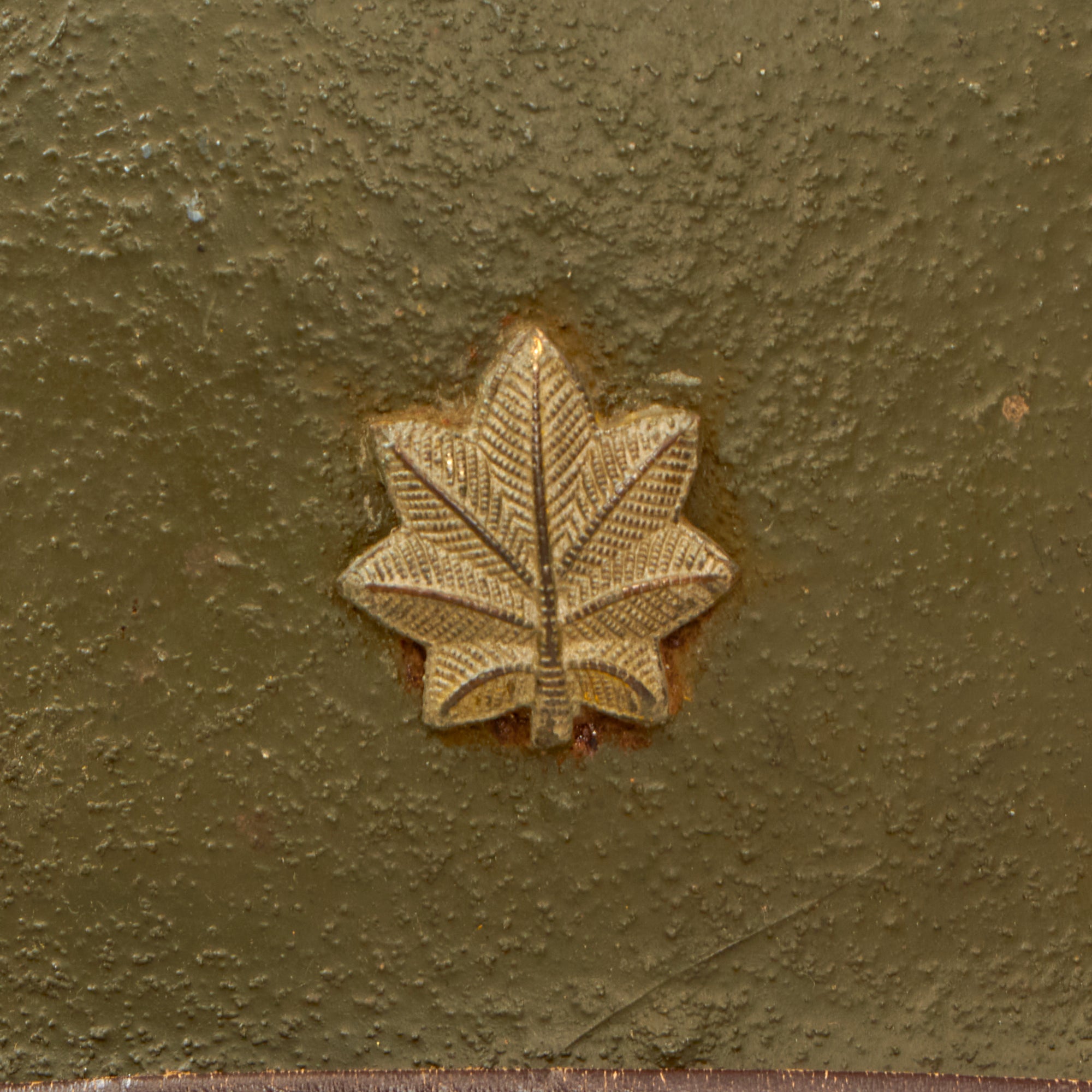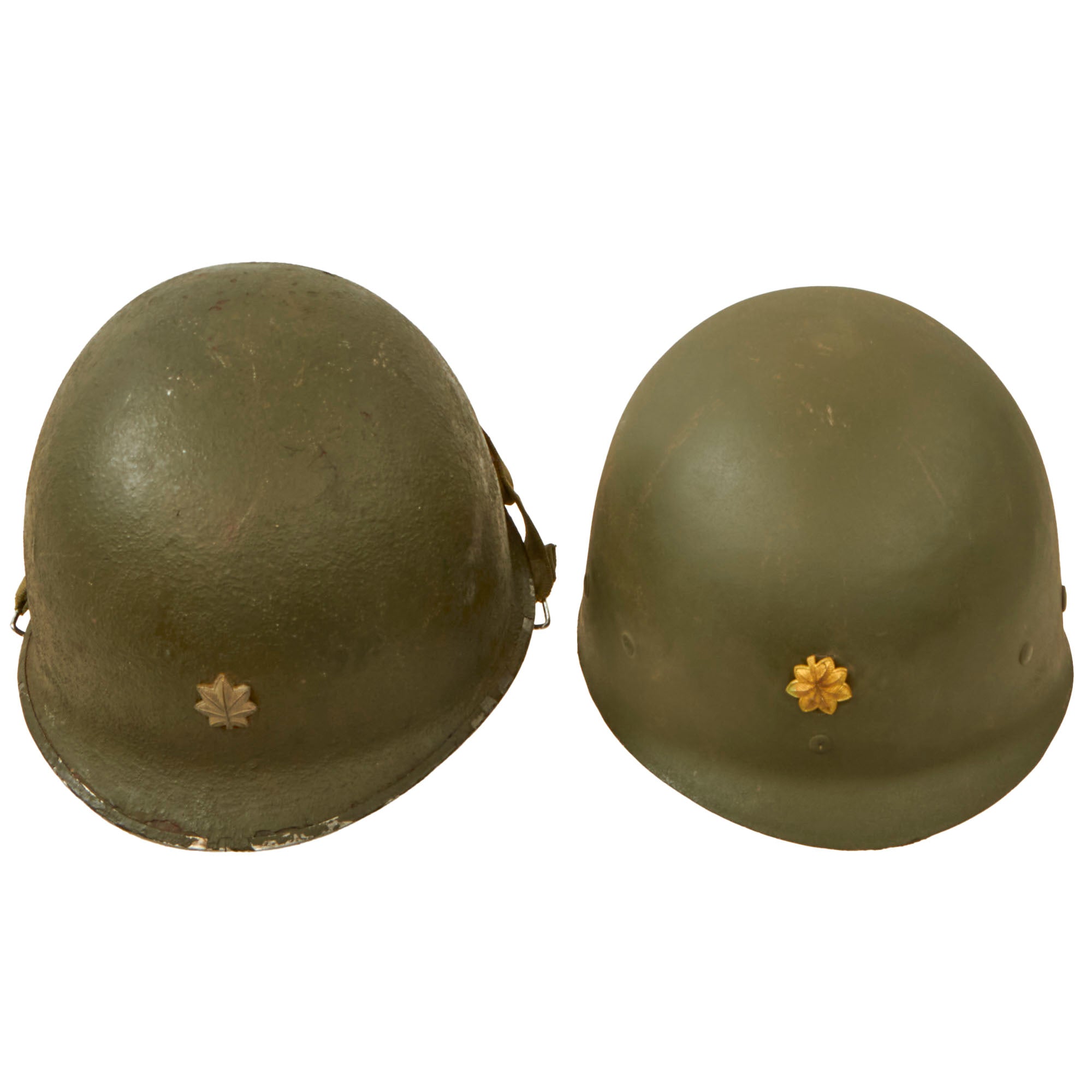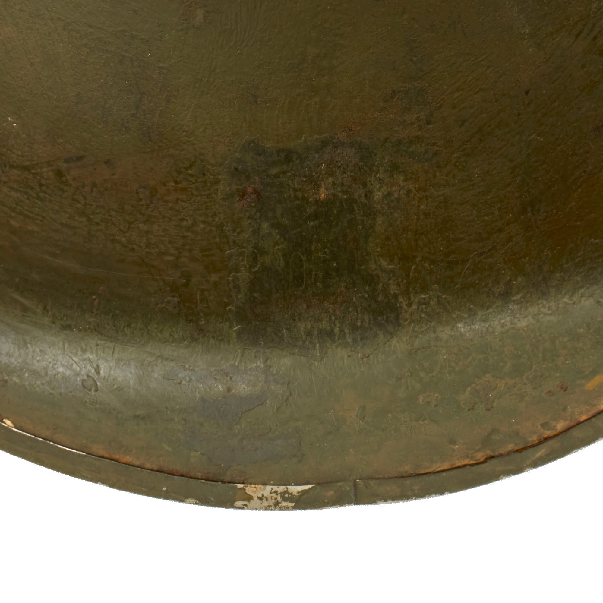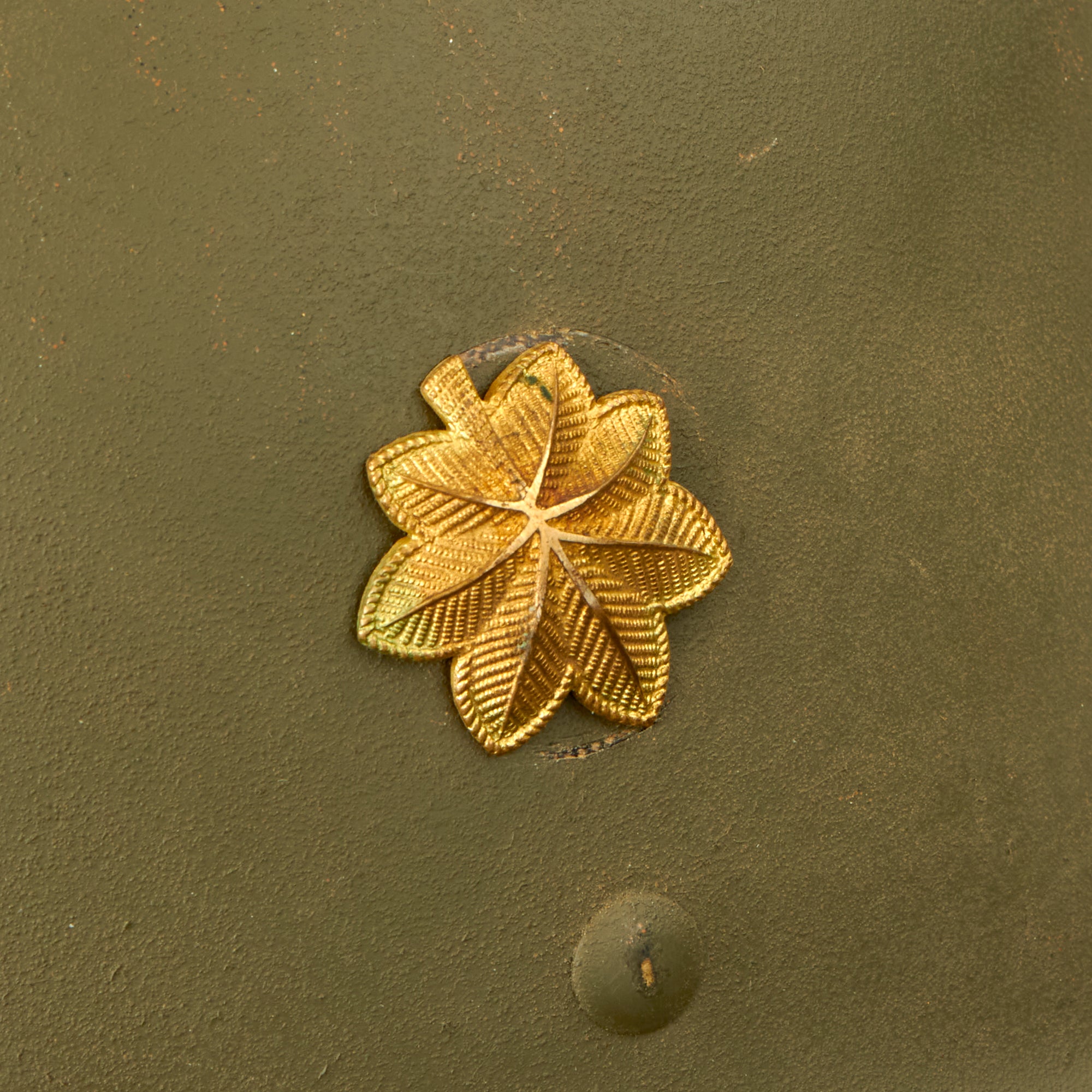 This helmet is a fine example and still retains all of its original WW2 parts and the shell has all original "corked" grain paint with front seam and swivel bails. The front of the helmet has a lovely bronze colored Major’s oak leaf rank insignia that was brazed to the front. The liner has the same insignia attached to the front, making this a fantastic matching set.