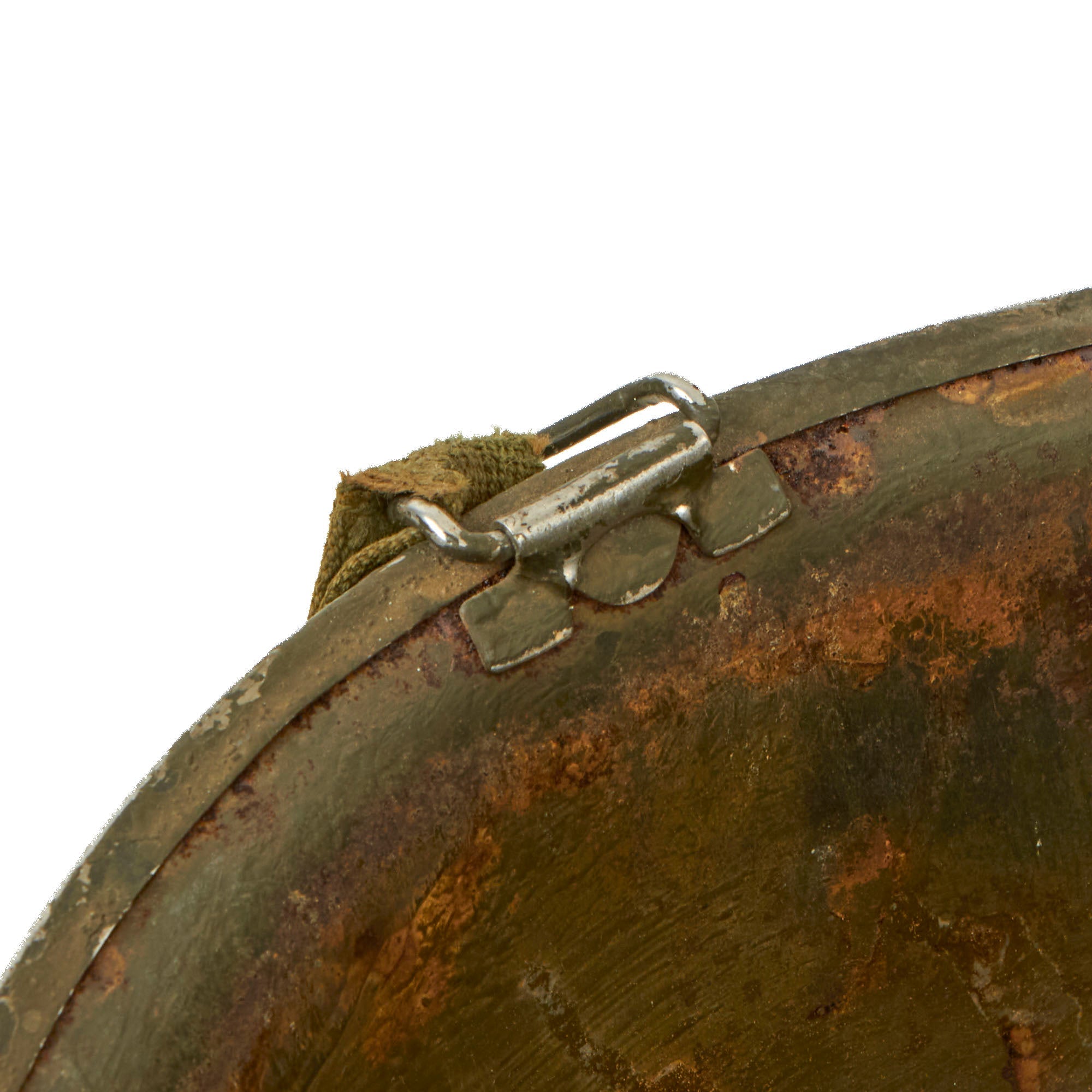 The early M-1 helmet shells had a set of fixed chinstrap loops called "bales" and a stainless steel rim. These rims were both rust resistant and had "non-magnetic qualities" that reduced the chance of error readings when placed around certain sensitive equipment (such as a compass). In late 1943, a set of bales which swiveled were introduced, which reduced the risk of breakage like the earlier fixed bales. This particular helmet is of the swivel bale variety, with OD#7 chinstraps fitted with a stamped steel buckle.