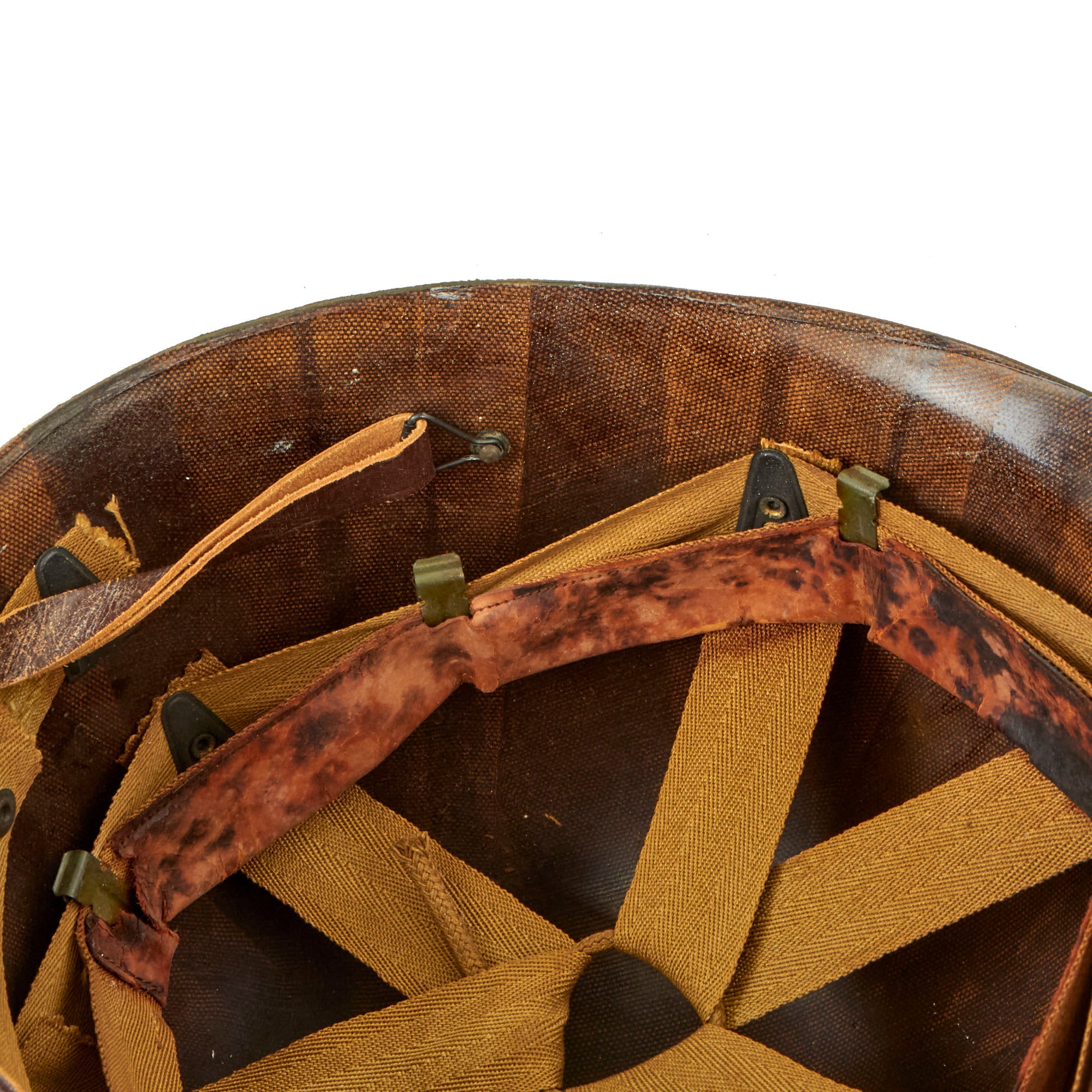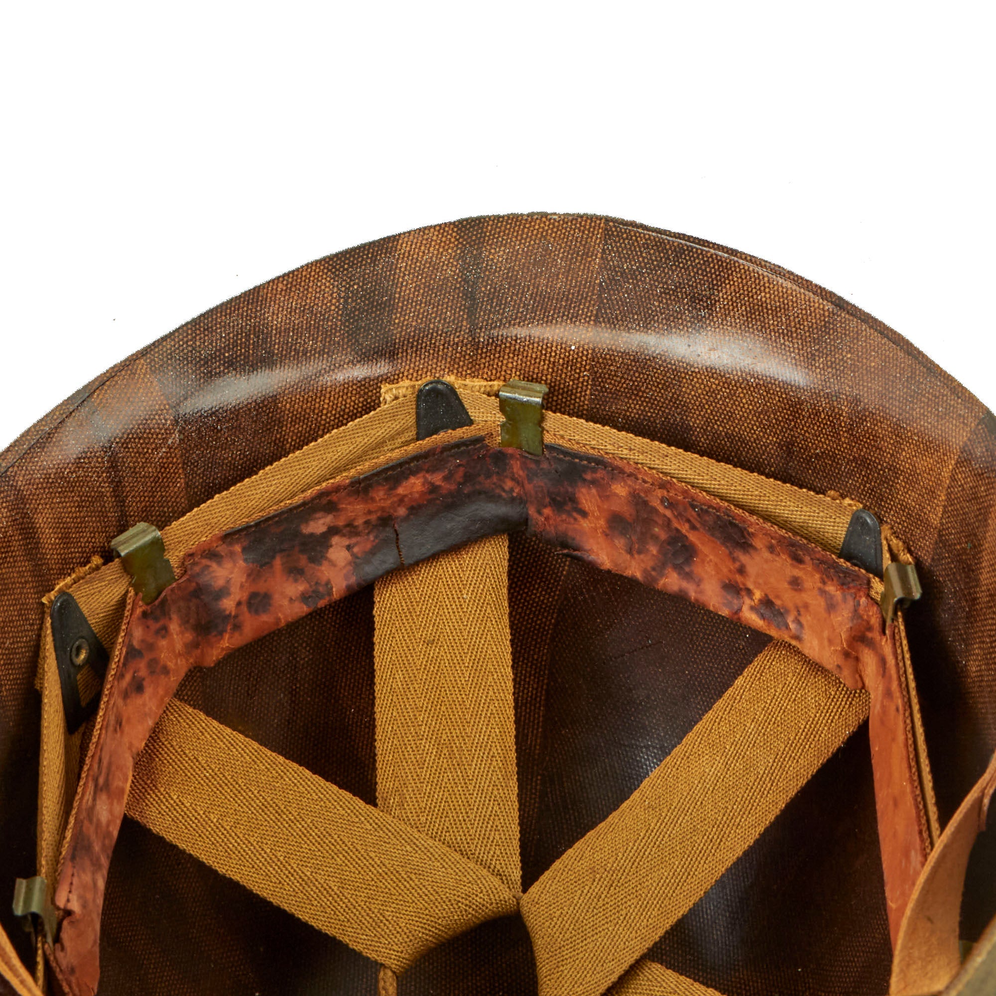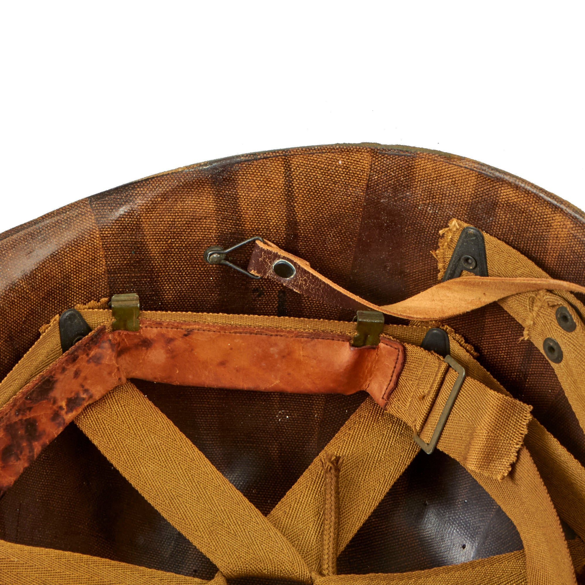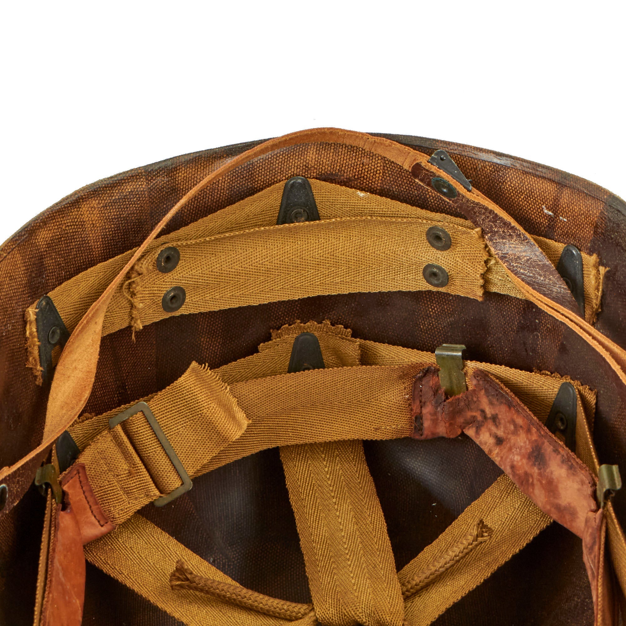 This true US WWII M-1 helmet liner can be identified through the frontal eyelet hole. Other correct WW2 features include cotton herringbone twill (HBT) cloth suspension. This HBT suspension is held tightly within the M-1 helmet liner by rivets and a series of triangular "A" washers. The three upper suspension bands are joined together with the correct string, but some of the suspension is ripping as shown. This way the wearer could adjust the fit. The original leather chin strap is present but heavily cracking, and the sweatband shows heavy dry rot damage. There is a lovely Major rank attached to the front of the liner, but it is a bit loose and spins around.