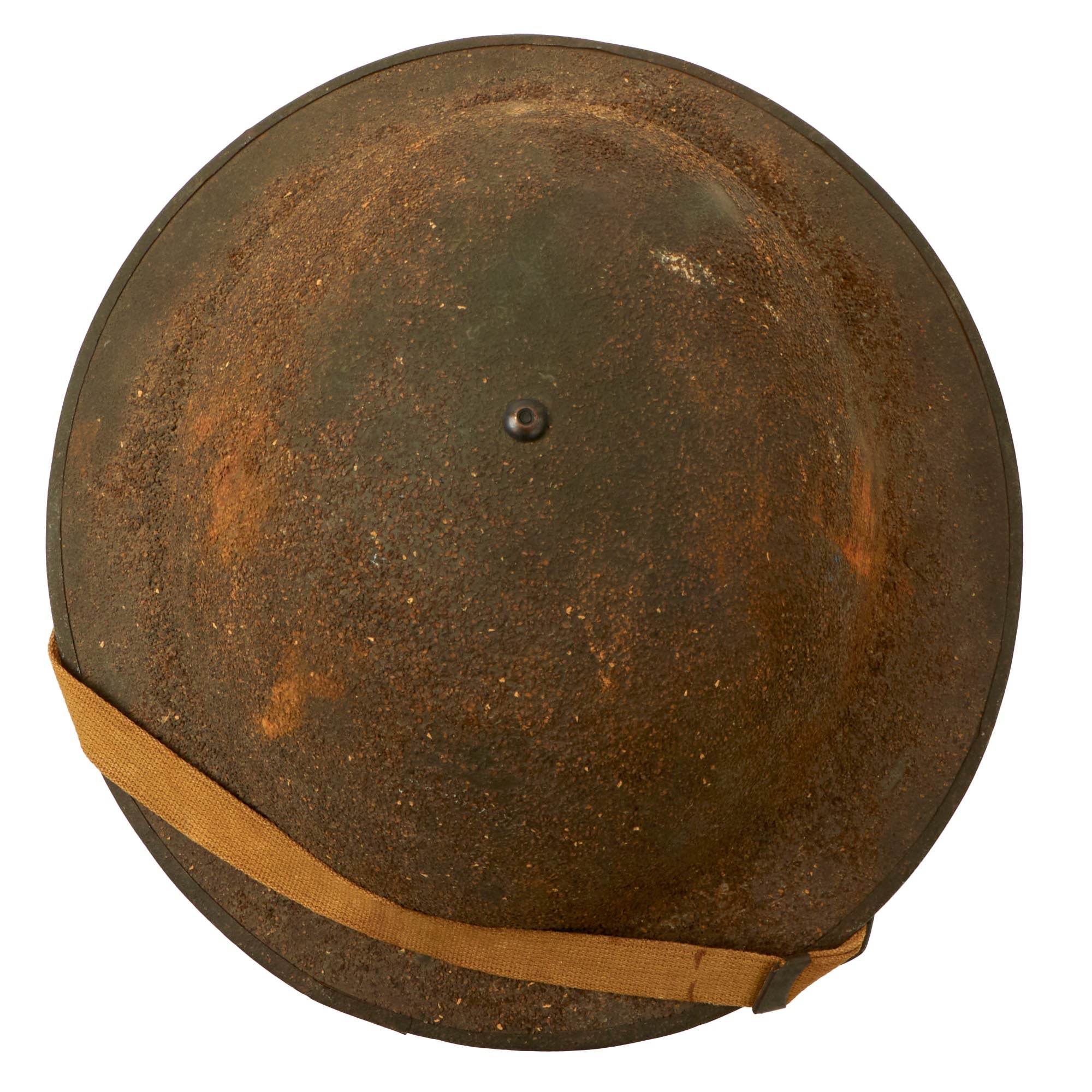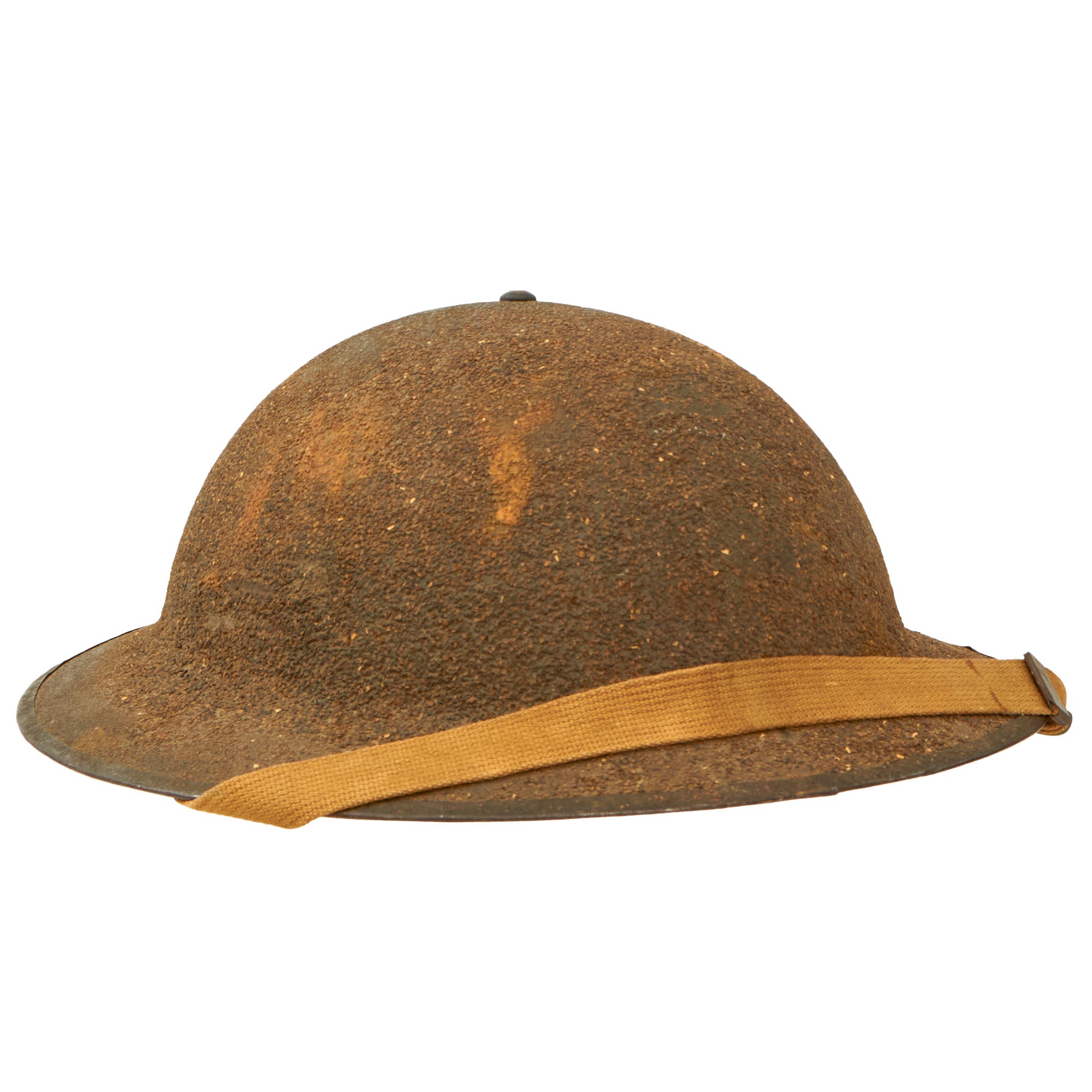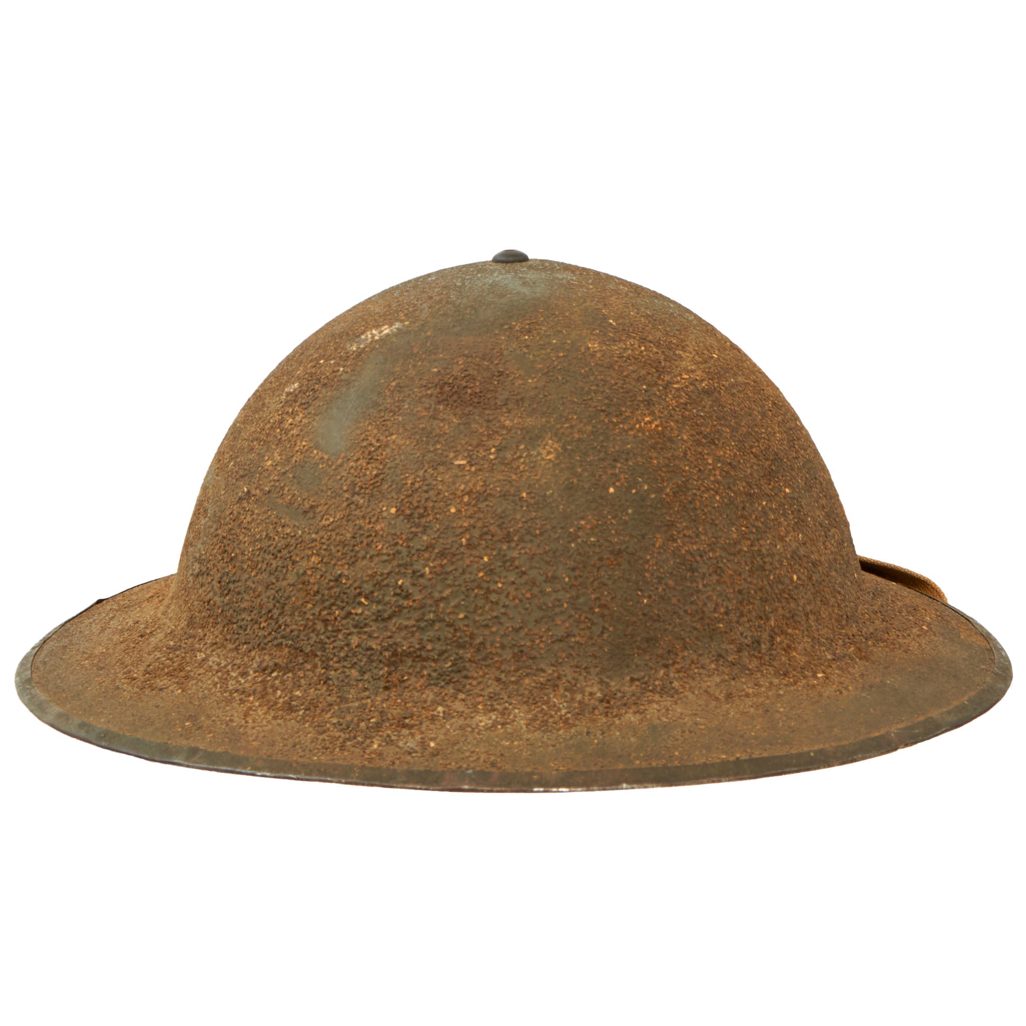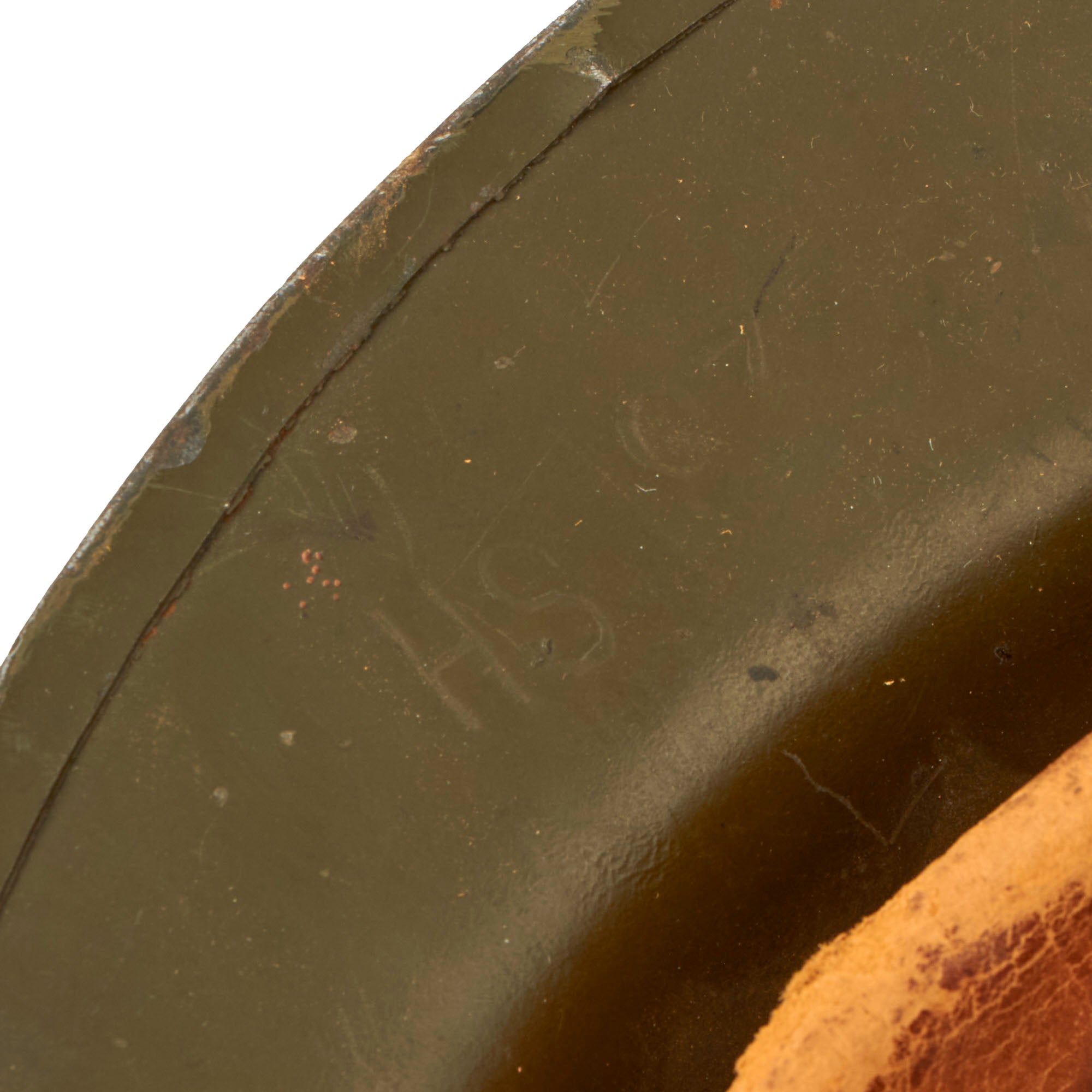 Original Item: Only One Available. This is a genuine, very nice WWII U.S. Army M1917A1 "Kelly" Helmet. The helmet is complete with the original liner, chin strap and the small leather skull pad that is often missing from these helmets is present. The shell has the original OD green paint mostly intact, including the textured "corked" exterior. This example was quite heavily coated with cork, which has now worn through in areas, giving it an attractive speckled appearance. The shell is stamped HS97 in the steel under the brim and is still very clear. The brim of the helmet does show minor “waves” and warping.