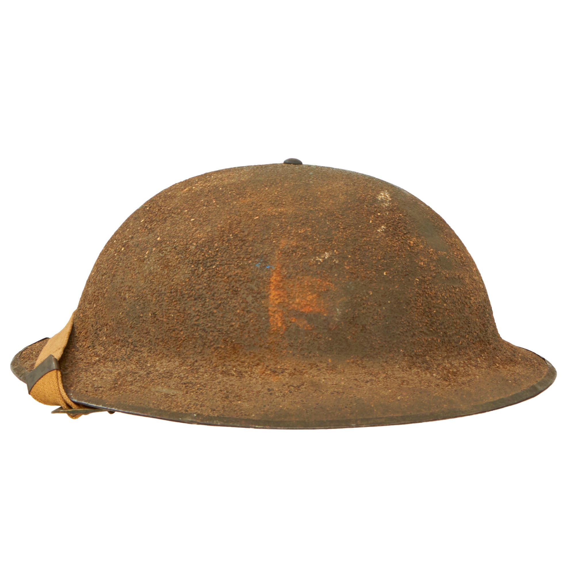 There is a bit of staining, but no tears and the brass buckle and clip are correct and intact. A great original early WWII helmet with lots of history.