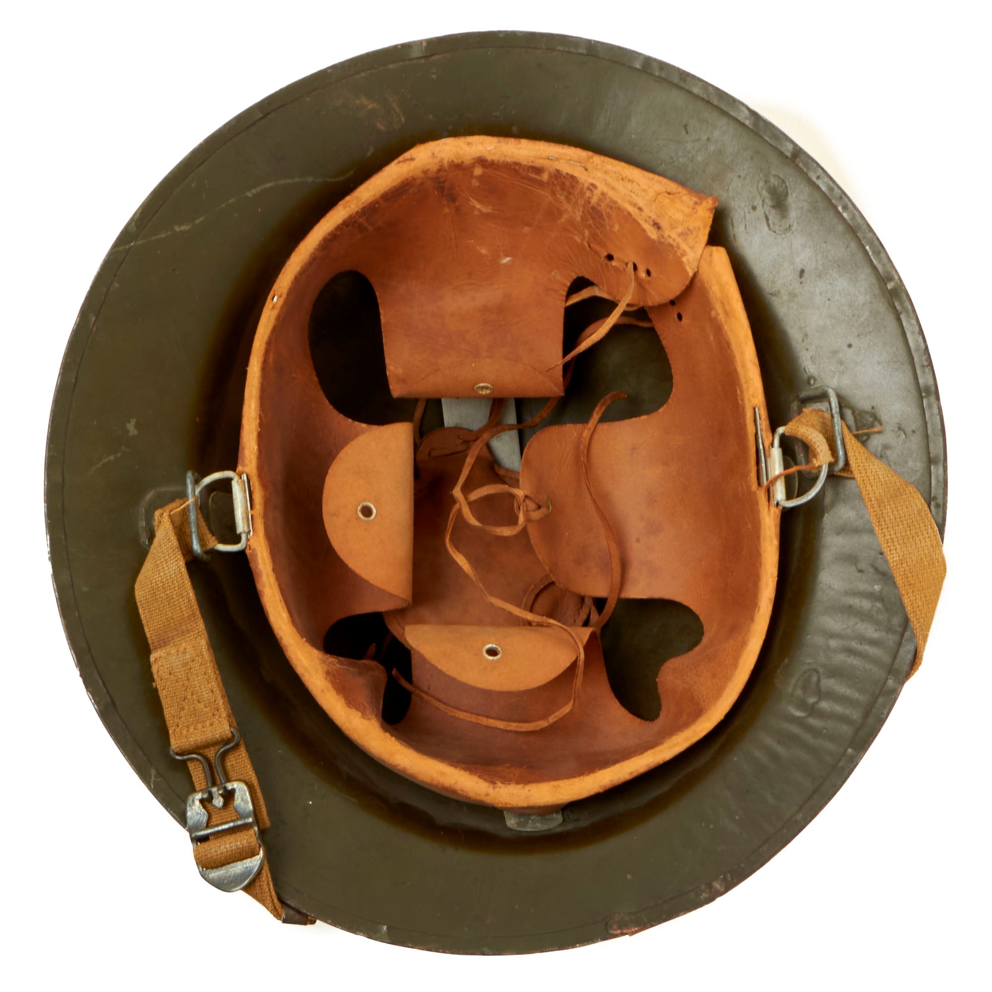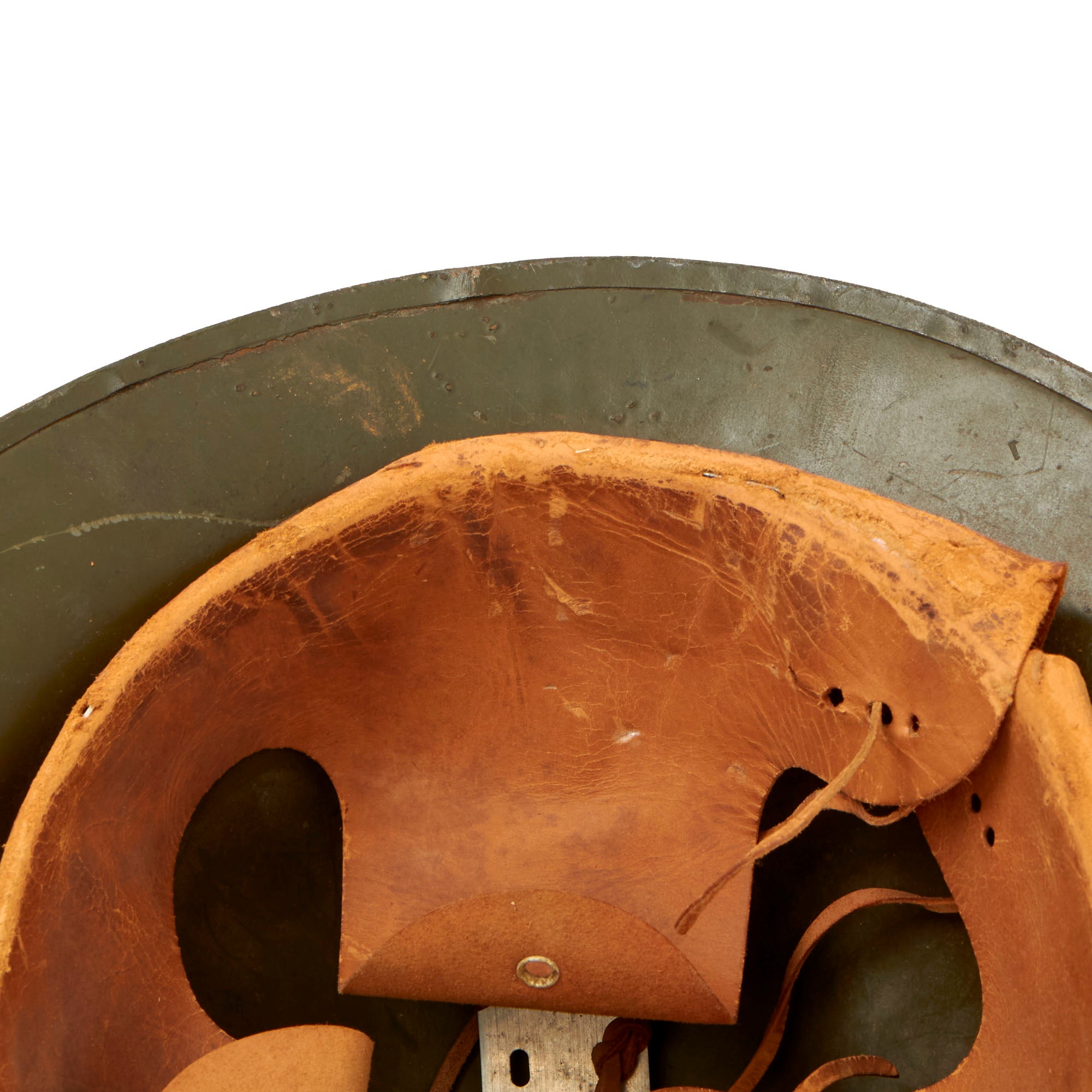 The original leather liner is completely intact, with light wear from age and service. There is some dry rot and tearing around the edge as shown, though the liner does not show much sign of use, just age. The felt padding under the liner is not present. Both of the ties for the top pad are intact, as well as the original top tie. The canvas chin strap is worn somewhat, but still solid.