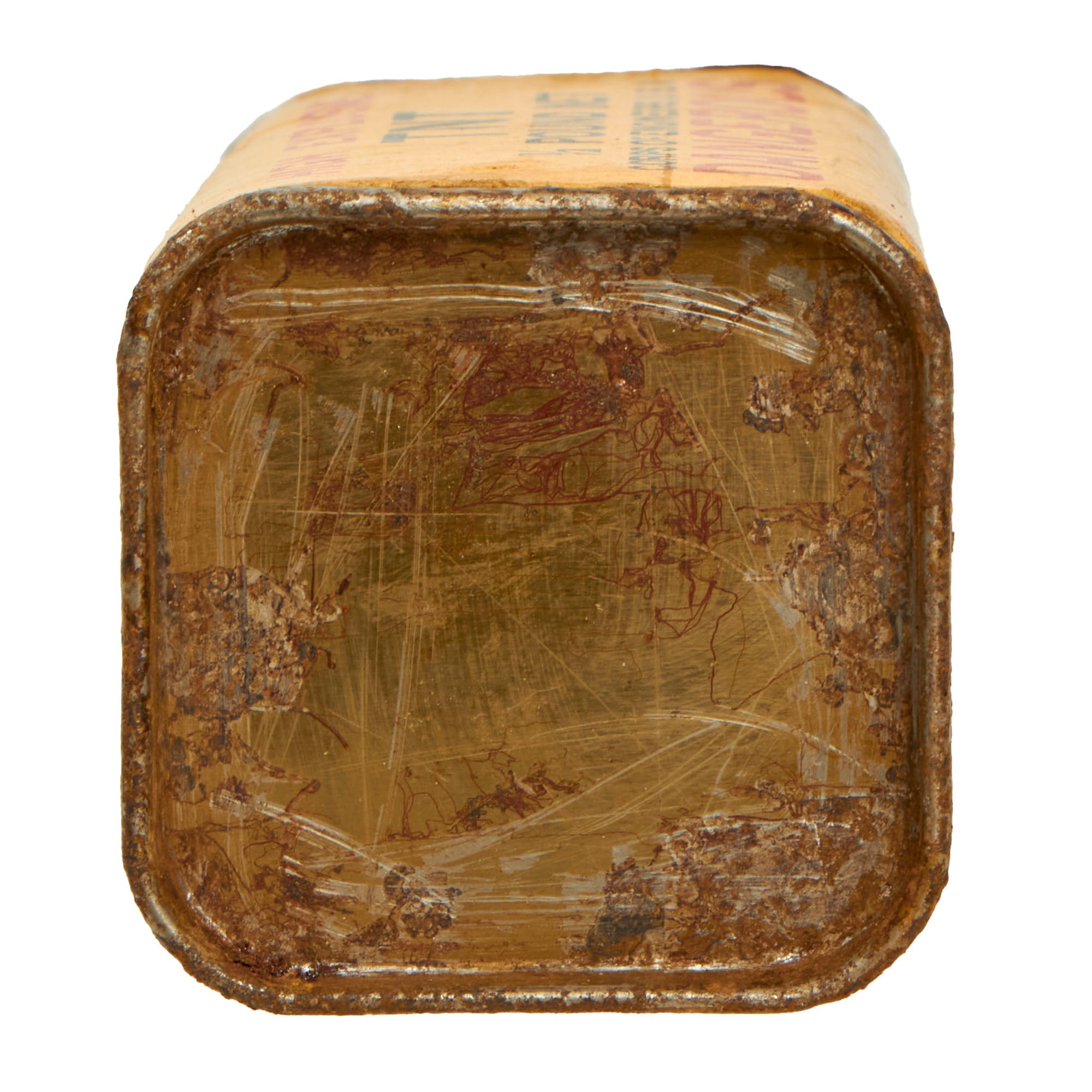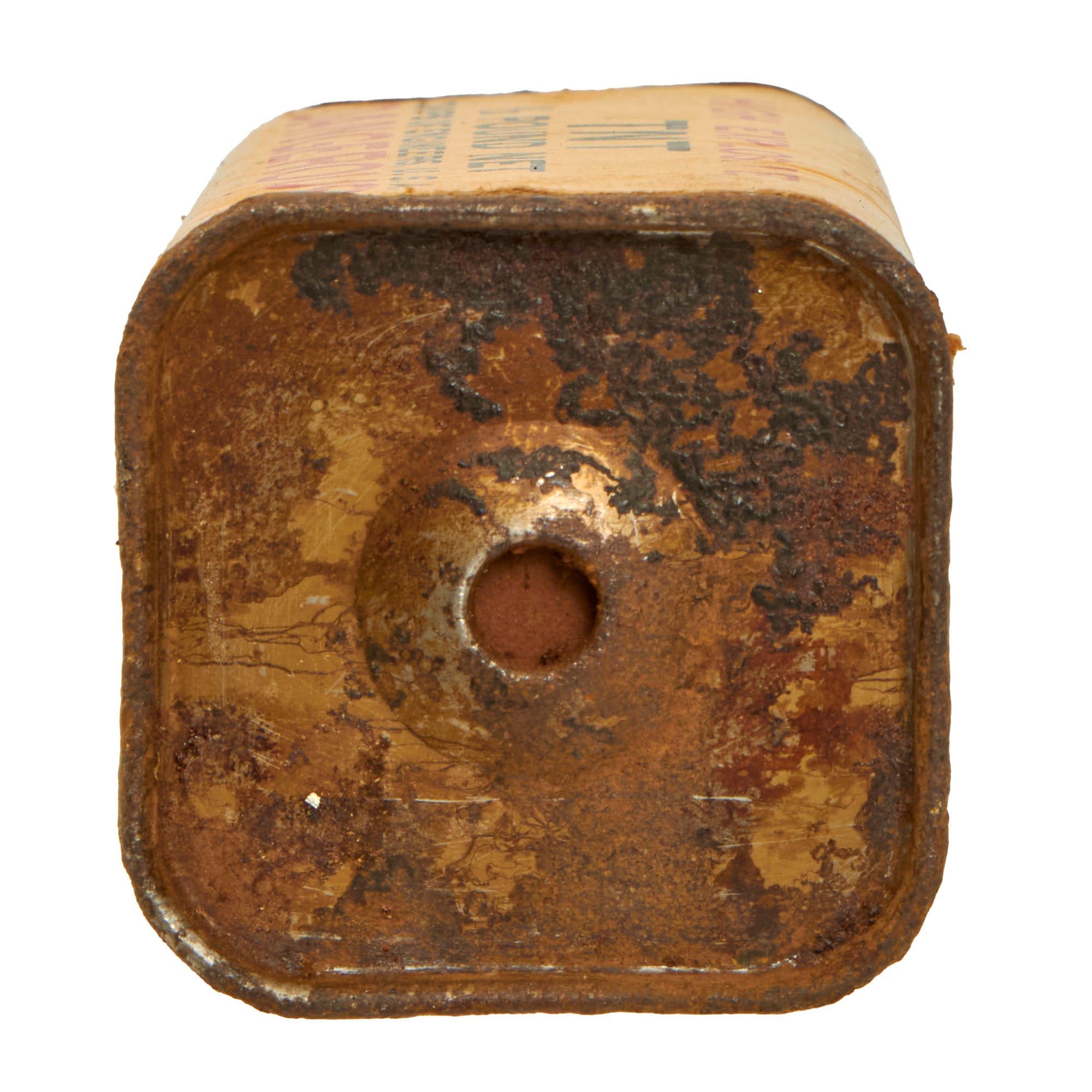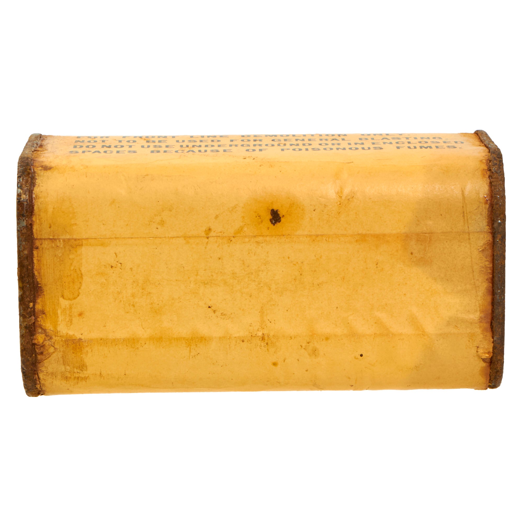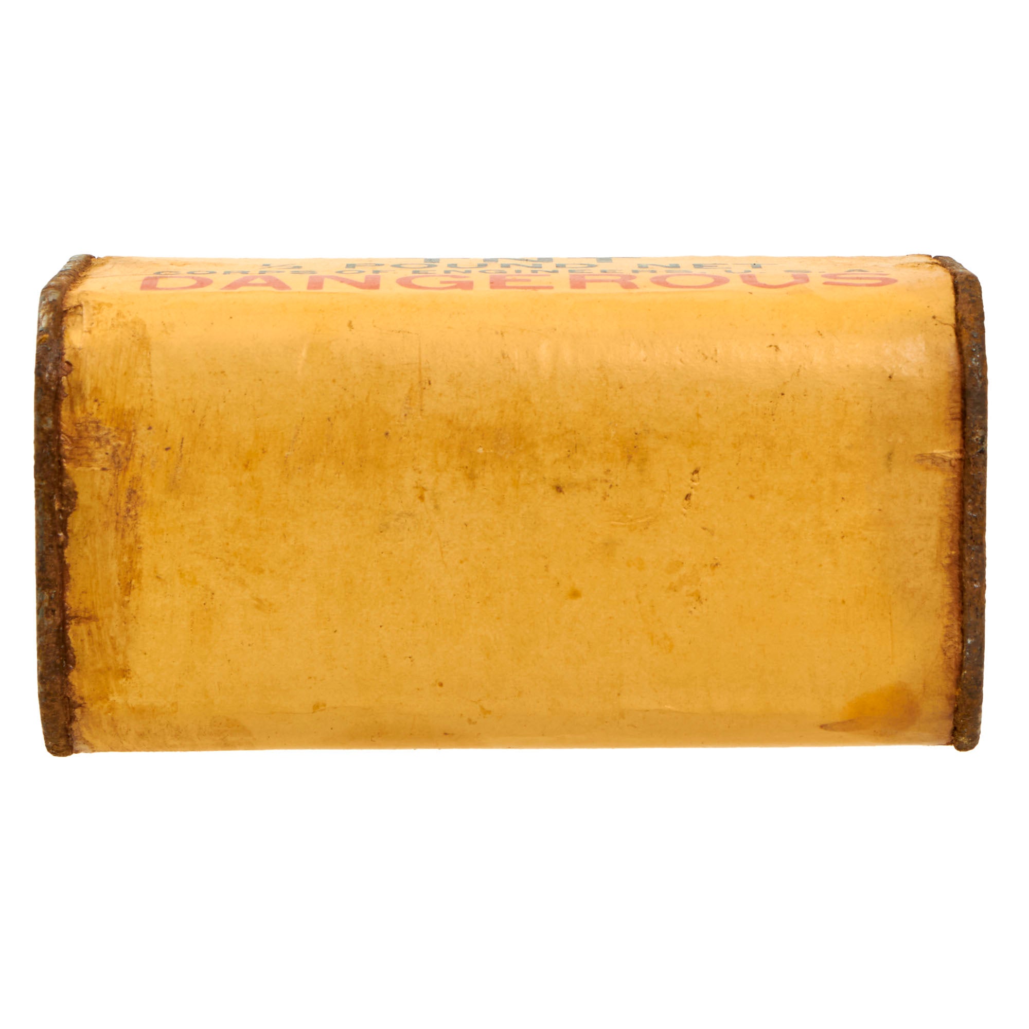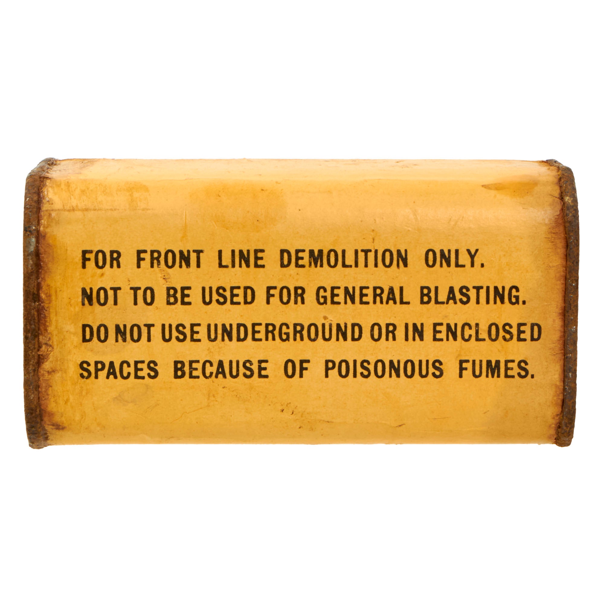 This thick cardboard block is complete with both end caps present. This example appears to have never been used or rigged to be used. Both end caps are still attached firmly, so after the explosives were removed, the removed cap was re-attached or glued.