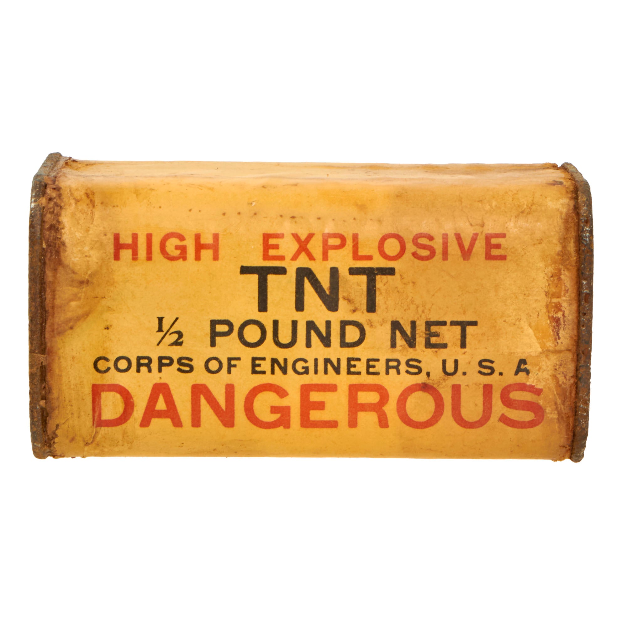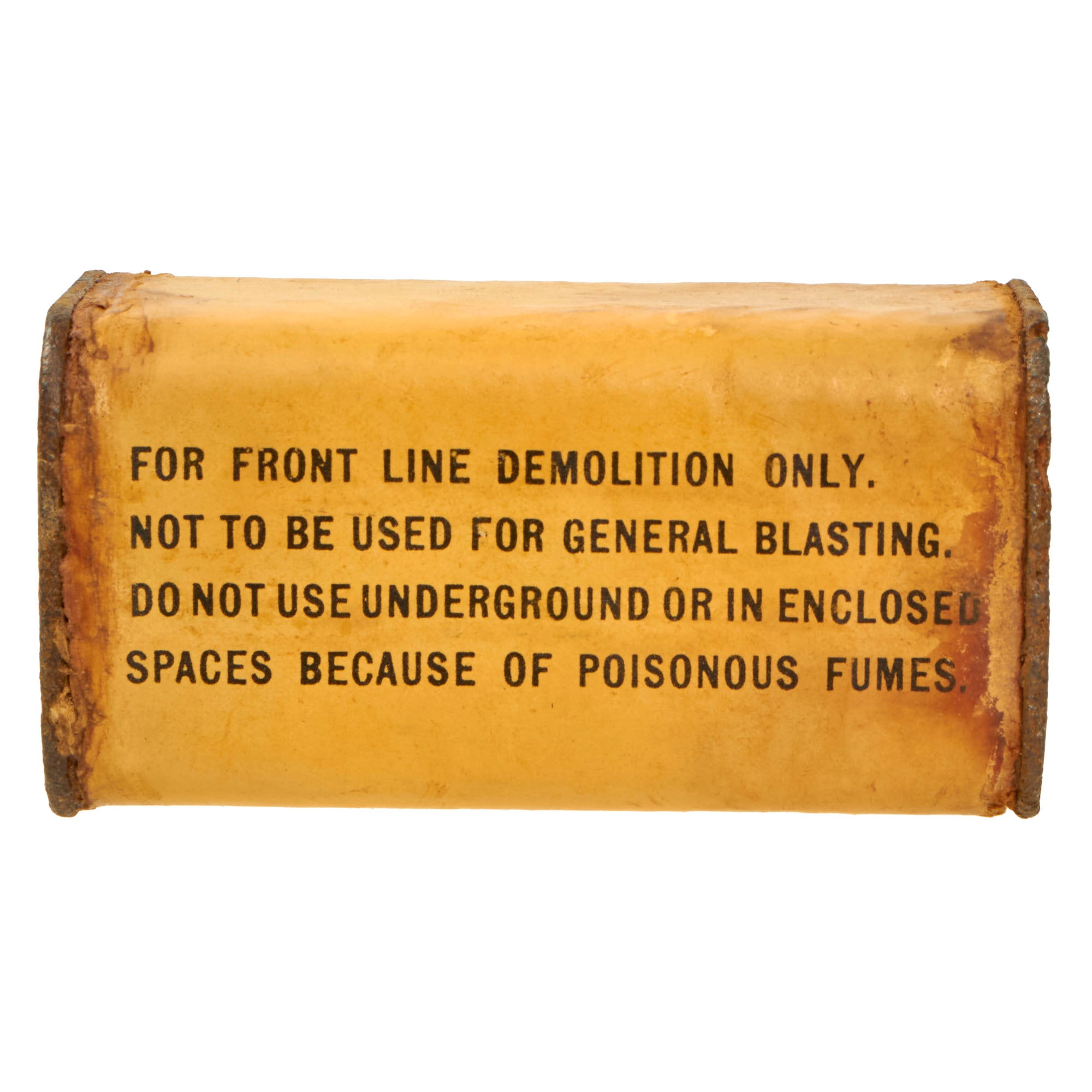 Original Item: Only One Available. These 1/2 lb TNT bricks were used by various Army, Navy, and Marine engineers and demolitions units. FM 5-31, Boobytraps and Landmines, explains the use of the half-pound TNT block with several fuses, including how to arm and disarm them. The TNT block could be used with the delay fuse, release fuse, or pressure fuse. It measures 3¾" x 1¾" x 1¾”.
