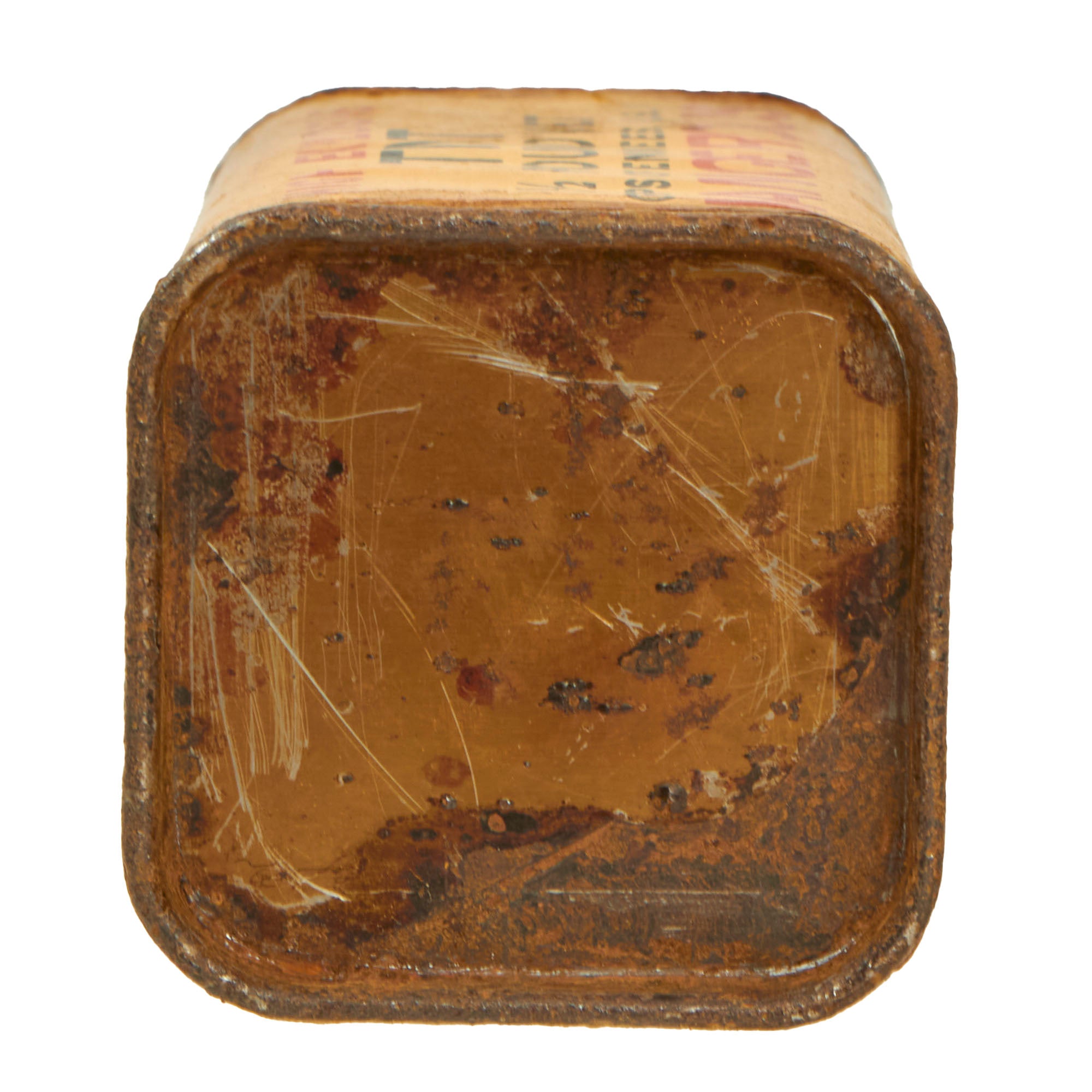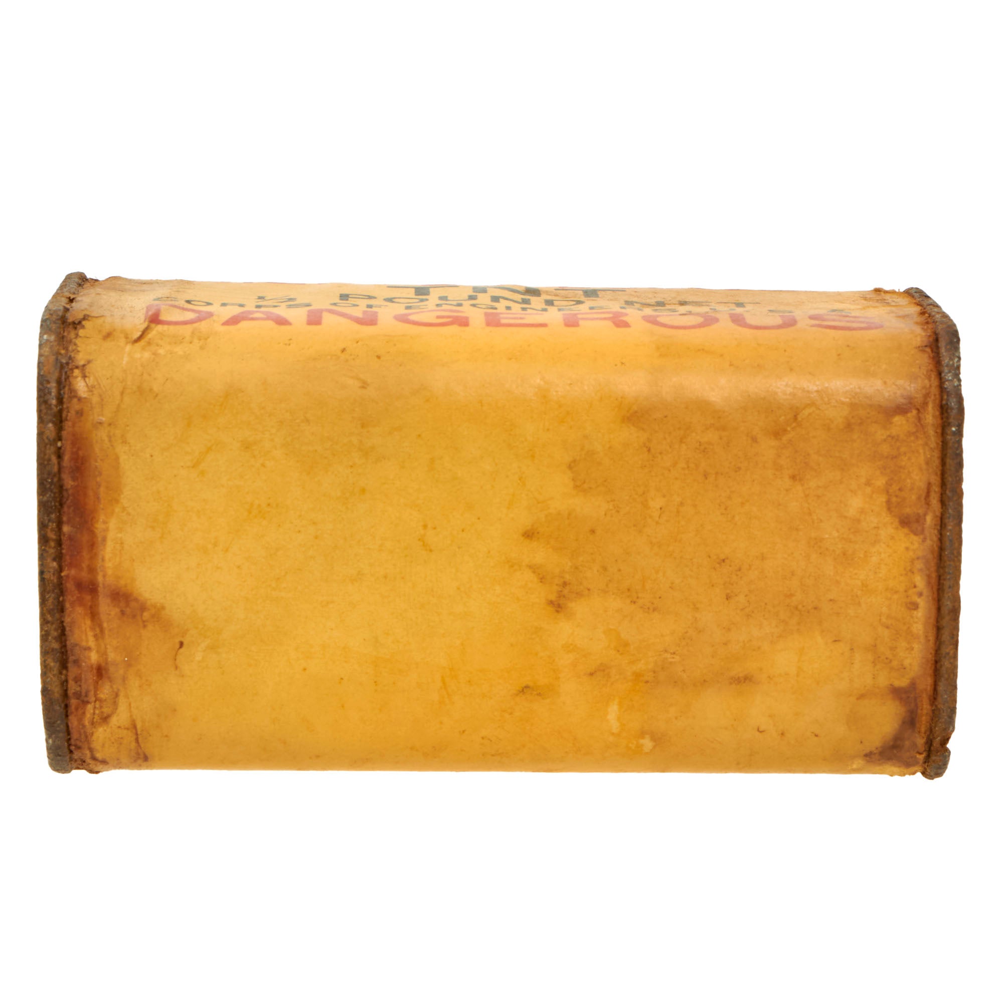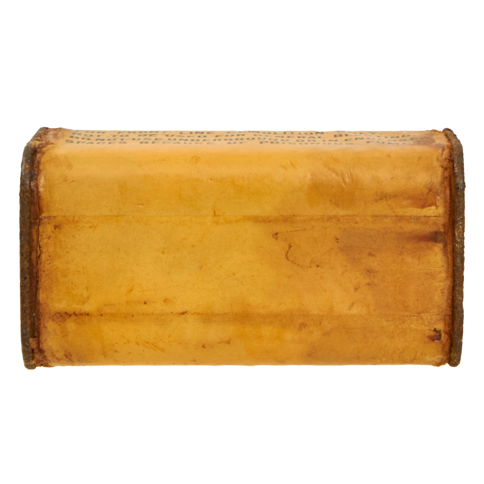 This thick cardboard block is complete with both end caps present. This example appears to have never been used or rigged to be used. Both end caps are still attached firmly, so after the explosives were removed, the removed cap was re-attached or glued.