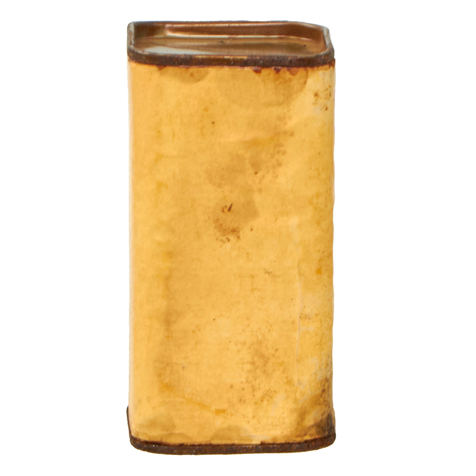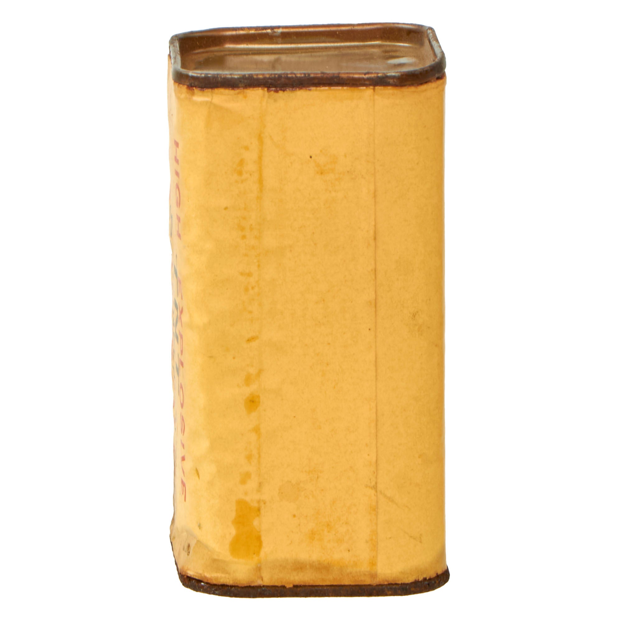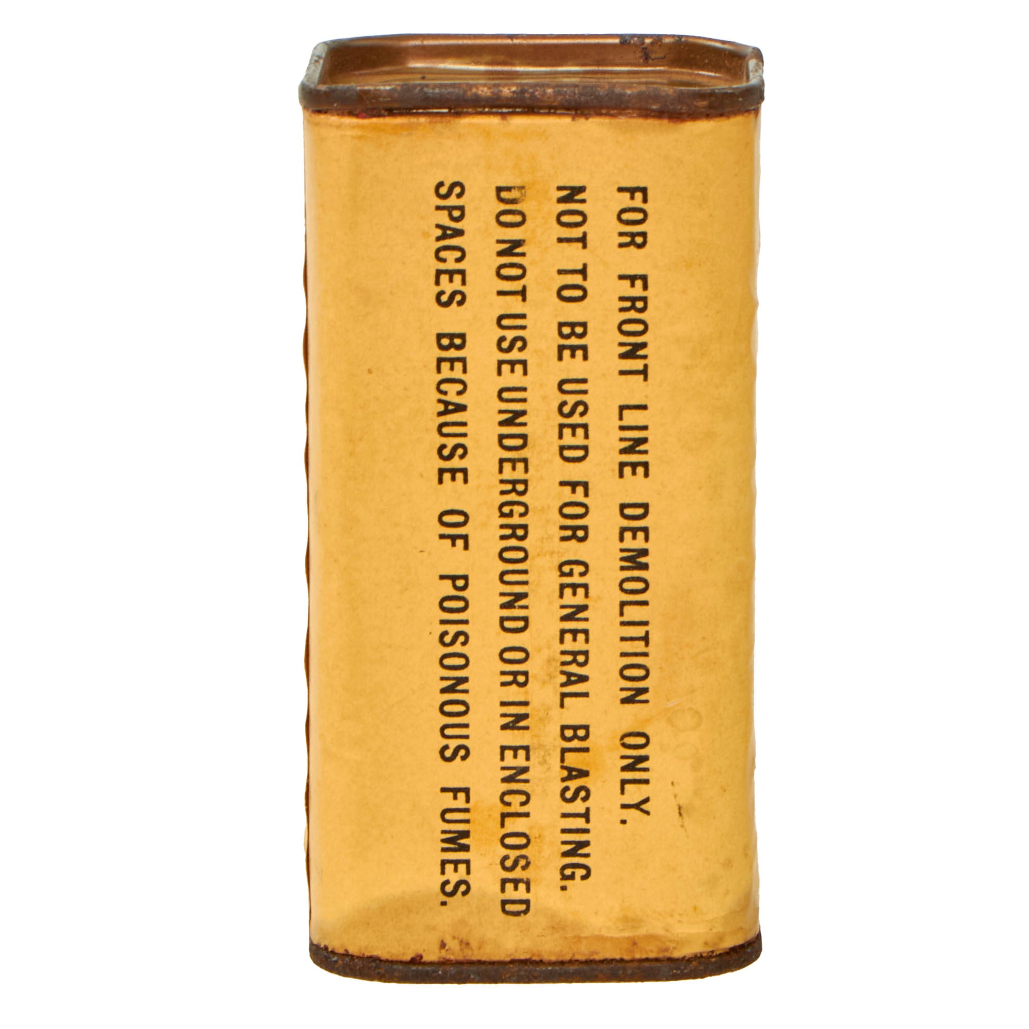 This thick cardboard block is complete with both end caps present. This example appears to have never been used or rigged to be used. Both end caps are still attached firmly, so after the explosives were removed, the removed cap was re-attached or glued.