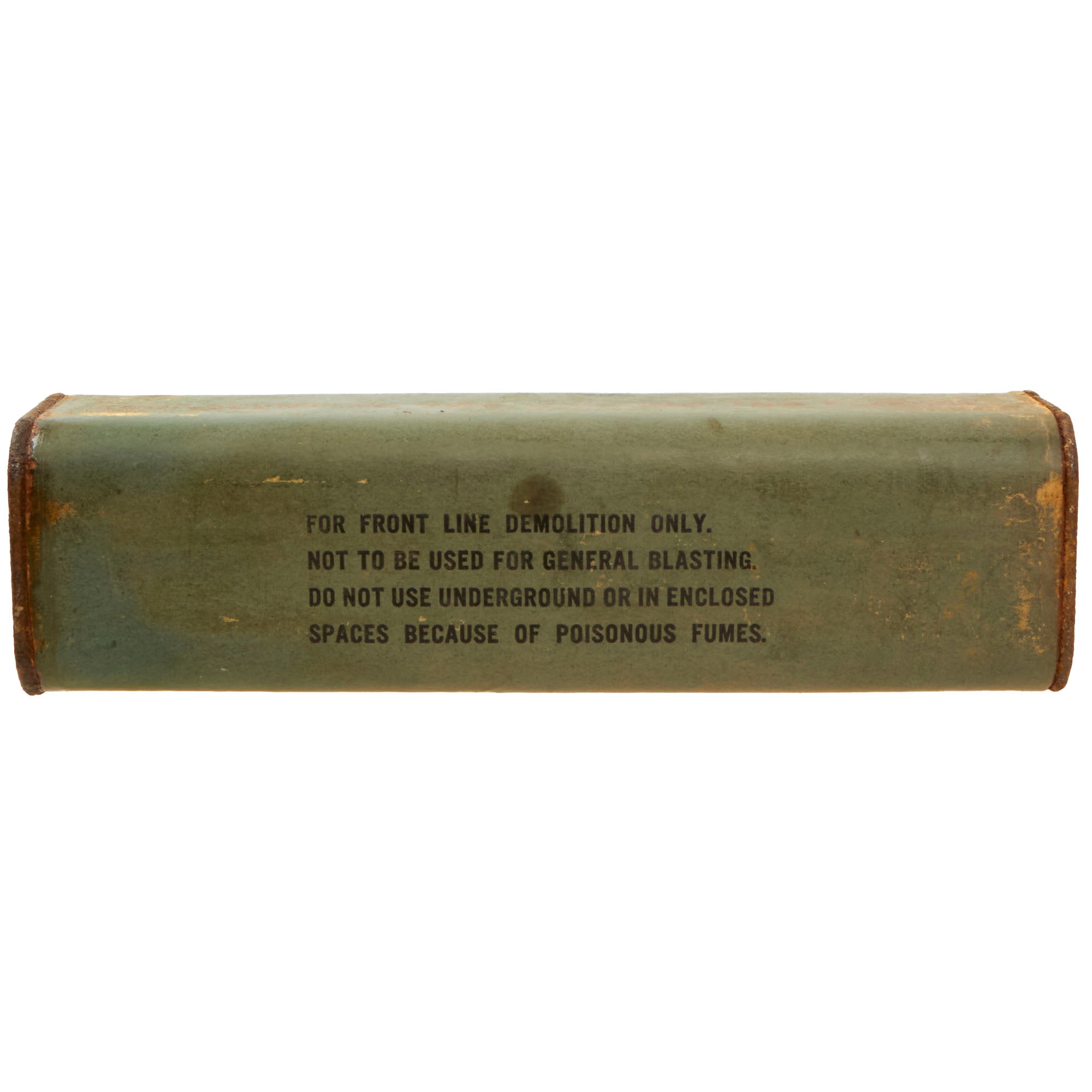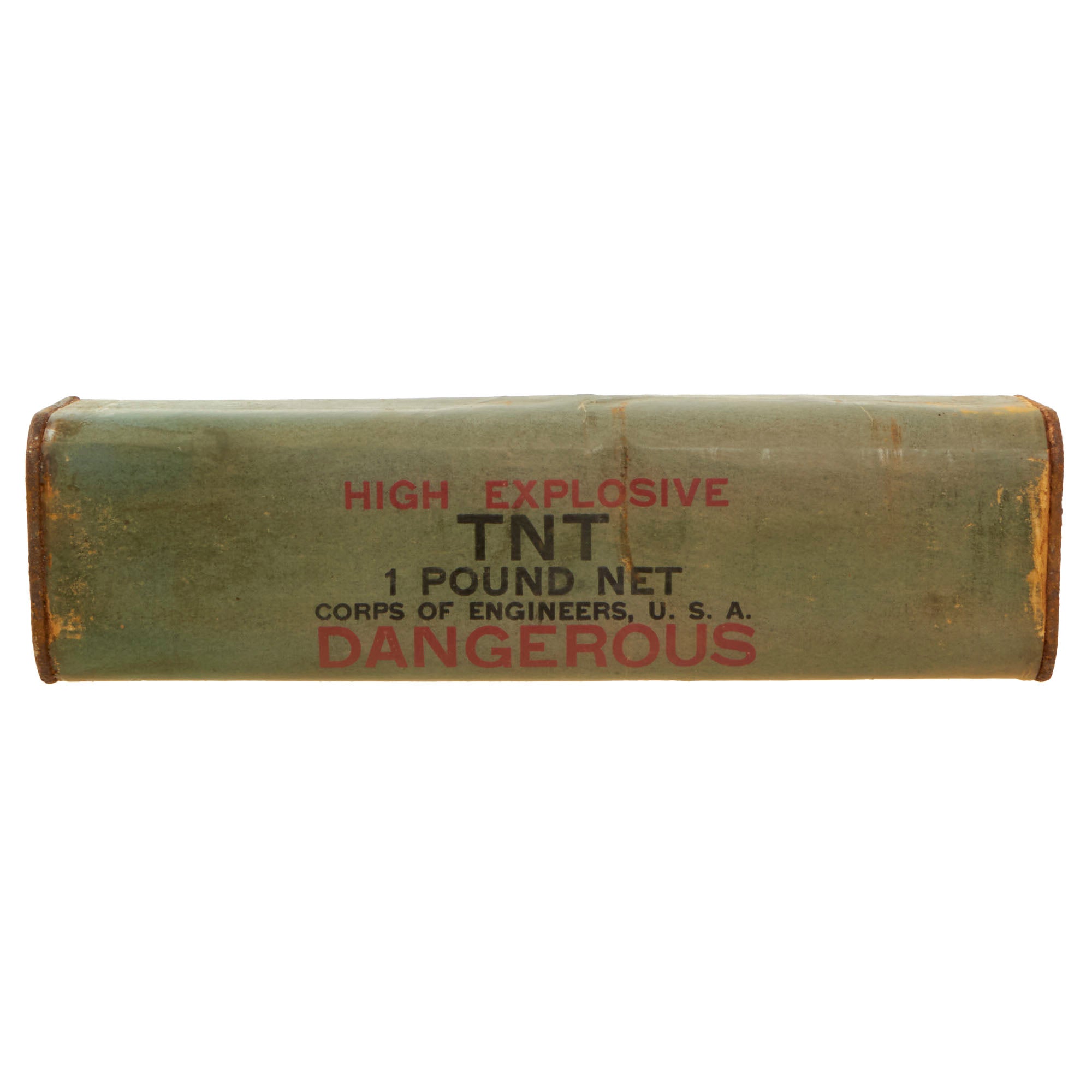 Original Item: Only One Available. These 1 lb TNT bricks were used by various Army, Navy, and Marine engineers and demolitions units. FM 5-31, Boobytraps and Landmines, explains the use of the half-pound TNT block with several fuses, including how to arm and disarm them. The TNT block could be used with the delay fuse, release fuse, or pressure fuse. It measures 7 x 1¾ x 1¾”.