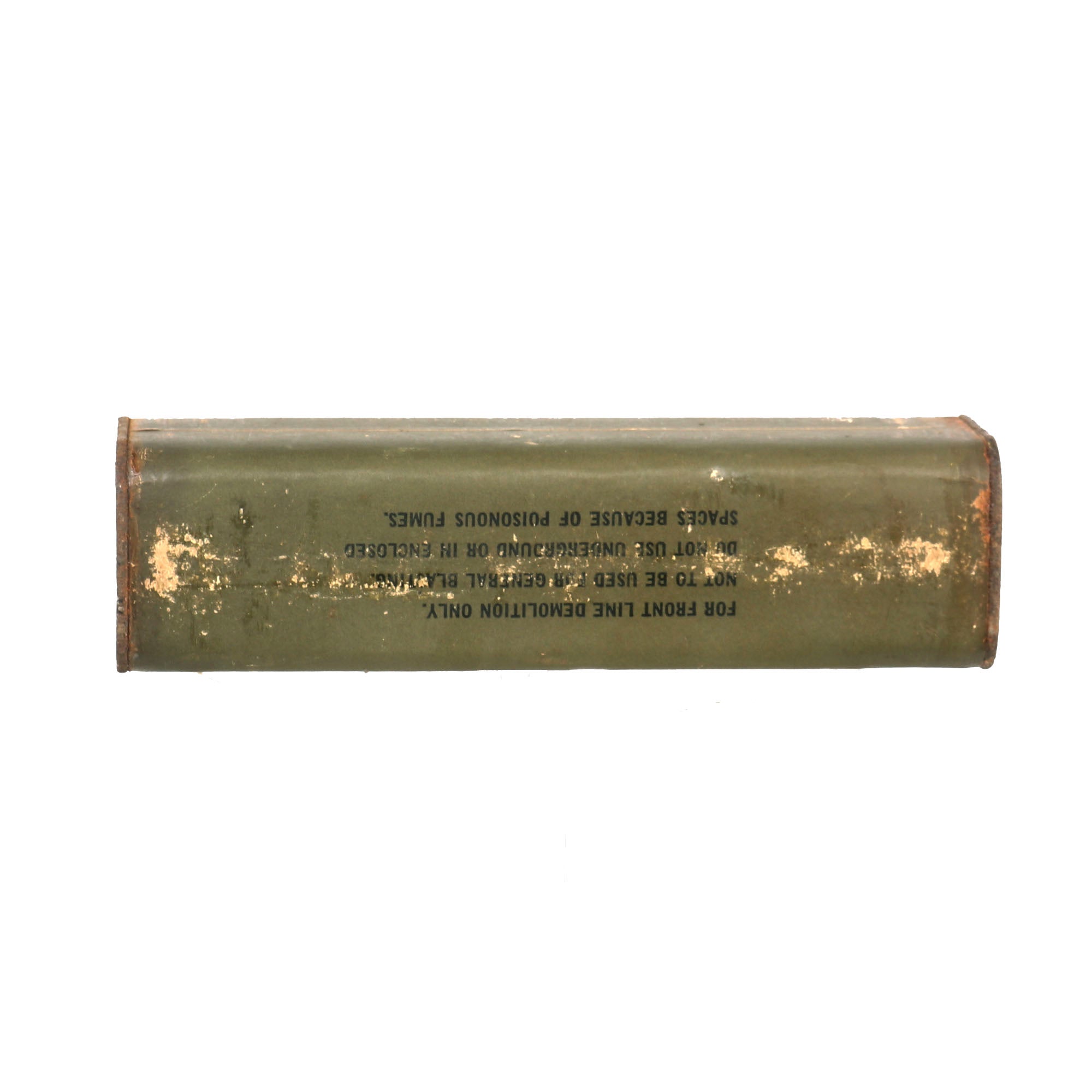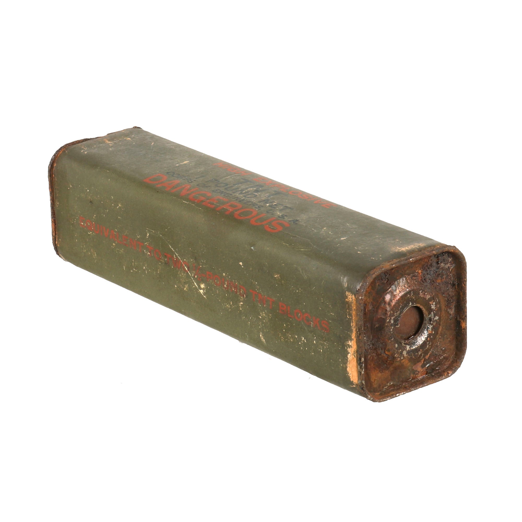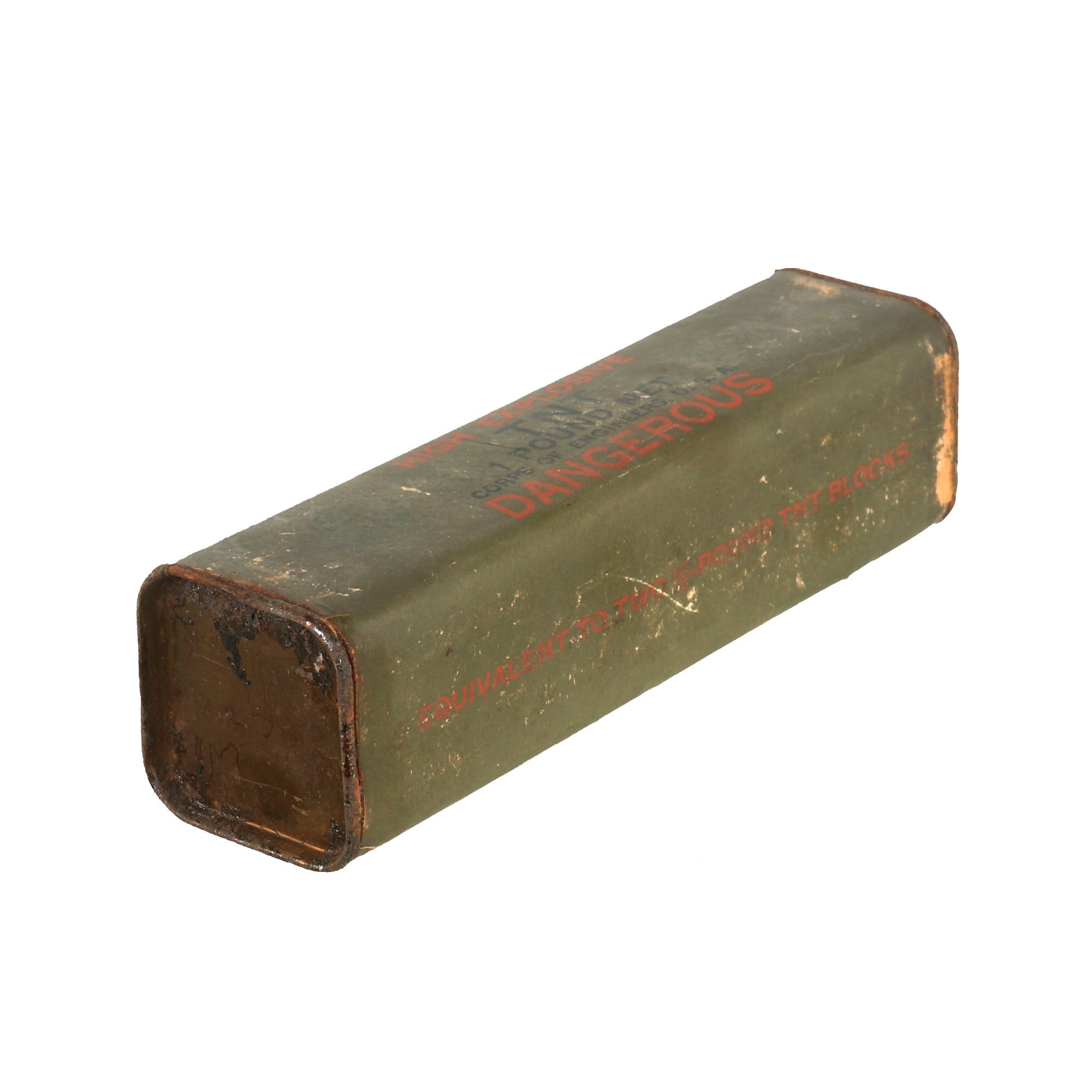 Original Item: Only One Available. These 1 lb TNT bricks were used by various Army, Navy, and Marine engineers and demolitions units. FM 5-31, Boobytraps and Landmines, explains the use of the half-pound TNT block with several fuses, including how to arm and disarm them. The TNT block could be used with the delay fuse, release fuse, or pressure fuse. It measures 7" x 1¾" x 1¾”.