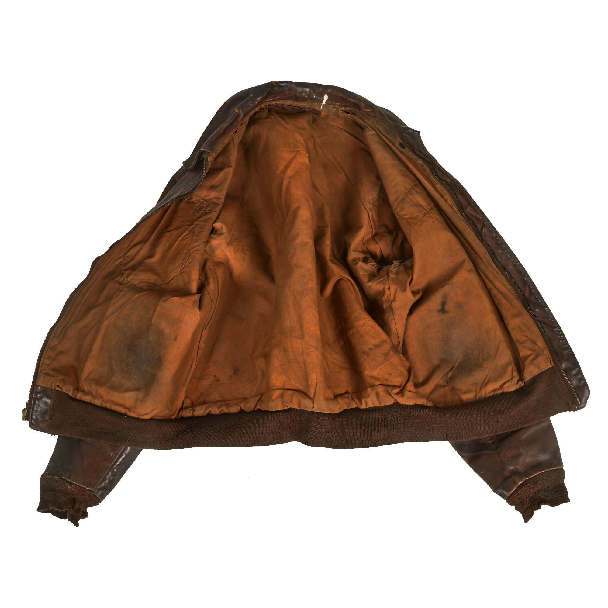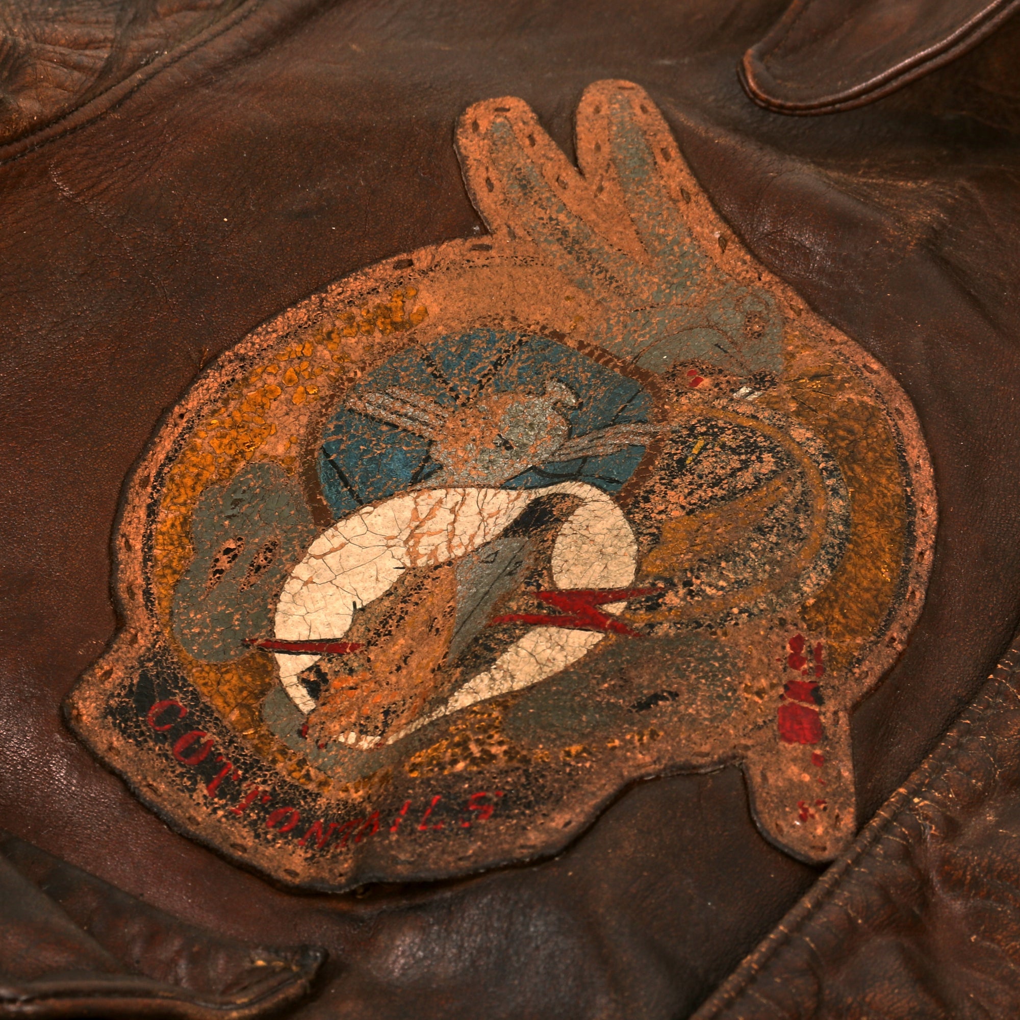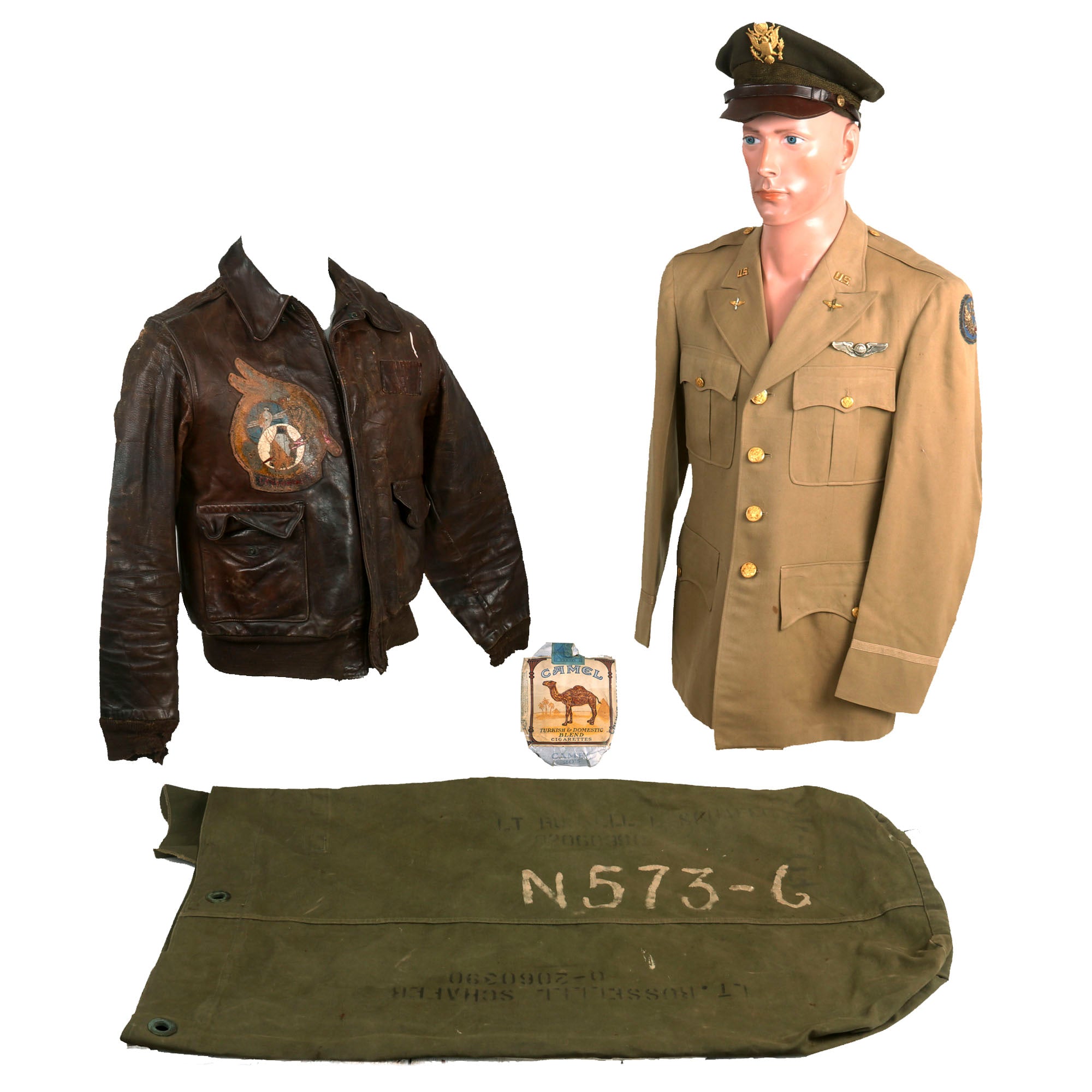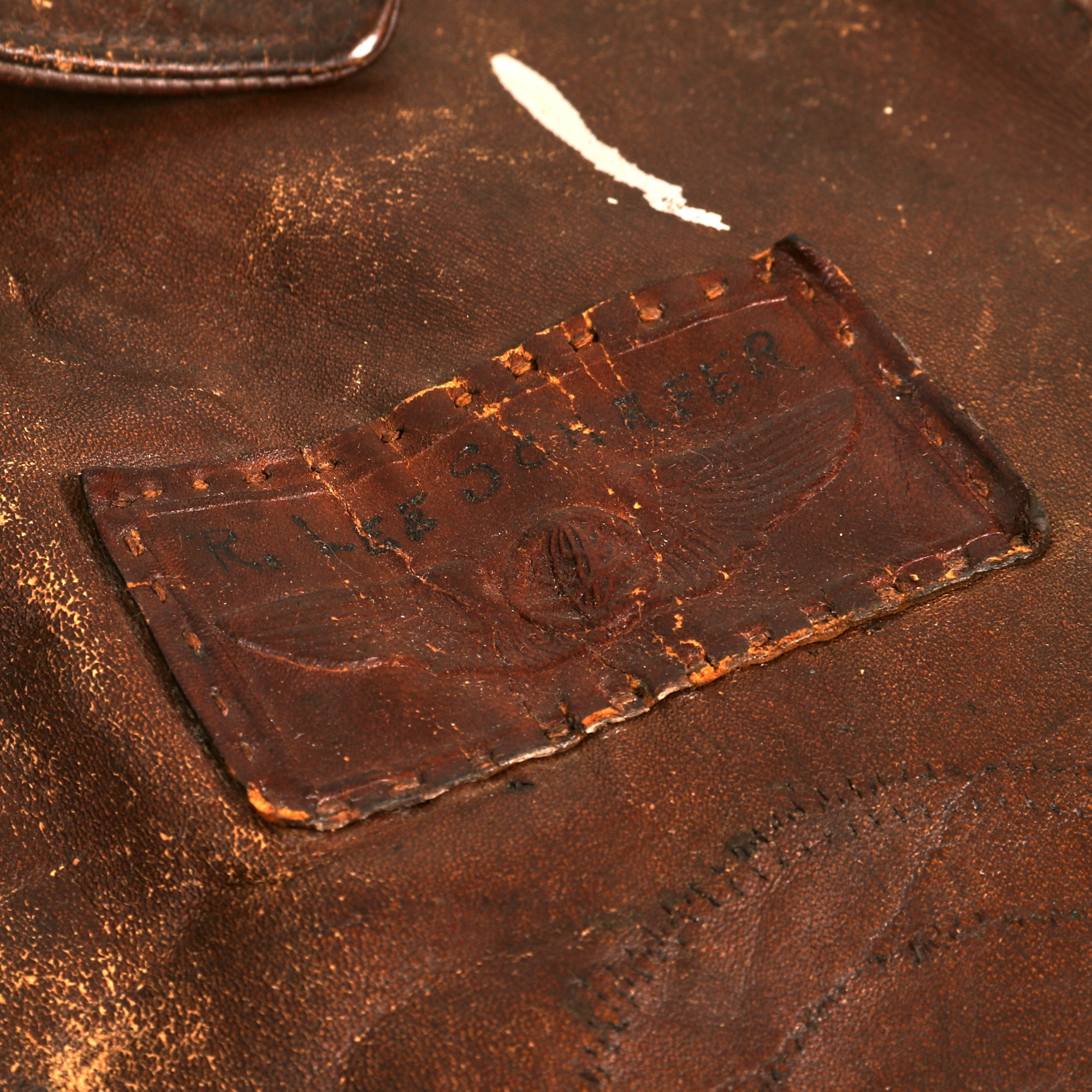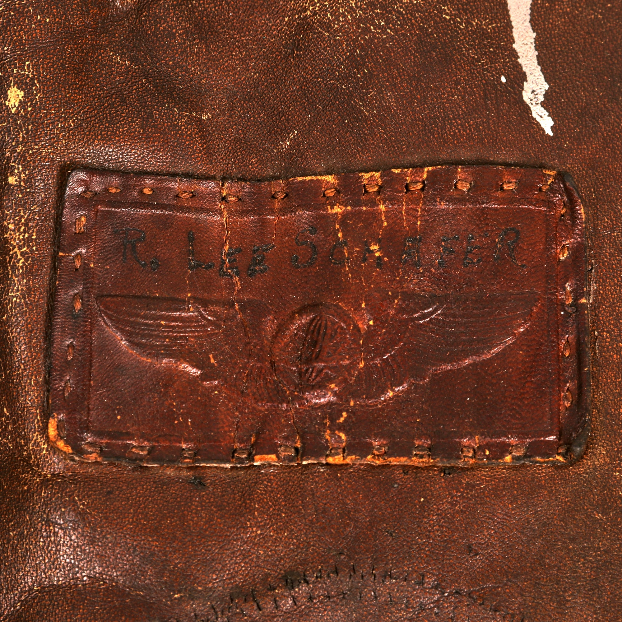 - The standout item among the Grouping is undoubtedly the A-2 Flight Jacket once owned by Lt. Schafer. The Jacket boasts a striking 450th Bombardment Group “Cottontails” Patch on the right chest, which immediately captures your attention though it is heavily stained. On the left chest, there is a leather name tag with the name “R. Lee Schafer” etched into it, which adds a personal touch to the jacket. Sadly, the original label is no longer present, but the jacket itself is approximately a US size 42 and has retained all the original components from the period, including the original knit waistband and sleeve cuffs. These original components are seldom seen on A-2 jackets that have seen extensive service, but the jacket has managed to keep them intact. Another notable feature is the CONMAR brand zipper, which is still functional even after all these years. Finally we found a pack of original WWII CAMEL cigarettes in the right front pocket, the cigs were gone but the outline in the lather of the pocket indicates that they sat there for decades after the war.