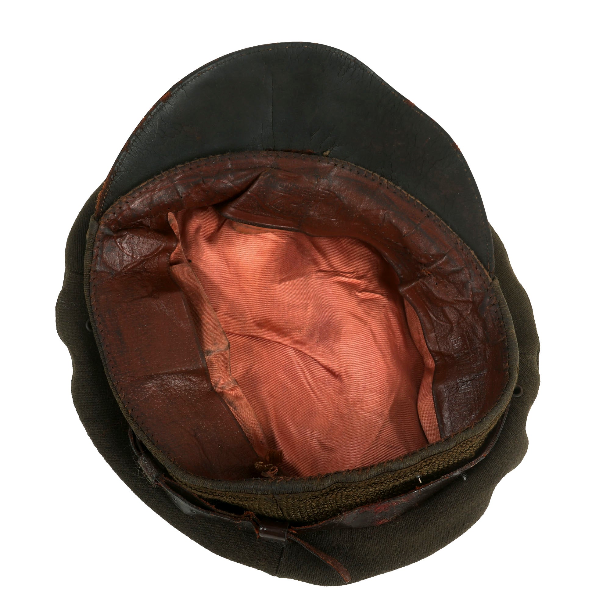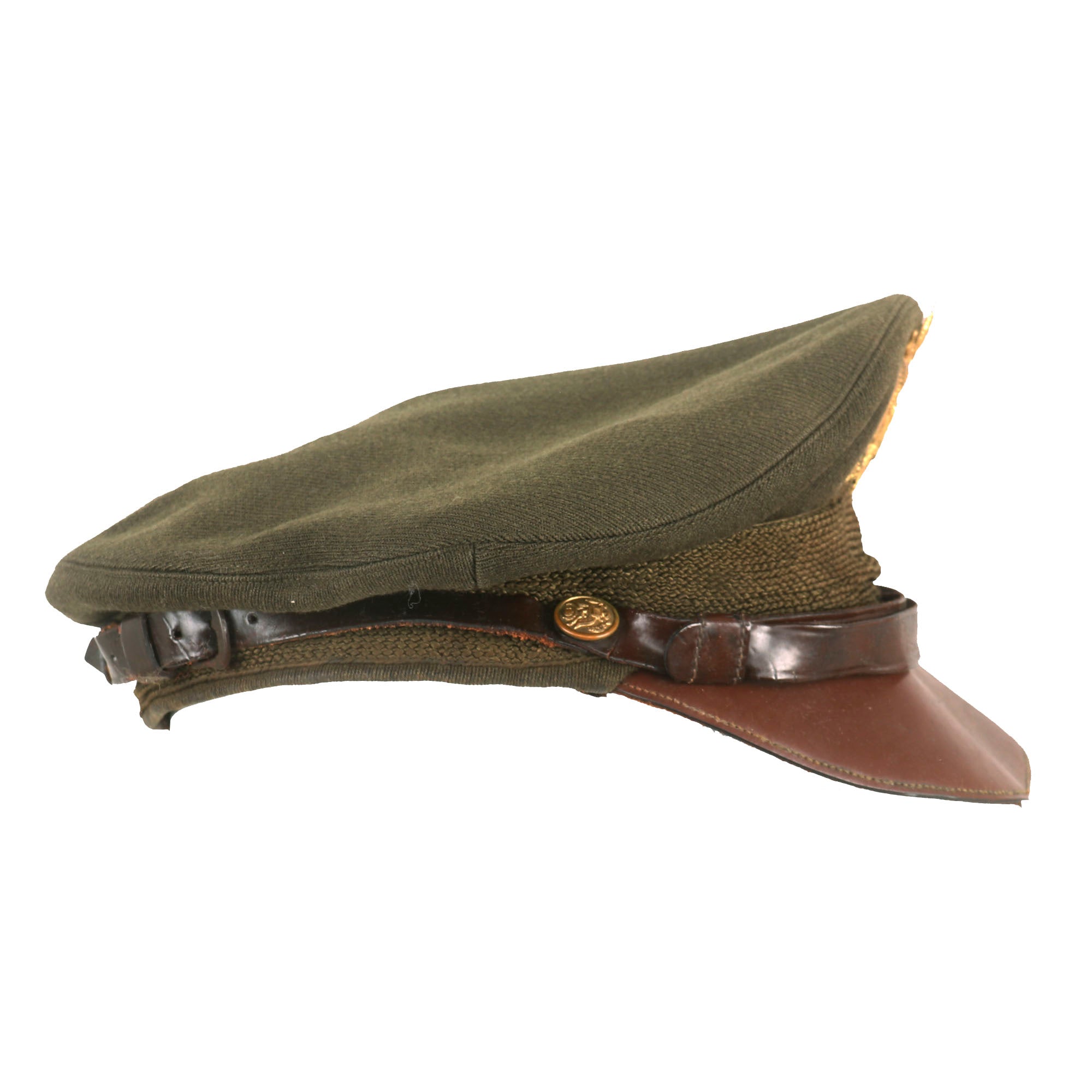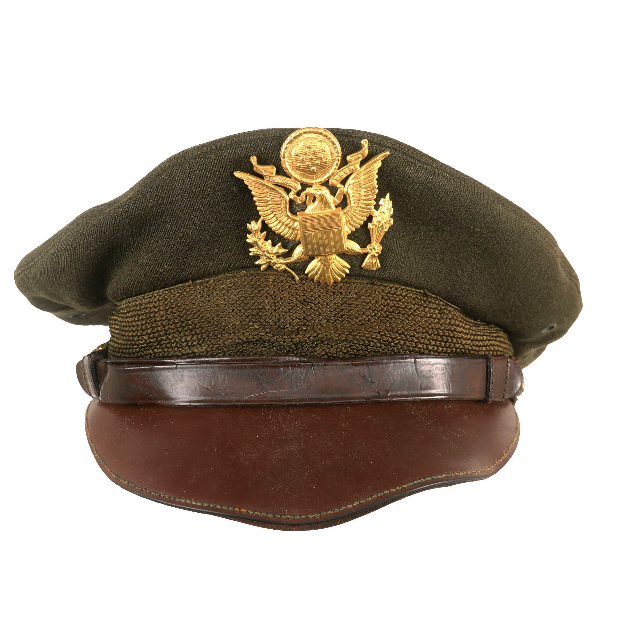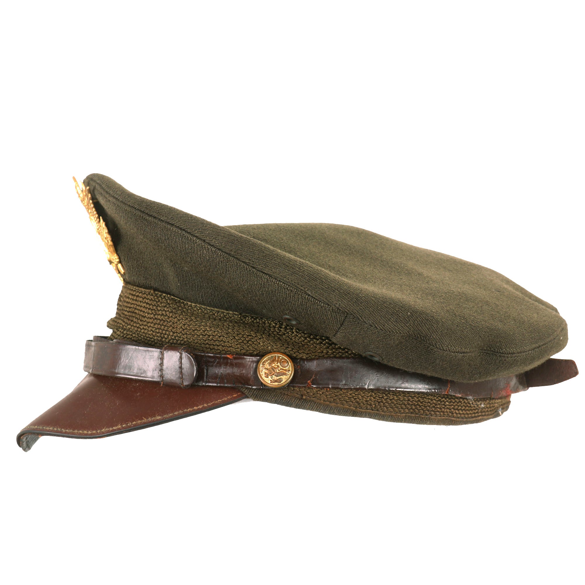 - Crusher Cap: One of the most iconic pieces of headgear to come out of WWII was the U.S. Crusher Cap, or “Fifty Mission Cap”. This visor cap, in “Winter Green” issue color. The outward appearance is extremely worn from honest use, and decades of storage wear. It retains the original iconic "crush" shape. The cap was certainly used and is a bit misshapen from long storage, However, with some effort and form fitting it will come back to form. The visor portion is very worn, partially detached and stained. The leather adjustment strap on the back and the leather chinstrap on the front are in rather delicate condition.