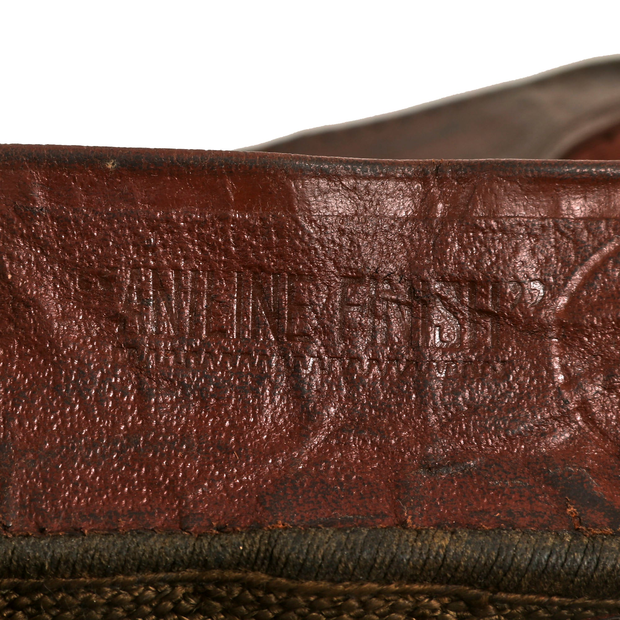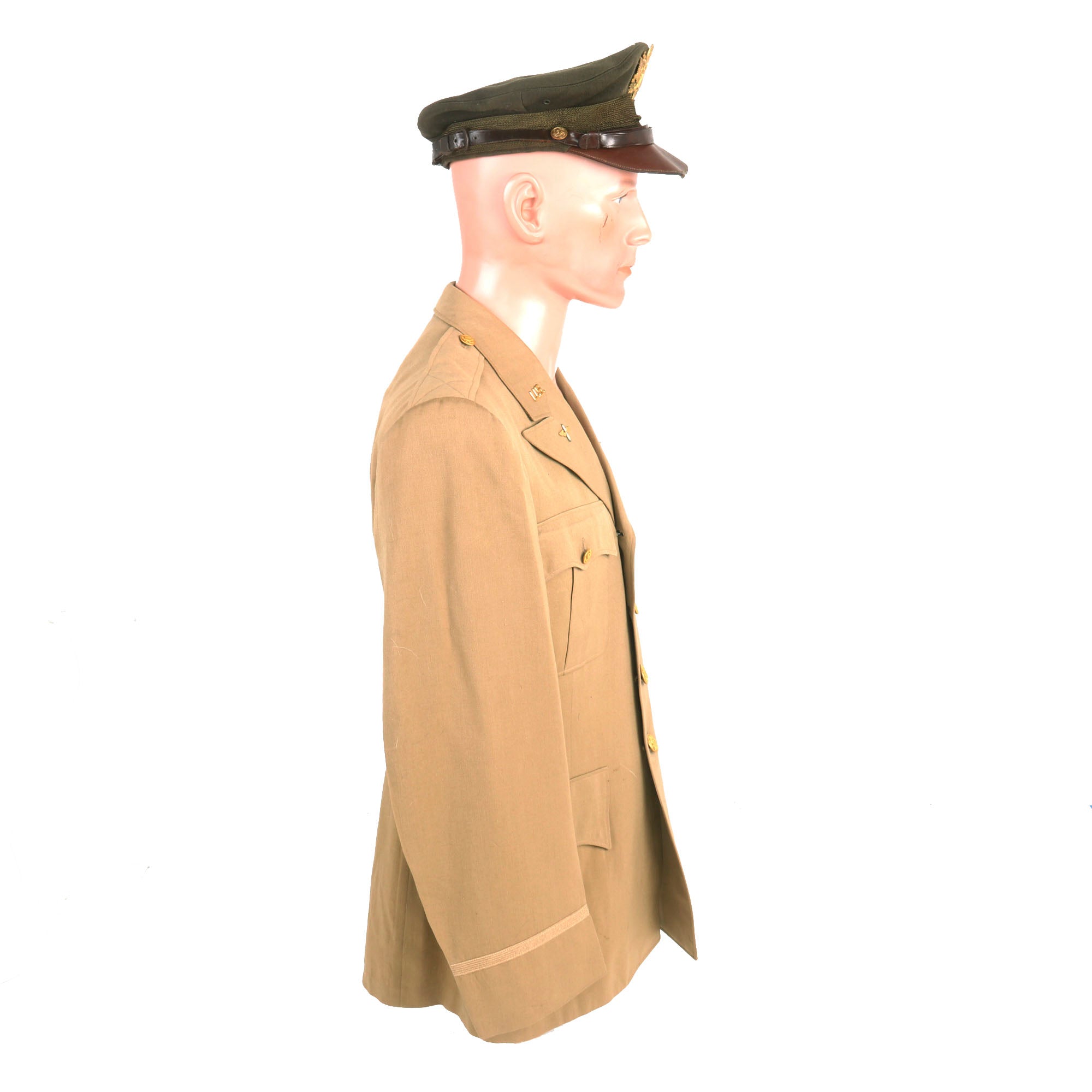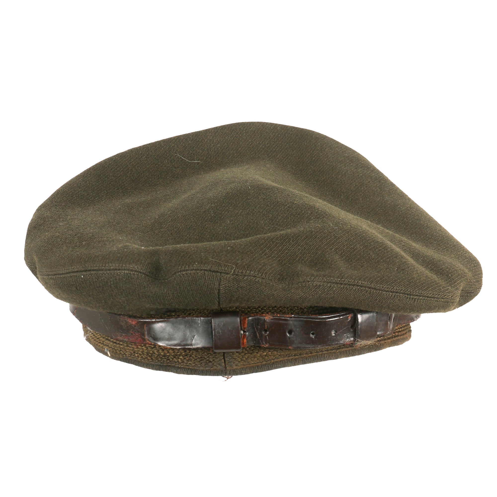 - Crusher Cap: One of the most iconic pieces of headgear to come out of WWII was the U.S. Crusher Cap, or “Fifty Mission Cap”. This visor cap, in “Winter Green” issue color. The outward appearance is extremely worn from honest use, and decades of storage wear. It retains the original iconic "crush" shape. The cap was certainly used and is a bit misshapen from long storage, However, with some effort and form fitting it will come back to form. The visor portion is very worn, partially detached and stained. The leather adjustment strap on the back and the leather chinstrap on the front are in rather delicate condition.