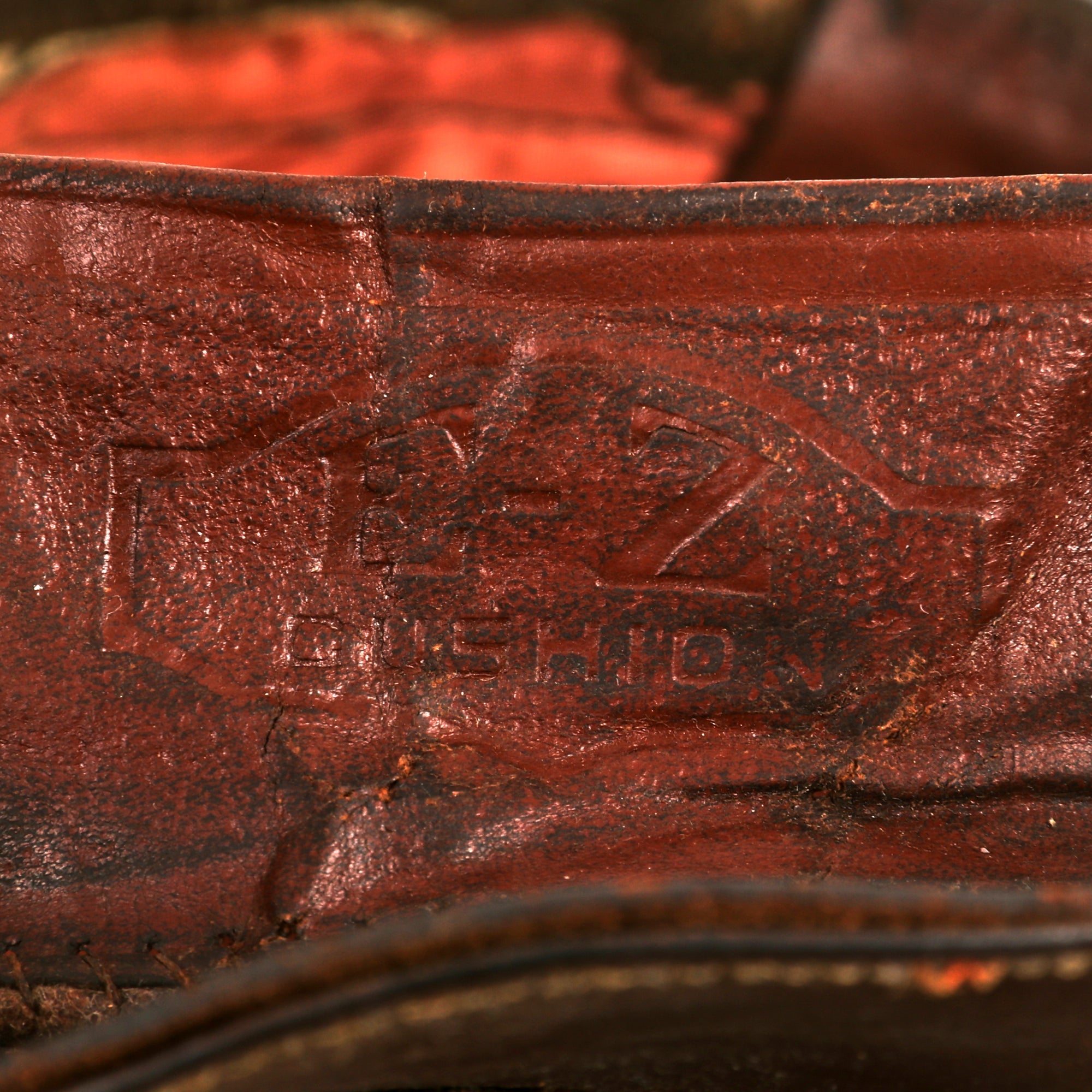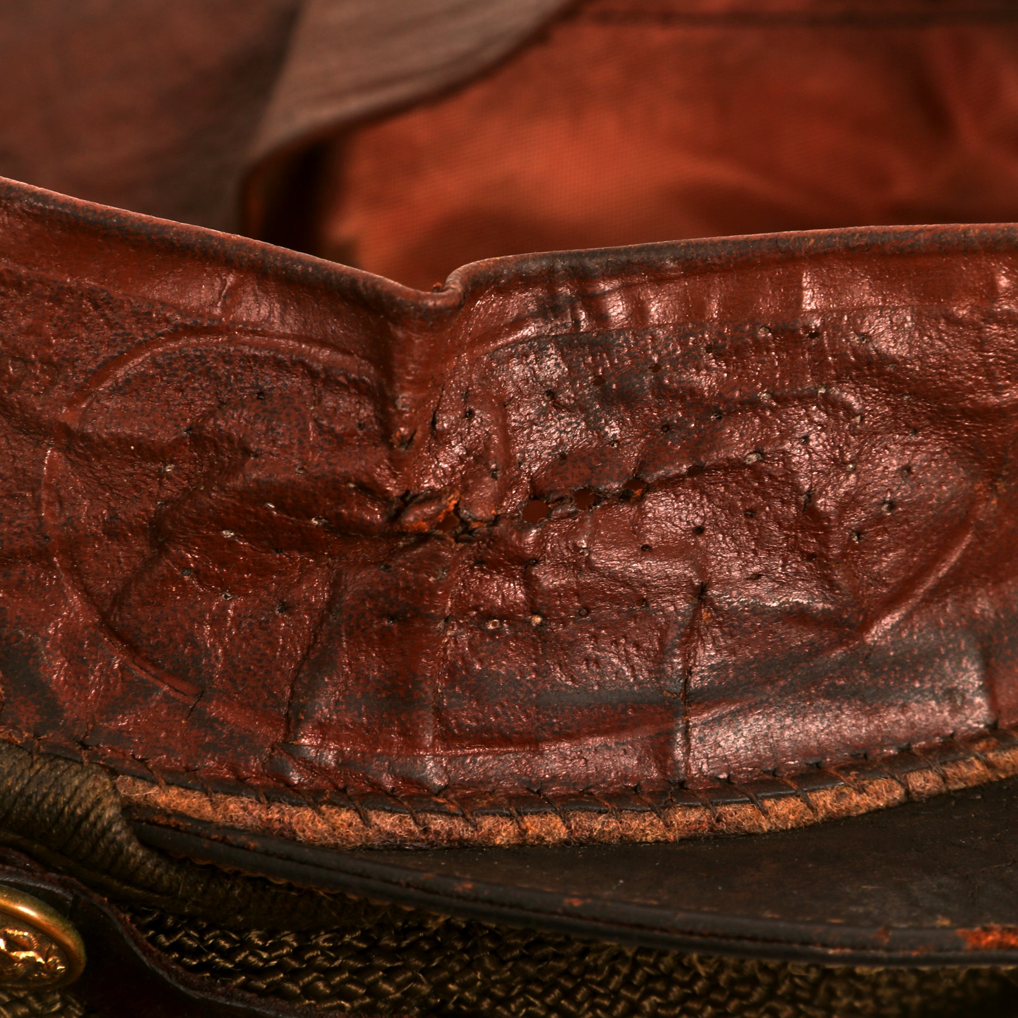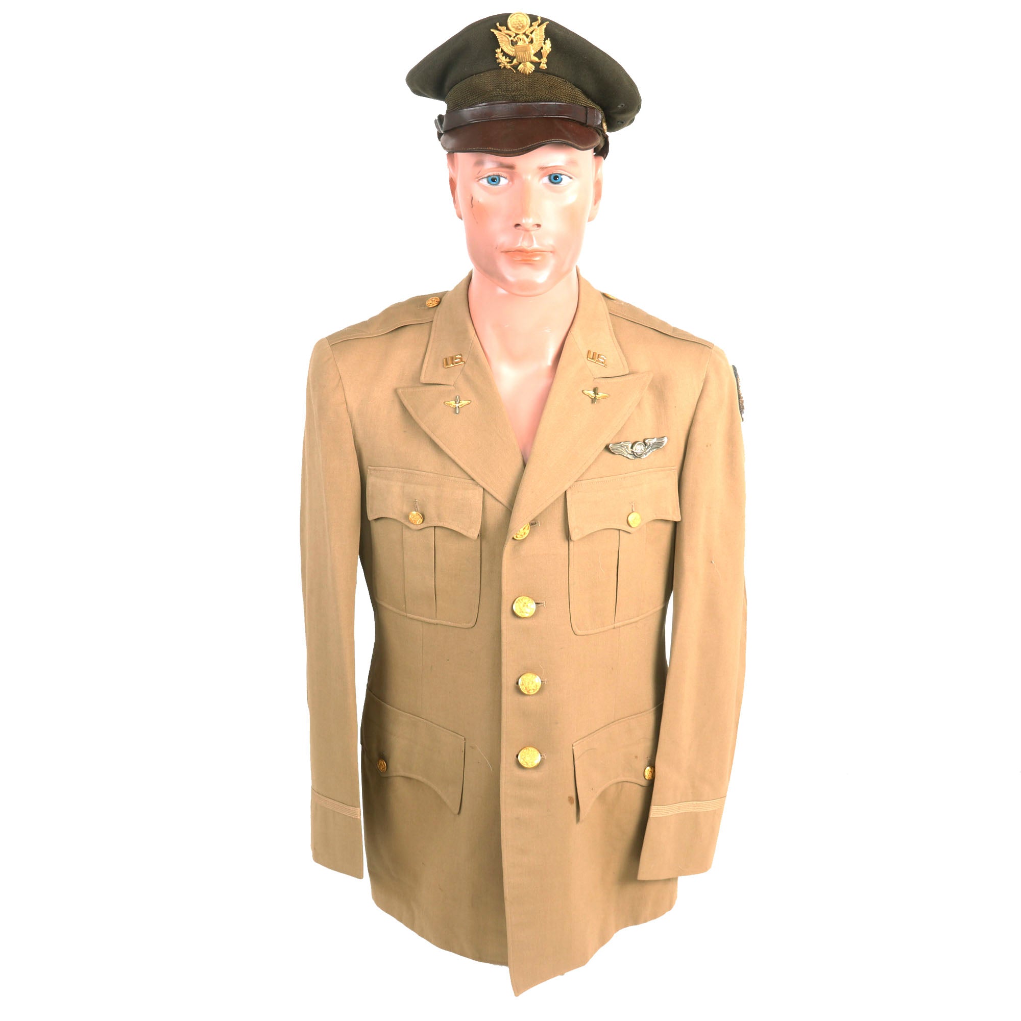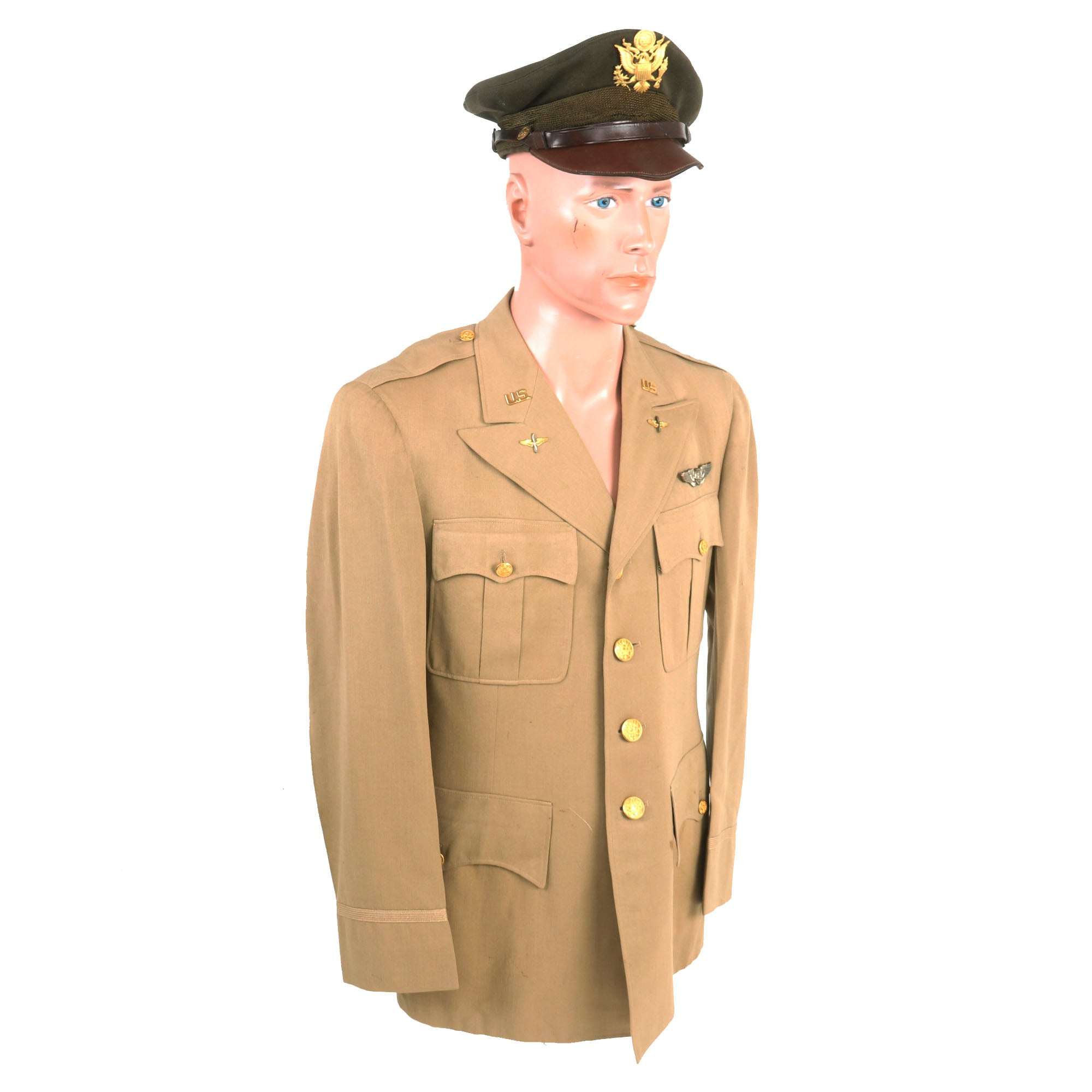 - Crusher Cap: One of the most iconic pieces of headgear to come out of WWII was the U.S. Crusher Cap, or “Fifty Mission Cap”. This visor cap, in “Winter Green” issue color. The outward appearance is extremely worn from honest use, and decades of storage wear. It retains the original iconic "crush" shape. The cap was certainly used and is a bit misshapen from long storage, However, with some effort and form fitting it will come back to form. The visor portion is very worn, partially detached and stained. The leather adjustment strap on the back and the leather chinstrap on the front are in rather delicate condition.