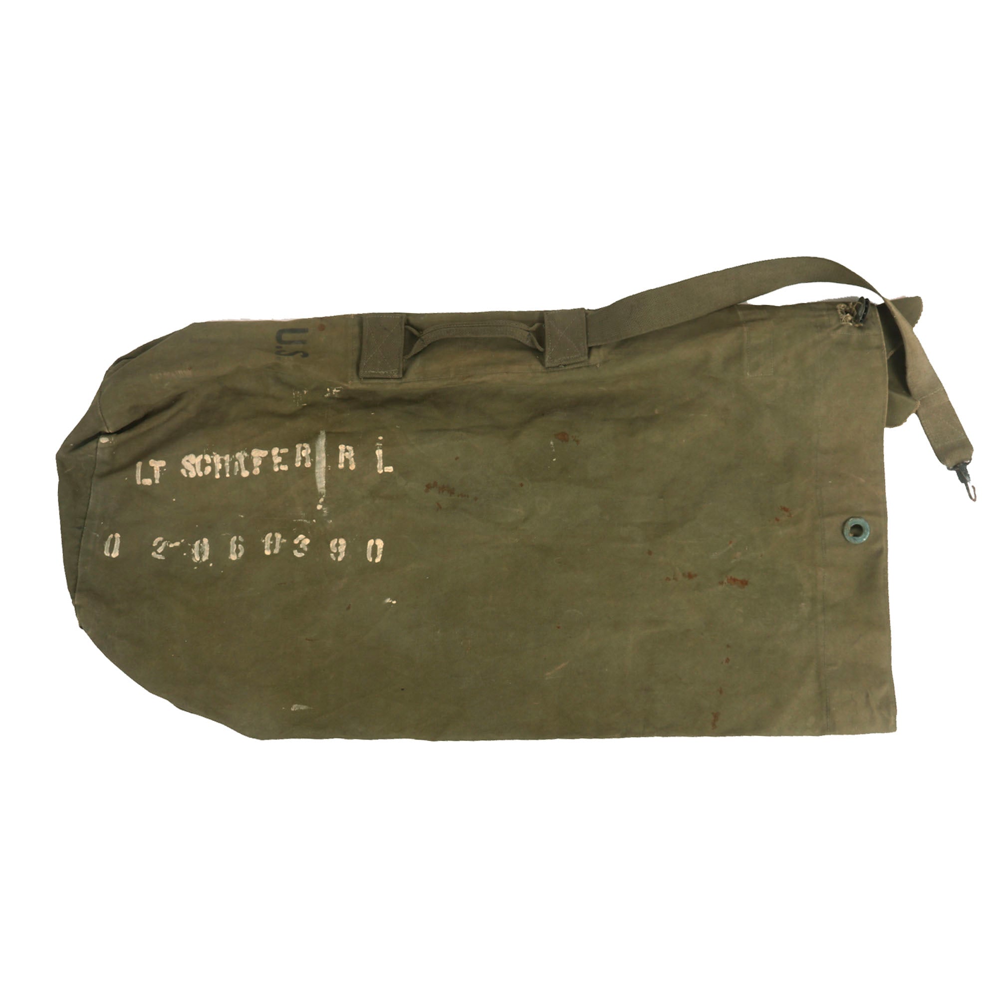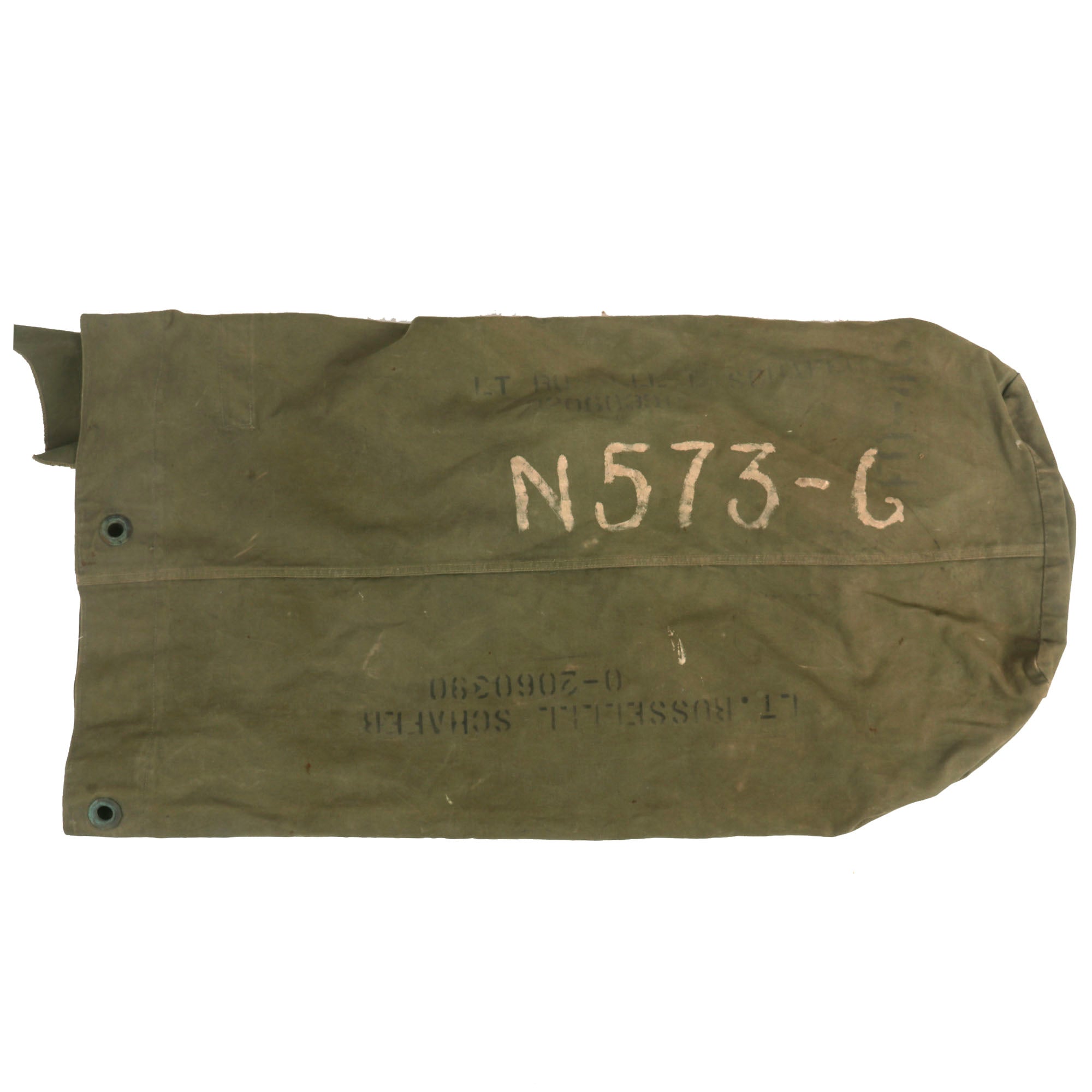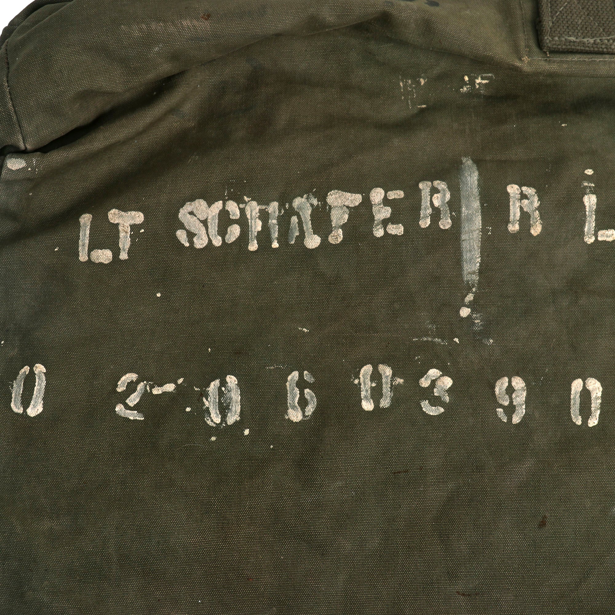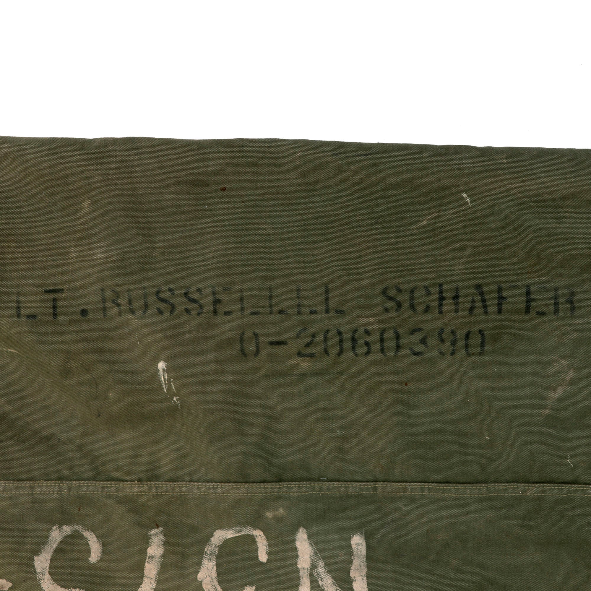 - The last few items consist of Schafer’s duffel bag, a pack of CAMEL cigarettes (found in jacket) and a small research packet, showing his initial enlistment paperwork (copies). All items are named to Schafer, something rarely encountered as most soldiers didn’t mark all of their gear.
