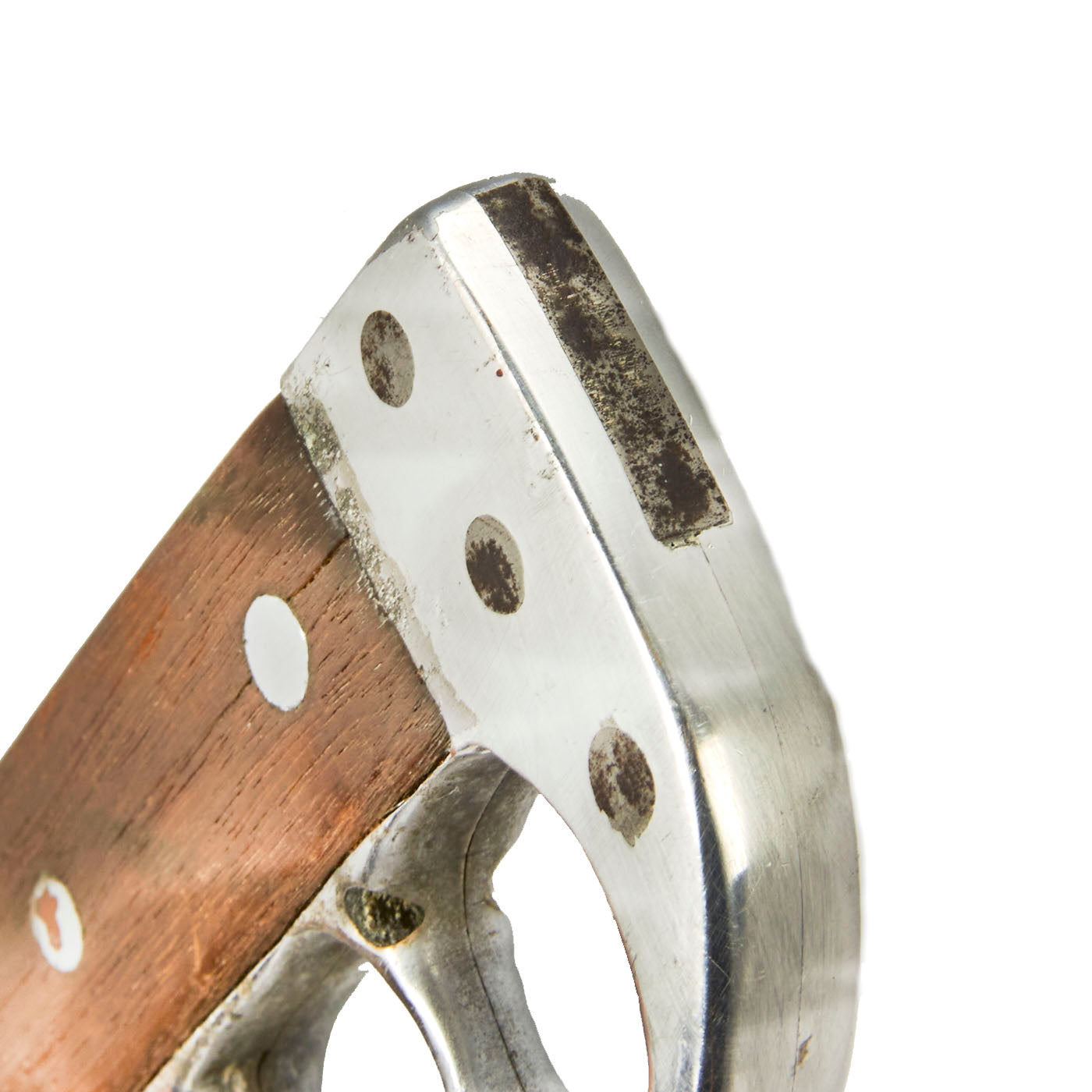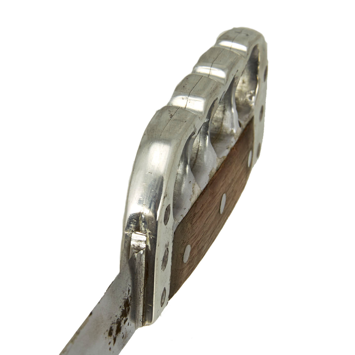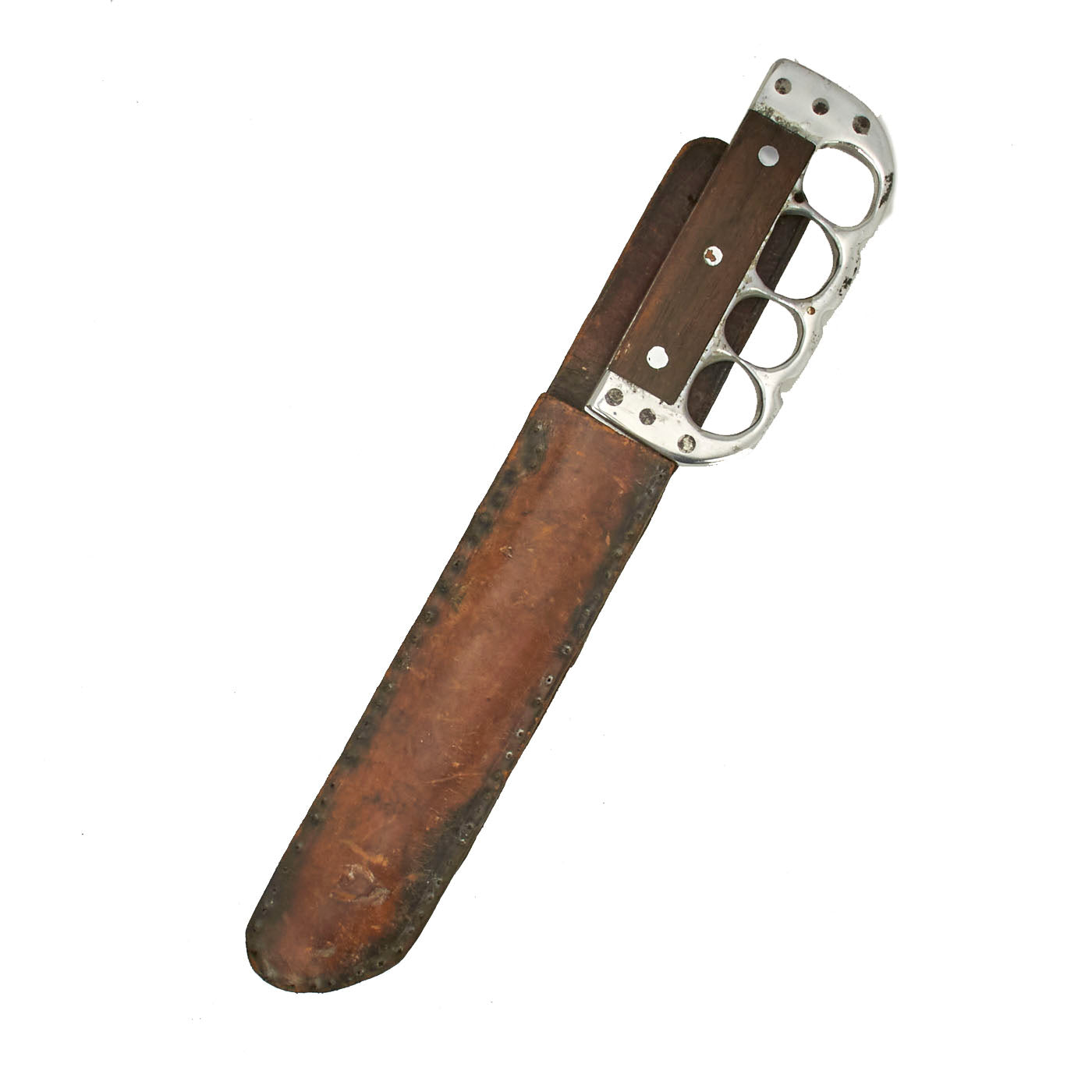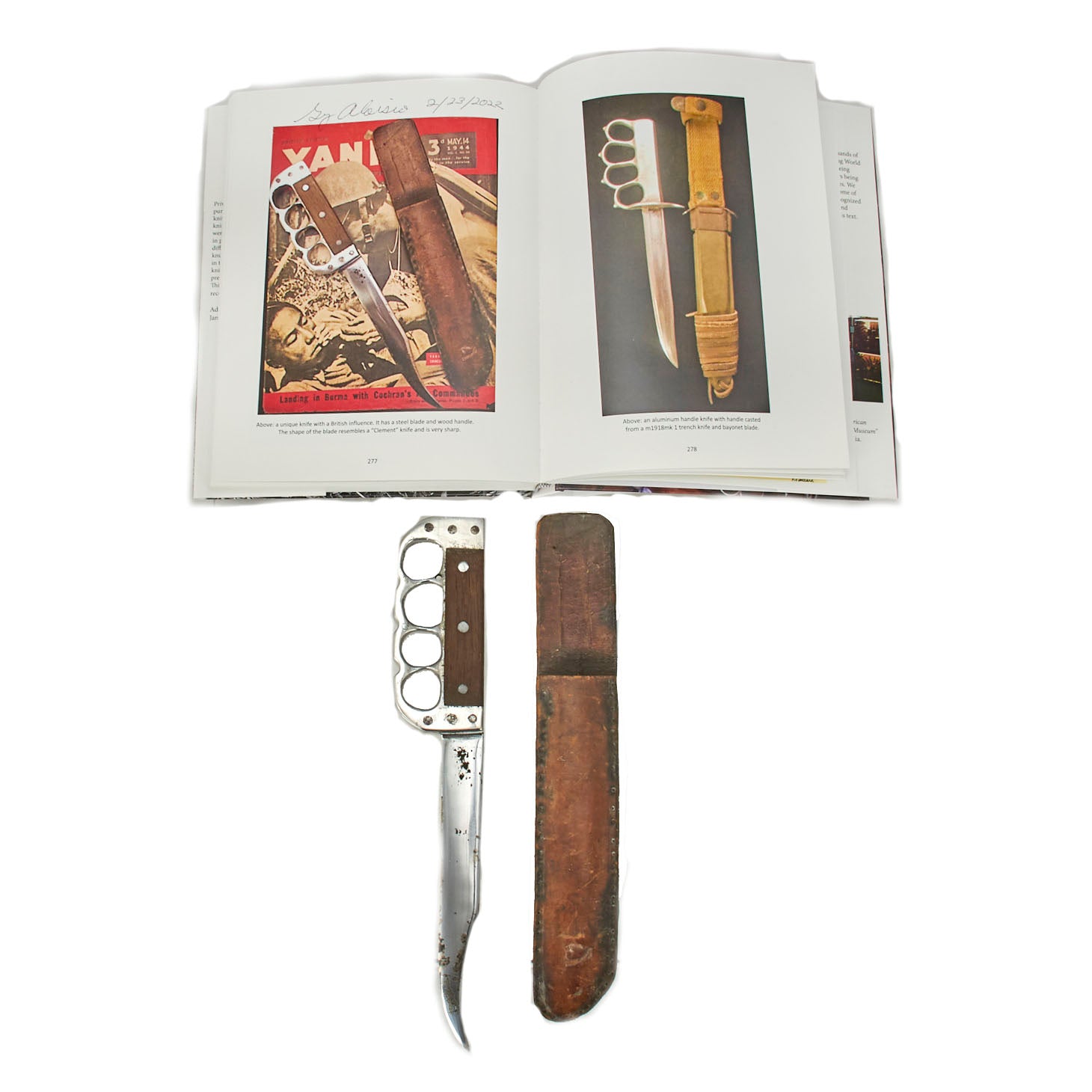 Original Item: One-of-a-kind. As seen in the fantastic book Knuckle Knives of the Second World War by Greg Aloisio on page 277, this knife is a custom made cast fighting knife with leather sheath. The author used this knife and a specimen for his wonderful book and even signed page 277 where this knife is featured. The signed copy of the book accompanies the purchase of this knife.