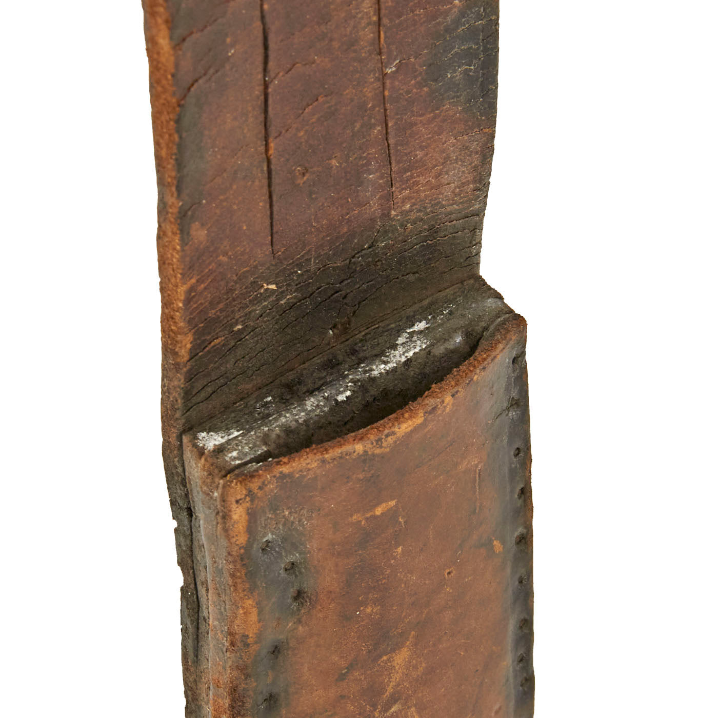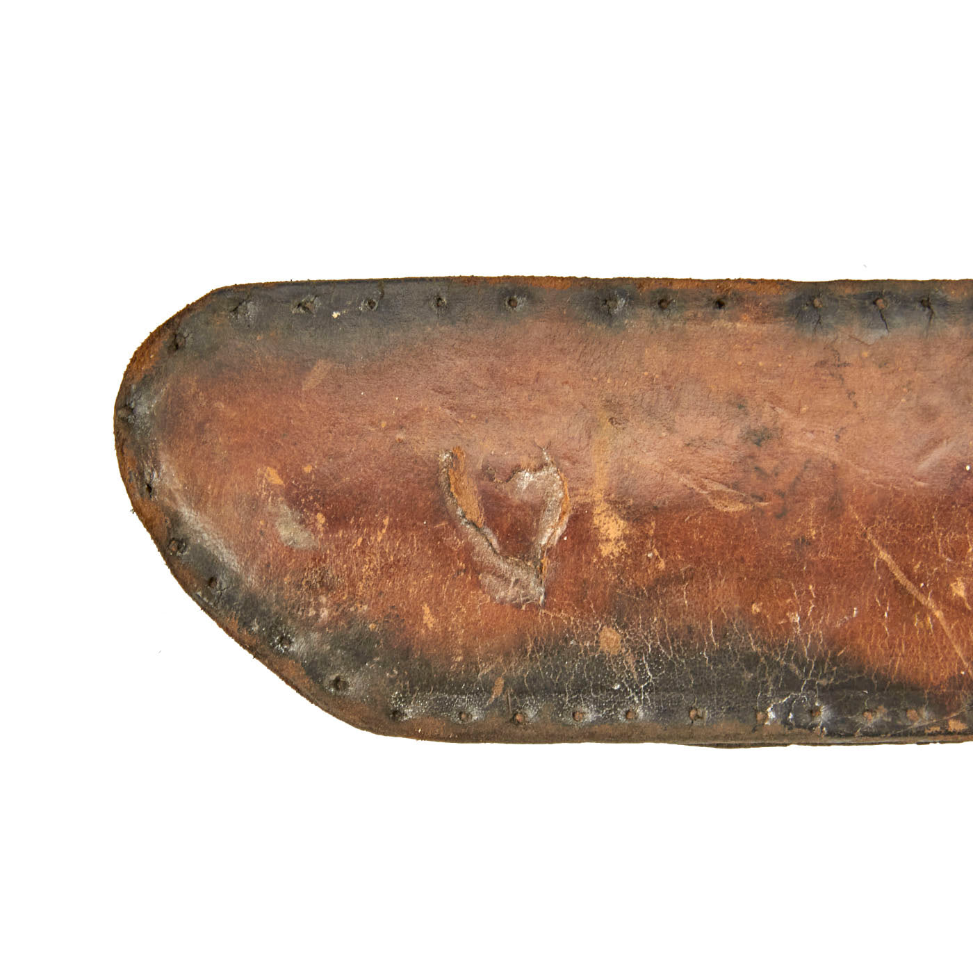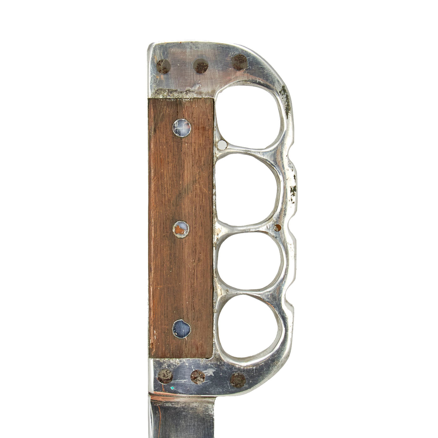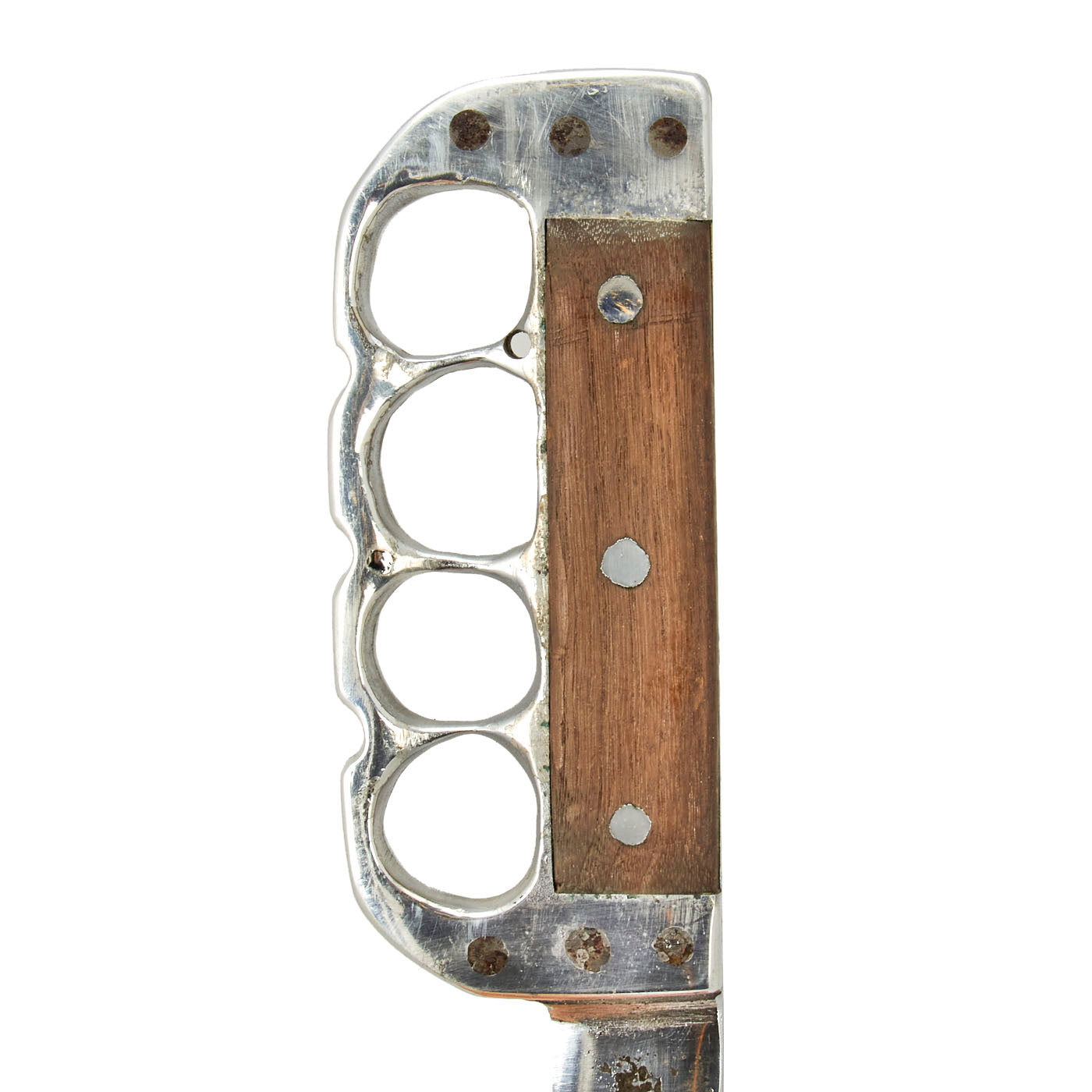 The knife features a double edged blade, sturdy construction and heavy cast aluminum knuckle grip. It has custom made wartime leather scabbard with belt hanger. The knife measures 13 ¼ inches in overall length with an approximately 8 inch blade. It is offered in very good condition with fantastic provenance.