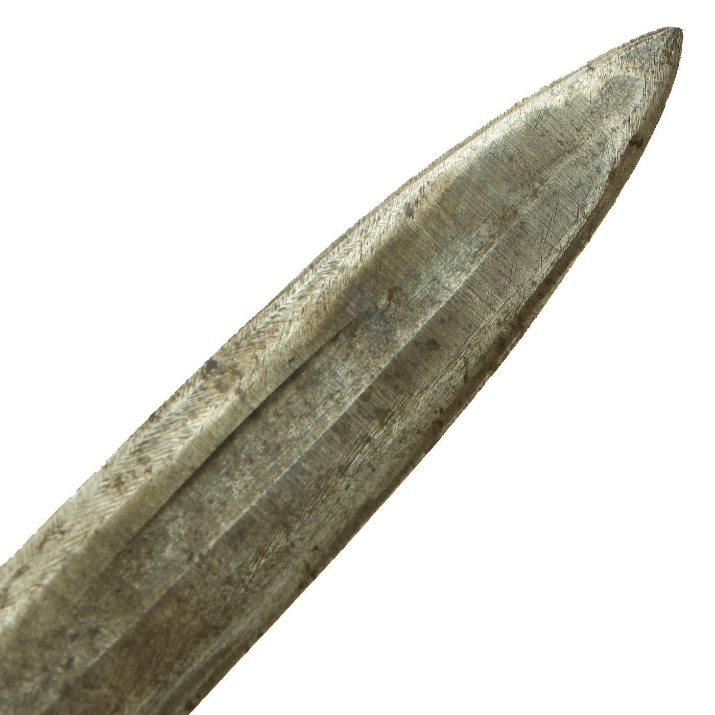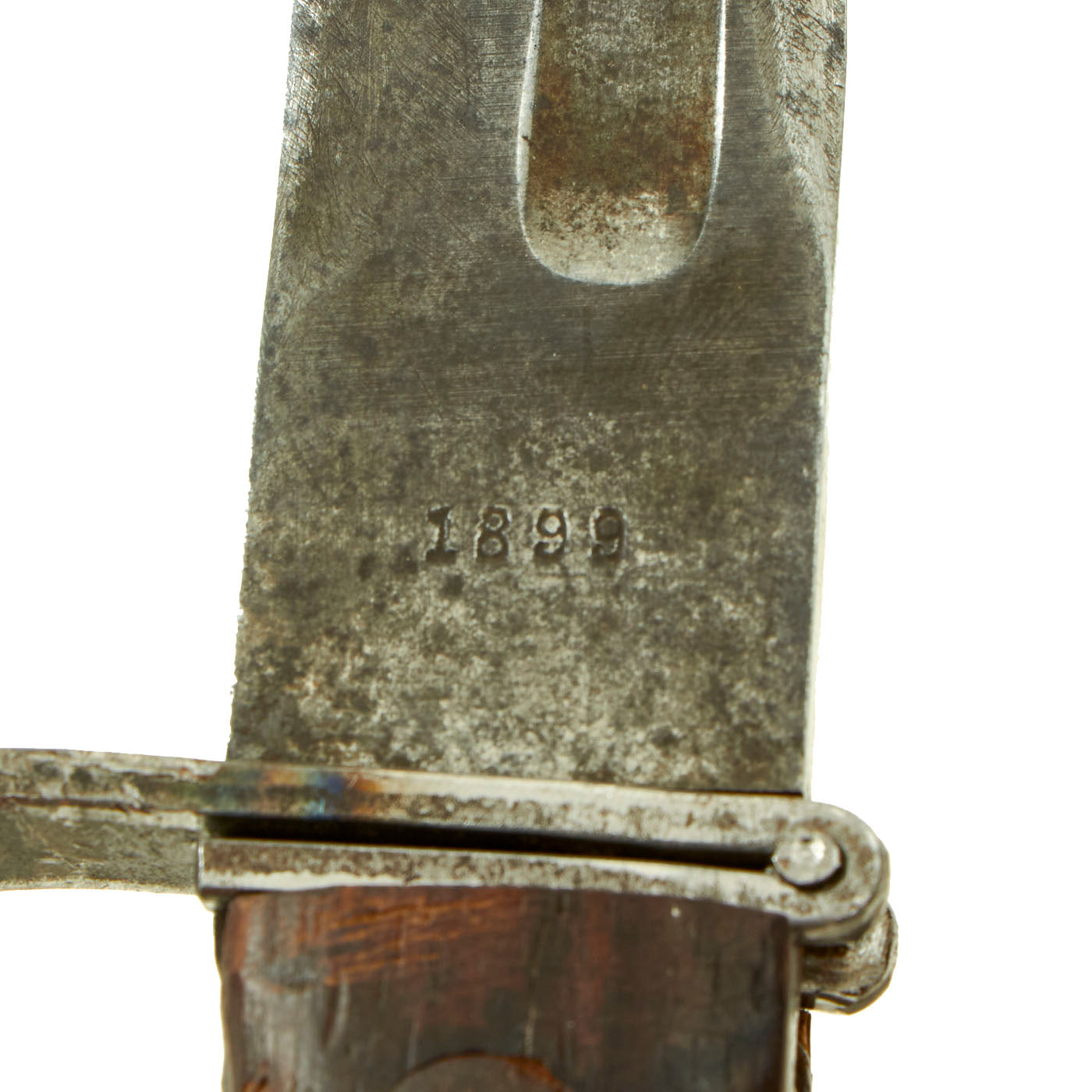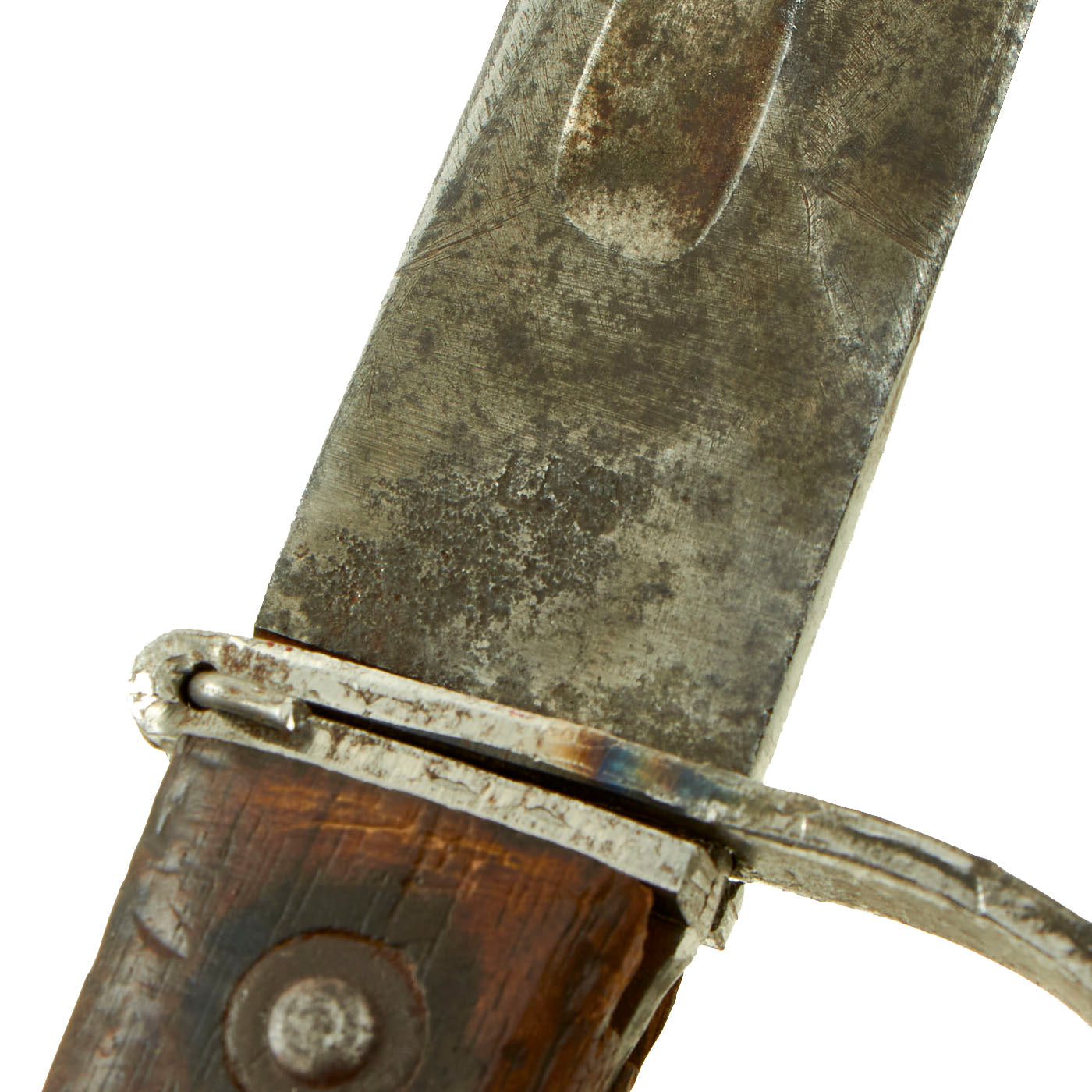 This knife is definitely an interesting example and was made from an already existing weapon as most were. This knife started its life out as a Krag Rifle Bayonet in 1899 but was cut down and had another edge sharpened on. This appears to be period made but the amount of cleaning and other indications are quite conflicting but due to how much the knife has been cleaned over the years, it makes it rather difficult in determining the age. The blade portion itself is still extremely sharp and does show signs of relatively recent sharpening.