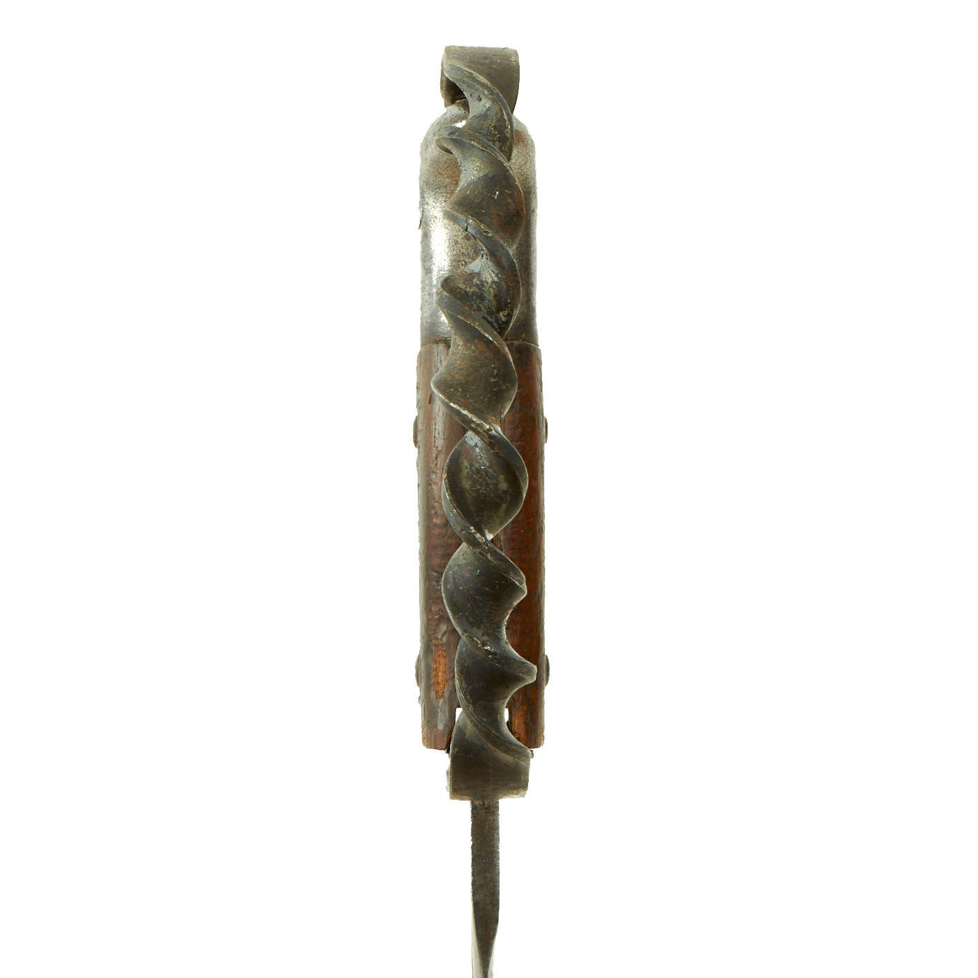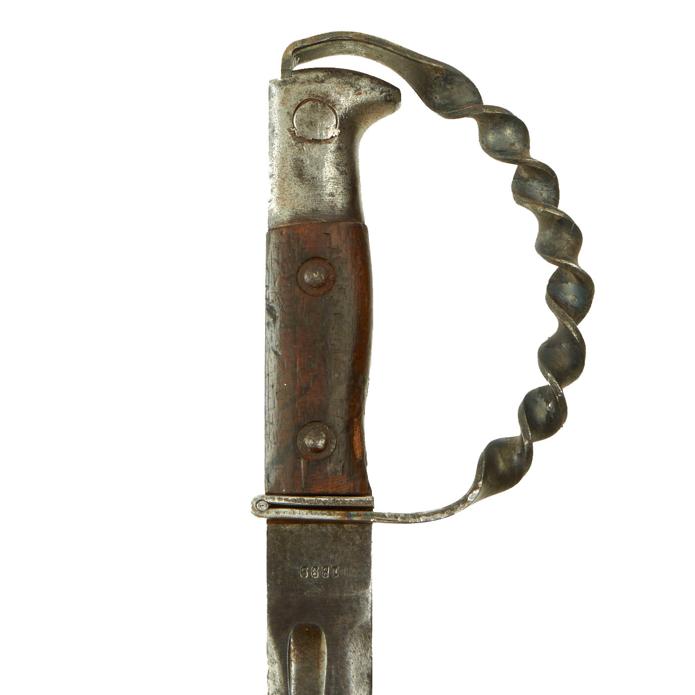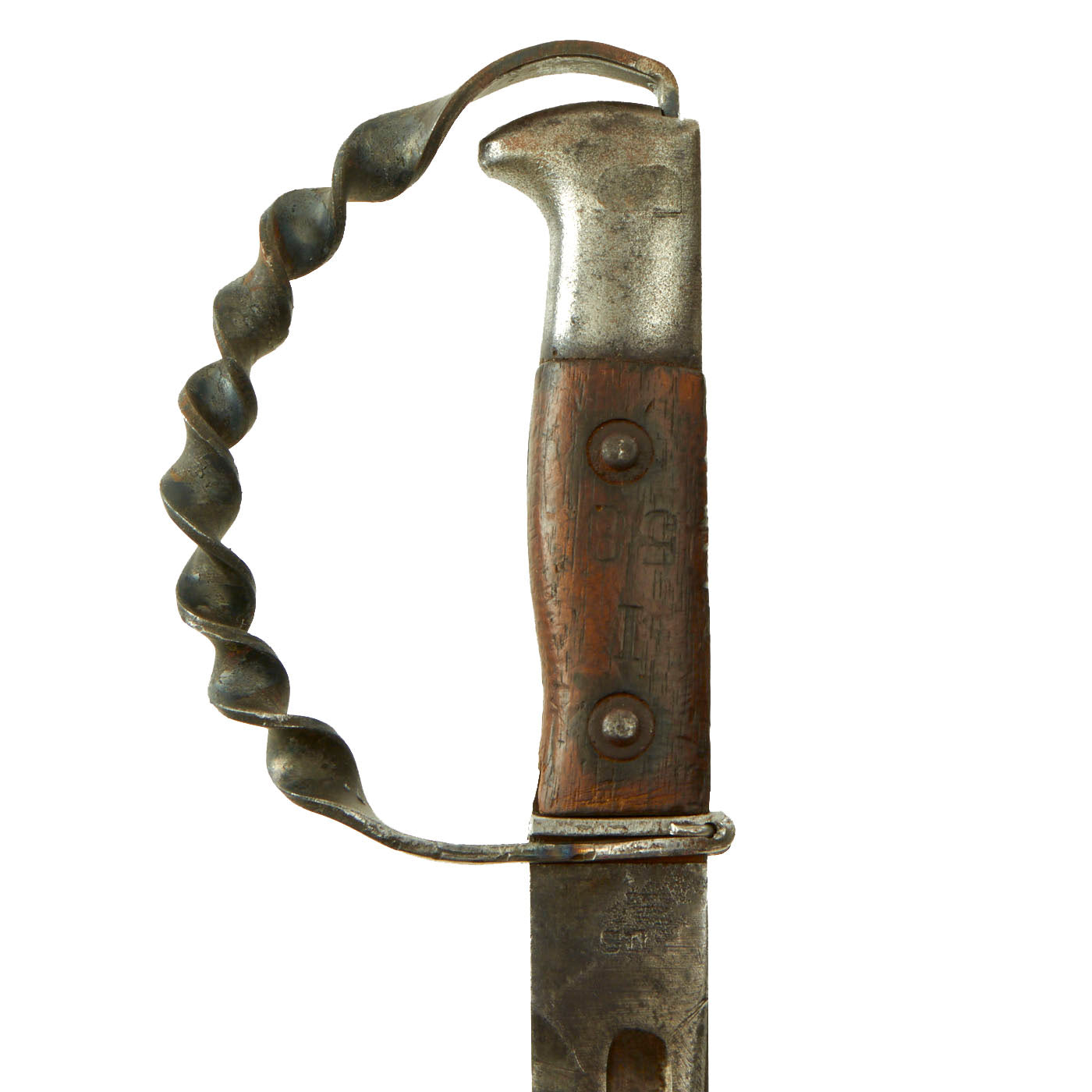 This knife is definitely an interesting example and was made from an already existing weapon as most were. This knife started its life out as a Krag Rifle Bayonet in 1899 but was cut down and had another edge sharpened on. This appears to be period made but the amount of cleaning and other indications are quite conflicting but due to how much the knife has been cleaned over the years, it makes it rather difficult in determining the age. The blade portion itself is still extremely sharp and does show signs of relatively recent sharpening.